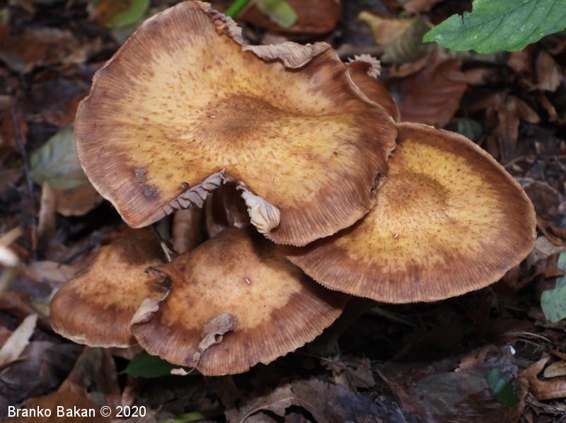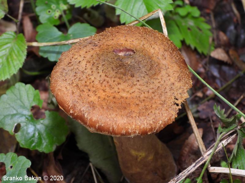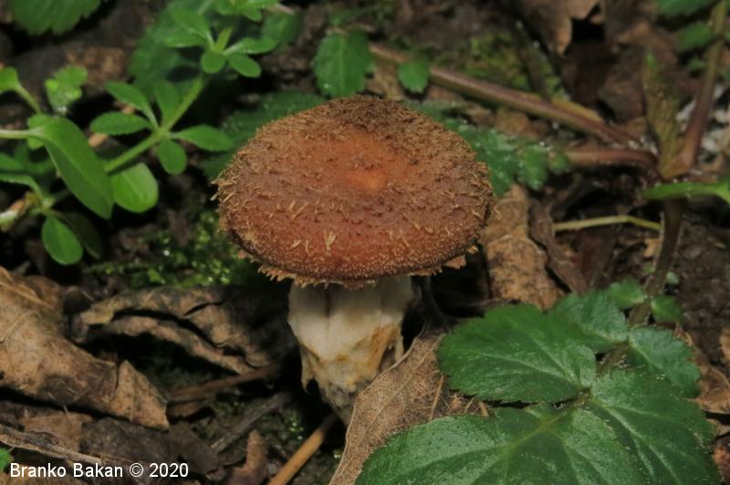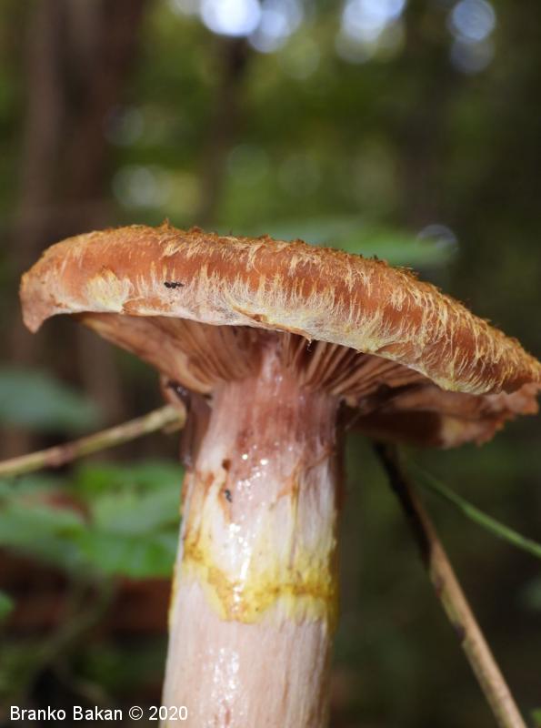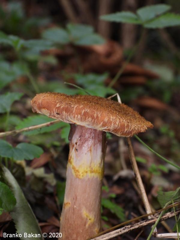 Opis: klobuk je sprva polkrožen, kupolast, kasneje se razpre in je dežnikast, rahlo koničast ali sploščen, večinoma rumeno- ali rdečerjav, gosto porasel z rjavkastimi, vlaknatimi luskami (zato navidezno dlakav), ki so koncentrično razvrščene (s staranjem izginjajo), rob klobuka je pri mladih trosnjakih spodvihan, kasneje se zravna. Spodnja stran klobuka s trosovnico je gosto porasla z belimi, kasneje rjavkastimi lističi, predvsem v mladosti so pokriti z belo kopreno, ki pokriva tudi zgornji del beta. Ta je kijast, v spodnjem delu čebulasto razširjen, sprva belkast, kasneje rjavkast ali olivnorjav, z opnastim, belim ali rumenkastim obročkom in številnimi luskami ter rumenimi ali oranžnimi prečnimi kosmičastimi grebenčki. Meso je rjavkasto, s prijetnim vonjem.