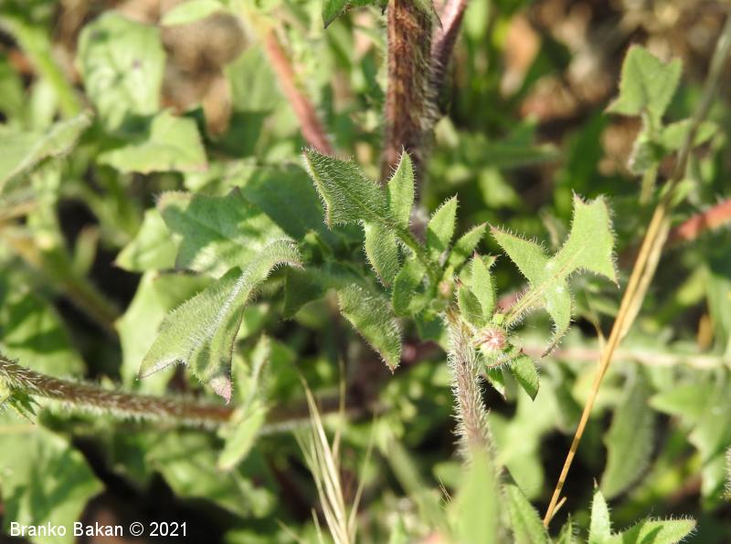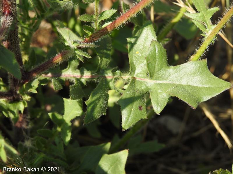 Opis: pokončna, delno razrasla, štrlečedlakava enoletnica ali dvoletnica s pritlično listno rozeto. Listi so podolgasto suličasti, pernato deljeni v ozko trikotne, nazobčane ali nacepljene roglje, gosto sivkasto štrlečedlakavi, togi. Koški so posamični, na dolgih, štrlečedlakavih pecljih (cvetni popki pogosto z navzdol ukrivljenimi peclji), valjasti, sestavljeni iz rumenih, jezičatih cvetov (obrobni cvetovi so po zunanji strani pogosto rdečkasti). Ovojkovi listi so togo štrlečedlakavi, pogosto rdečkasto obarvani, ozkosuličasti, nameščeni v dveh redeh, zunanji listi so nekje 2/3 tako dolgi kot notranji listi, večinoma vstran štrleči. Plod je nad 1 cm dolg, ozko podolgovat orešek (rožka), ki je podaljšan v dolg, ozek kljunec, na vrhu s kodeljico (reducirani čašni listi) iz enostavnih, belih laskov.