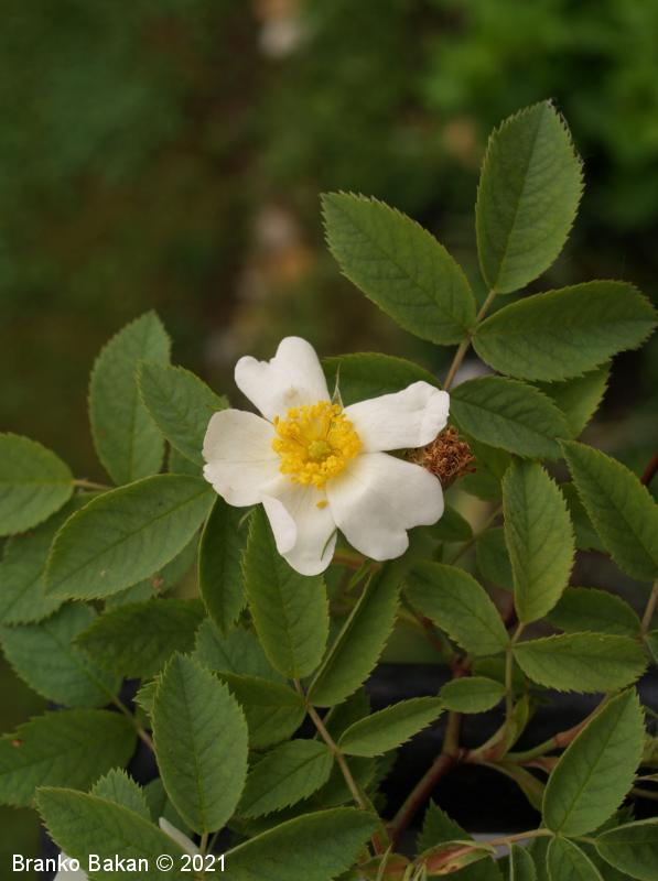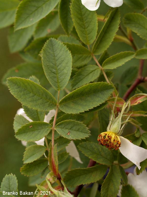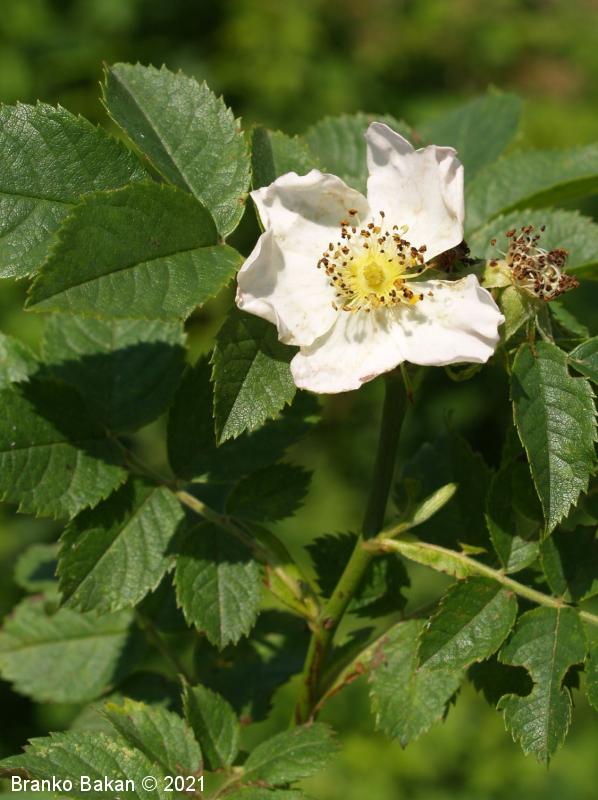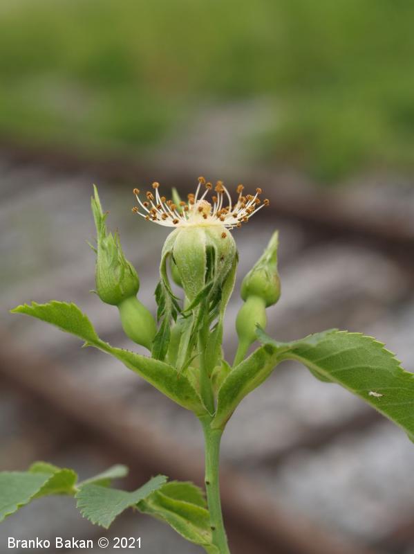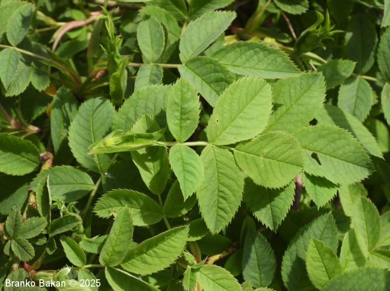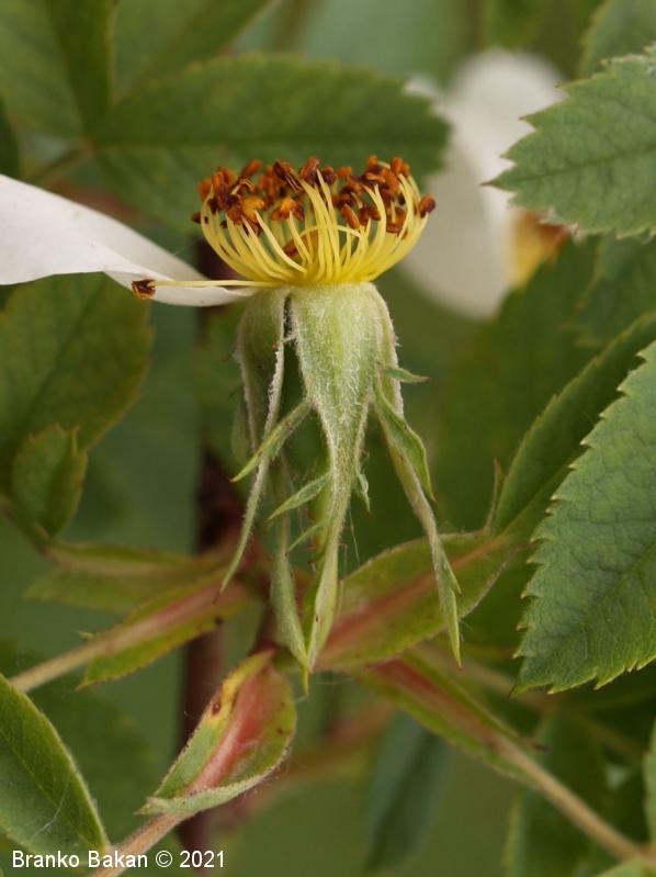 Opis: precej razrasel grm. Večletni poganjki so večinoma lokasto ukrivljeni, šibasti, večinoma goli (mladi poganjki so pogosto puhastodlakavi), porasli s krepkimi, ukrivljenimi trni. Listi so sestavljeni iz 3 do 7 jajčastih, sedečih lističev, ki so po robu enkrat ostro nazobčani (vrhovi zobcev so pogosto žlezasti), po zgornji strani večinoma temnozeleni in pogosto bleščeči, po spodnji strani in pecljih puhastodlakavi, brez žleznih laskov ali kvečjemu z redkimi žlezami. Cvetni peclji so večinoma goli ali porasli s pecljatimi žlezami. Cvetovi so 3-5 cm široki, bledorožnati ali beli, skoraj nedehteči, s številnimi prašniki in pestiči, katerih brazde so razvrščene v kompakten stebriček. Vsaj nekateri čašni listi so pri dnu pernato nacepljeni ali deljeni v ozke roglje, dlakavi, po odcvetu navzdol štrleči, kmalu odpadejo. Plod je sočen, (oranžno)rdeč, gladek, hruškast ali jajčast birni orešek s številnimi, dlakavimi semeni.