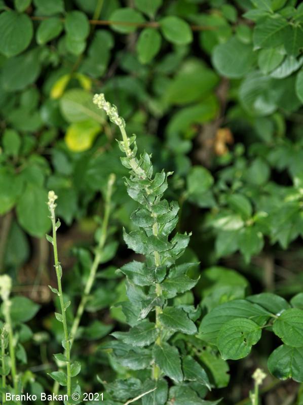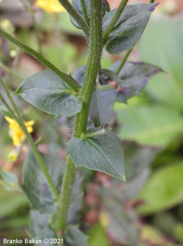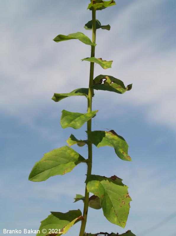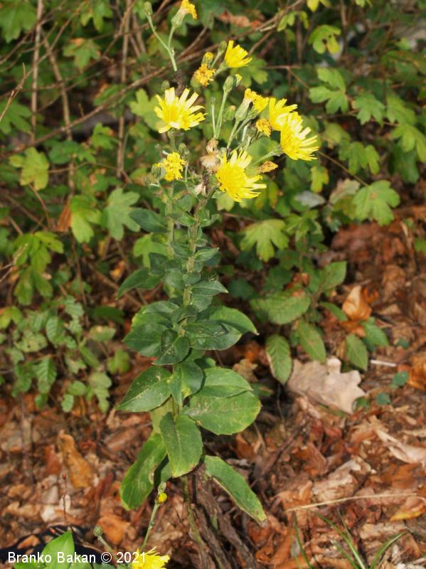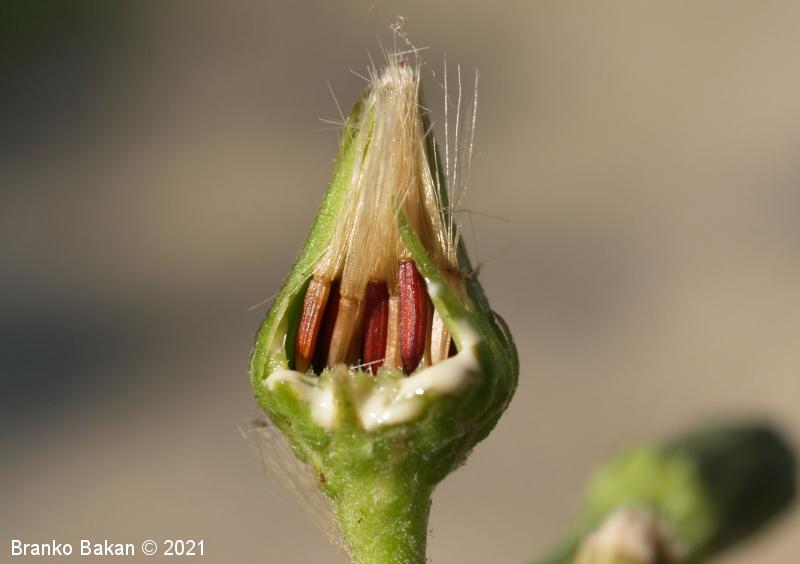 Opis: pokončna, gosto olistana in večinoma le pri vrhu razrasla trajnica z belim mlečkom in brez pritlične listne rozete. Stebelni listi se proti vrhu stebla postopno manjšajo, so široko jajčasti do suličasti, gosto dlakavi, sedeči, celorobi ali neenakomerno grobo nazobčani, včasih objemajo steblo. Koški so združeni v podaljšano grozdasto (latasto) socvetje, dolgopecljati, živorumeni, razviti so le jezičasti cvetovi. Ovojkovi listi, ki obdajajo koške, so goli, ozkočrtalasti, nameščeni v več redeh, zunanji so mnogo krajši od notranjih. Plod je svetlorjav orešek (rožka), ki ima na vrhu kodeljico (reducirani čašni listi) iz enostavnih, belih laskov.