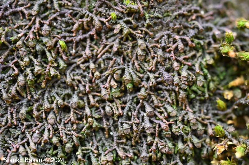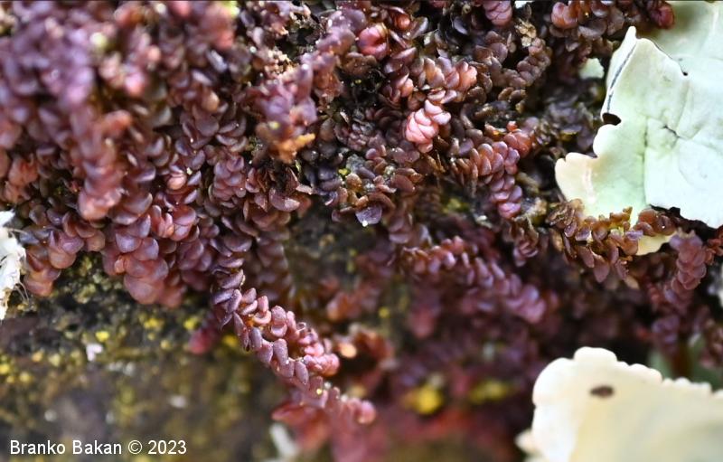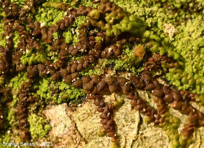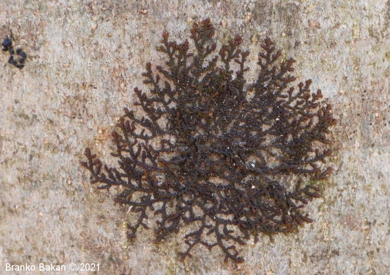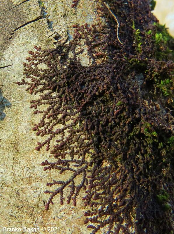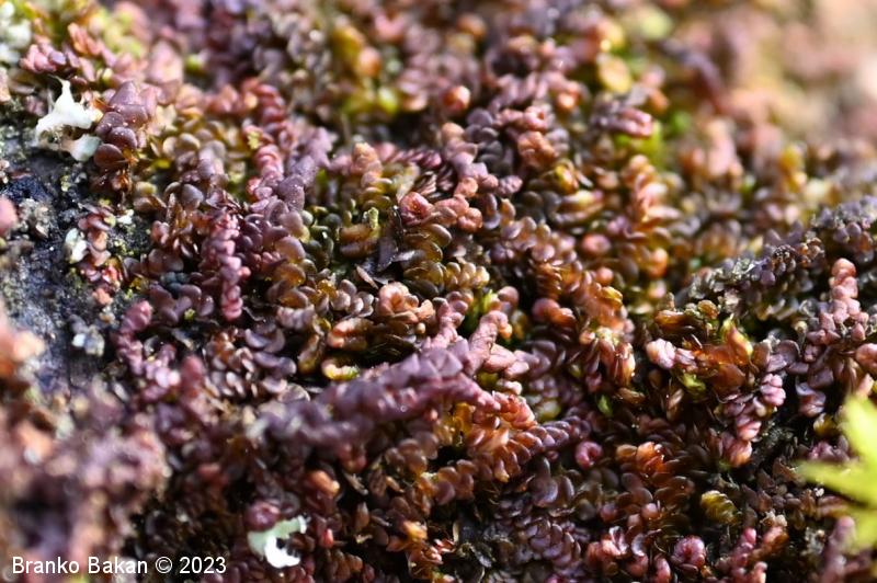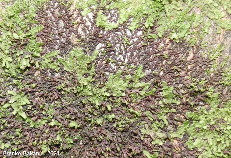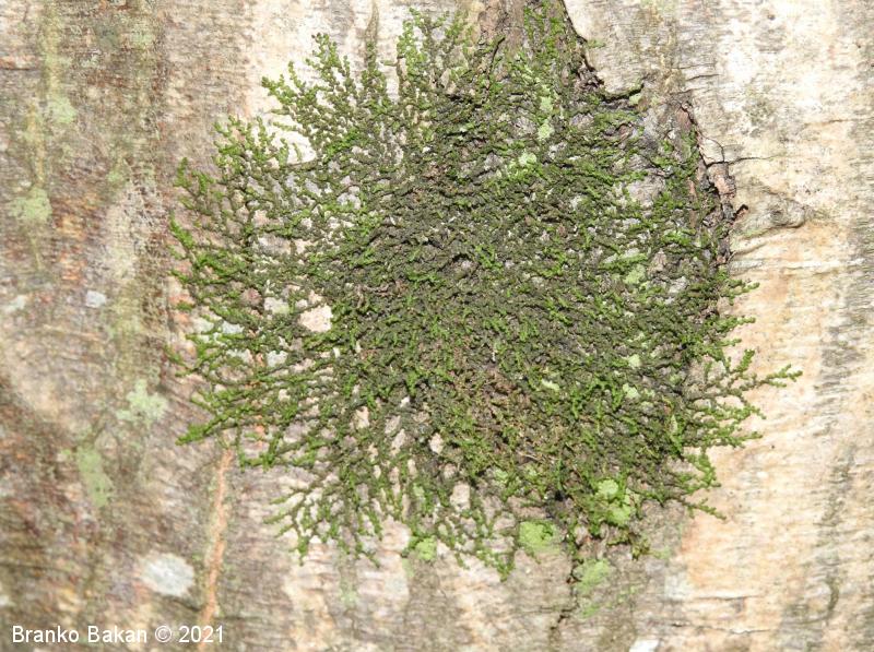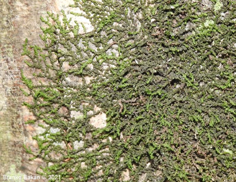 Opis: gametofit (spolna generacija) se plosko razrašča po podlagi (večinoma deblih), velikokrat se posamična stebelca vilasto razcepijo. Steljka je kompaktna, večinoma črno- do rjavordeča ali temno zelena, neenakomerno vilasto razvejana. Lističi so luskasti, dvojni: zgornji lističi so skoraj okrogli, pri vrhu rahlo koničasti in se plosko, delno prekrivajo, na spodnji strani z vrčasto oblikovano krpo (amfigastrij, ki zadržuje vodo), spodnji lističi so manjši, nacepljeni, prilegli ob poganjek. Ženski spolni organi (arhegoniji) se nahajajo v periantu oblikovani tvorbi na koncu steljke, ki je ploska in bradavičasta, moški spolni organi (anteridiji) se razvijejo v pazduhah lističev. Sporogon (trosonosna tvorba) je pecljat in se ob zrelosti zvezdasto razpoči na štiri dele.