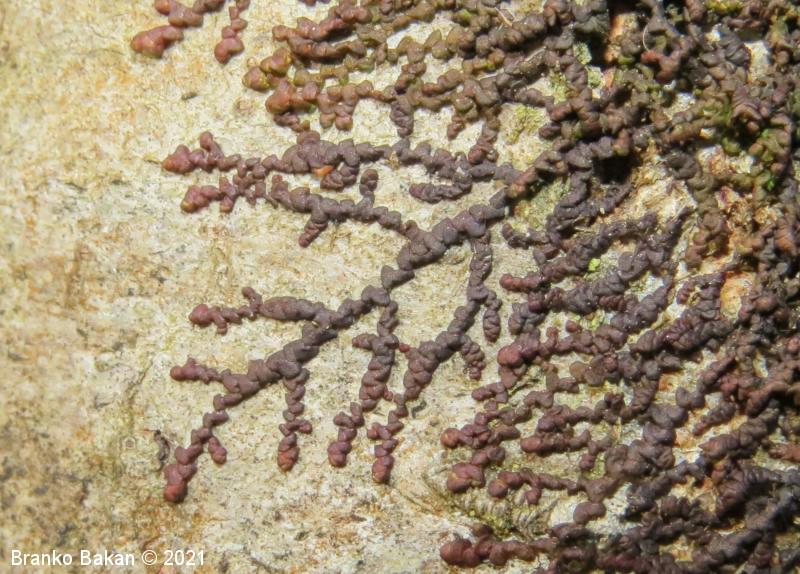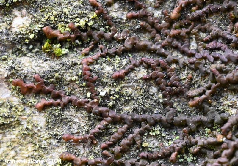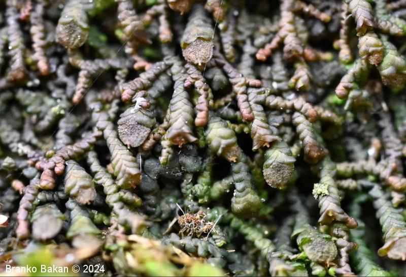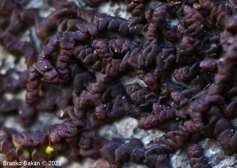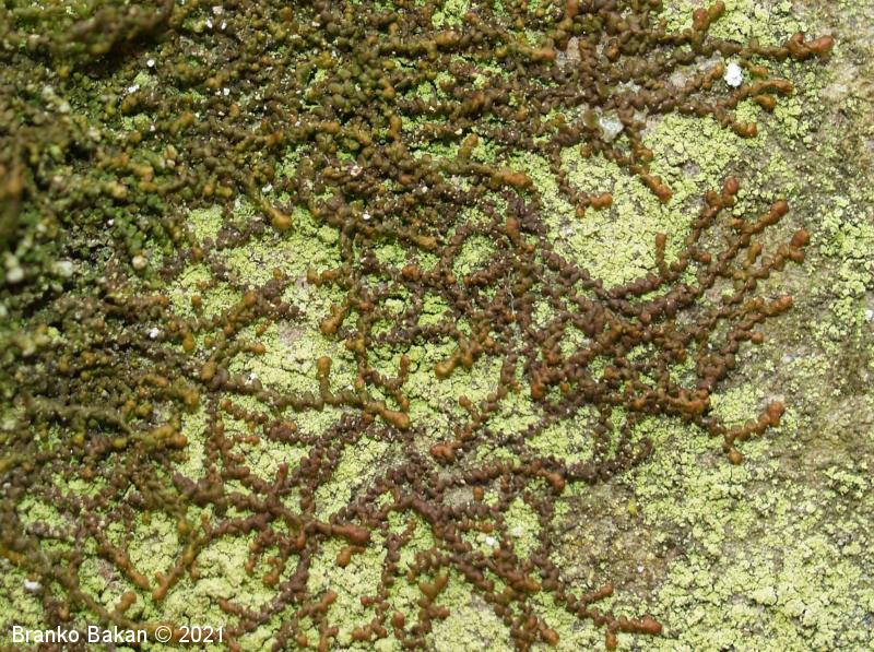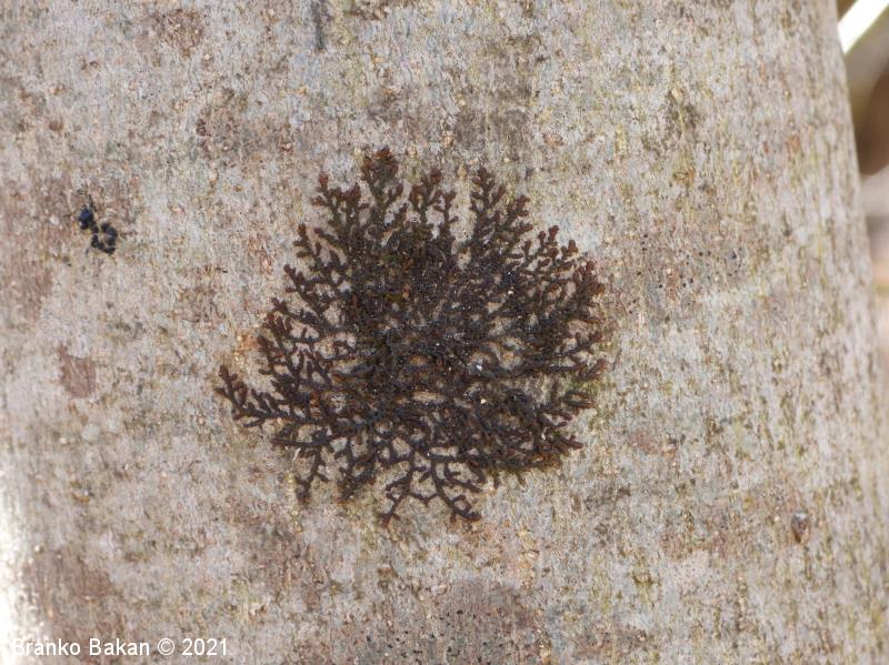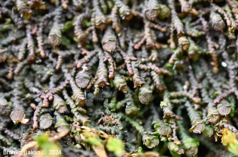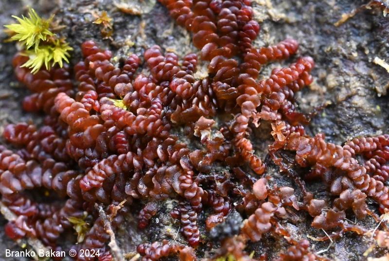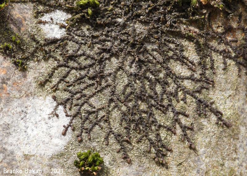 Opis: gametofit (spolna generacija) se plosko razrašča po podlagi (večinoma deblih), velikokrat se posamična stebelca vilasto razcepijo. Steljka je kompaktna, večinoma črno- do rjavordeča ali temno zelena, neenakomerno vilasto razvejana. Lističi so luskasti, dvojni: zgornji lističi so skoraj okrogli, pri vrhu rahlo koničasti in se plosko, delno prekrivajo, na spodnji strani z vrčasto oblikovano krpo (amfigastrij, ki zadržuje vodo), spodnji lističi so manjši, nacepljeni, prilegli ob poganjek. Ženski spolni organi (arhegoniji) se nahajajo v periantu oblikovani tvorbi na koncu steljke, ki je ploska in bradavičasta, moški spolni organi (anteridiji) se razvijejo v pazduhah lističev. Sporogon (trosonosna tvorba) je pecljat in se ob zrelosti zvezdasto razpoči na štiri dele.
