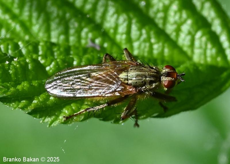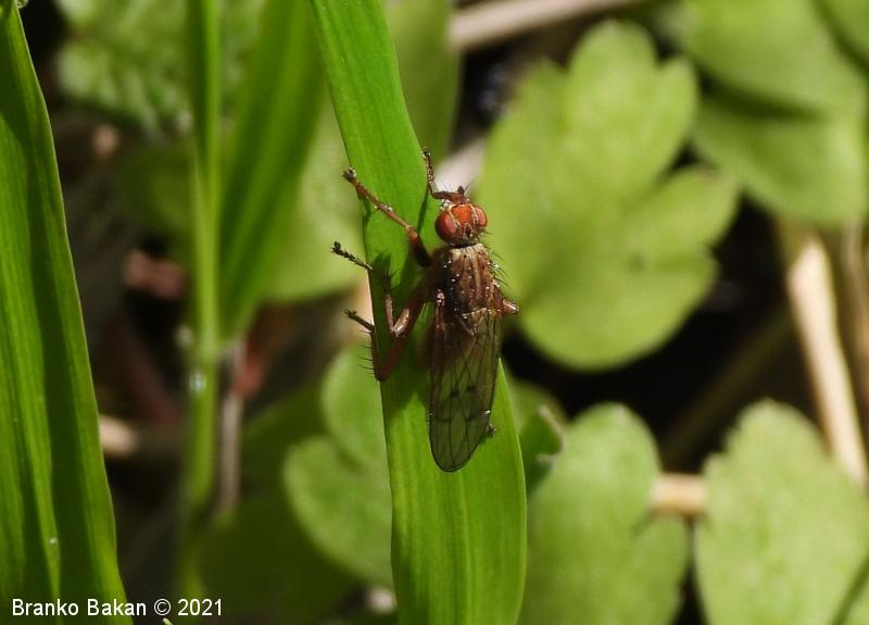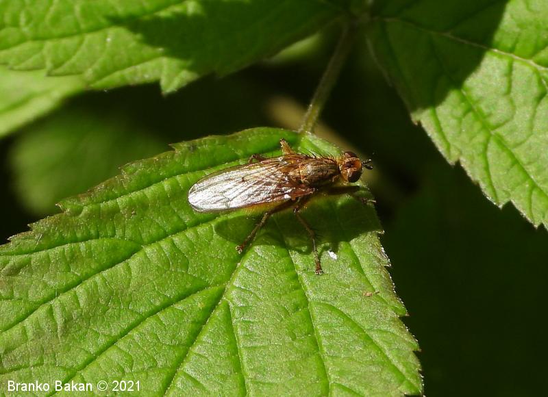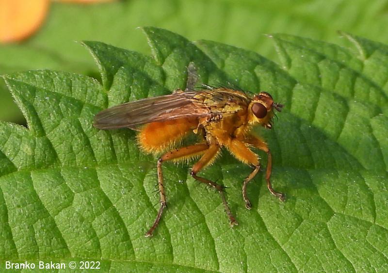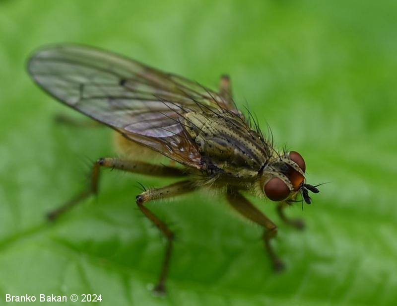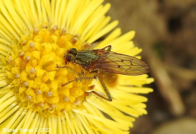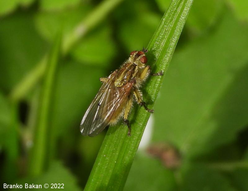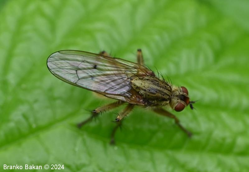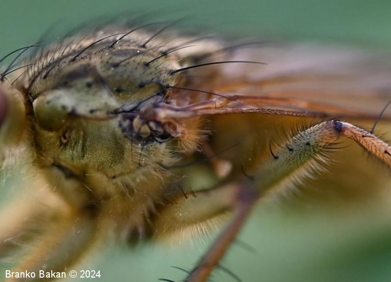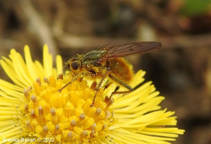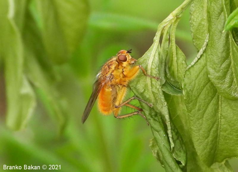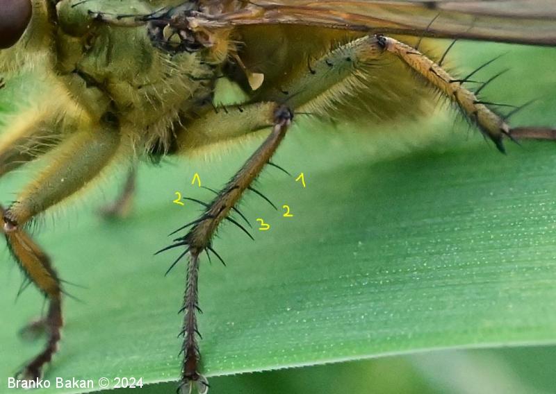 Odrasli osebki: samce prepoznamo po rumeni obarvanosti telesa, samice so bolj sivkaste do zelenkaste in so manj porasle z dlakami. Pri samcih je glava rumenkasta, z veliko, rdečkasto, nacepljeno liso na temenskem delu, ki je pri samicah manj izrazita. Tipalnice so na vrhu betičaste, črne, ariste (nitasti izrastki) so peresaste. Oprsje je temno vzdolžno pasasto, poraslo s črnimi, ščetinastimi dlakami. Krila so prosojna, podolgasta, z drobnima, temnima lisama v osrednjem delu. Zadek je dokaj krepek, gostodlakav, rumen. Noge so rumenkaste, na zadnjih parih nog se poleg kratkih, mehkih dlak nahajajo toge, trnate, črne ščetine (še posebej na srednjih golenih je teh ščetin z notranje in zunanje strani več), sprednje goleni imajo 2 posteroventralni ščetini in 3 krepke anteroventralne ščetine.