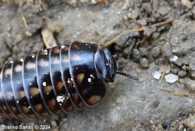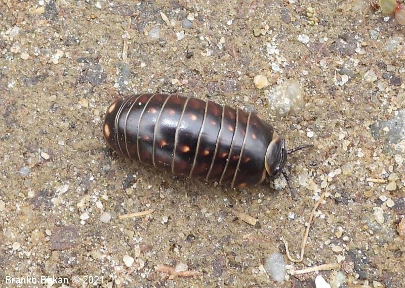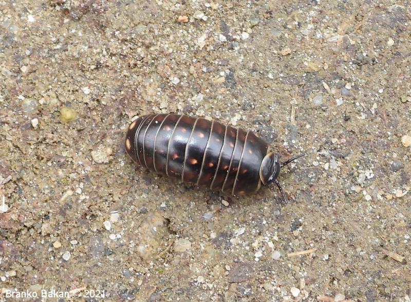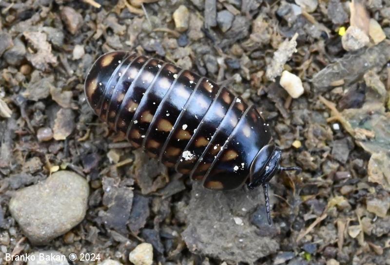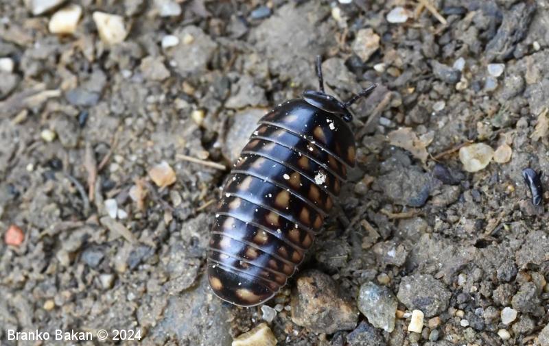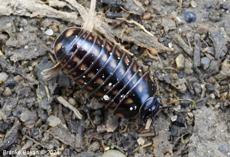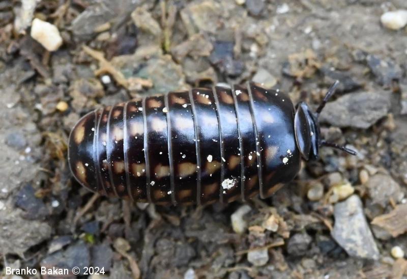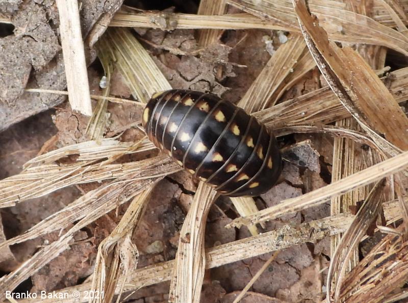 Odrasli osebki: telo je kratko, čokato, velinoma temnorjavo z oranžnimi ali rumenimi lisami, sestavljeno iz 12 cilindričnih segmentov, ki so večinoma paroma med seboj zrasli in imajo po dva para kratkih, hodilnih nog. Glava je orientirana navzdol, na njej so drobne, pikčaste oči in tipalnice. Tik za glavo se nahaja majhen, ščitast segment imenovan vrat (kolum), ki ima en par nog in je svetlo obrobljen. Drugi segment (tergit) je močno povečan, ostali segmenti so manjši od njega, vsi so svetlo obrobljeni, vzdolž njih pa poteka šest prekinjenih pasov lis. Najbolj zunanje (marginalne) lise so večinoma dobro izražene, v obrisu trikotne ali okrogle, osrednje lise so prav tako velike, lahko so dobro izražene ali so zabrisane, obhrbtne (subdorzalne) lise so večinoma trikotne, dobro izražene in so precej velike. Po sredini hrbtišča pogosto poteka še ena linija temnejših dorzalnih lis, ki pa so pogosto zabrisane. Končni segment (preanalni tergit) je polkrožen, z dvema svetlima lisama, med katerima je pogosto temnejša črta. Vrsta je precej variabilna!