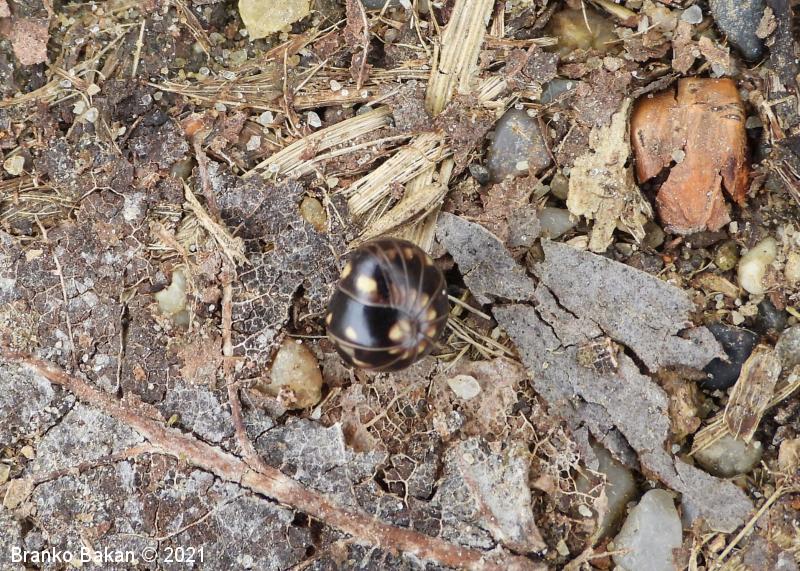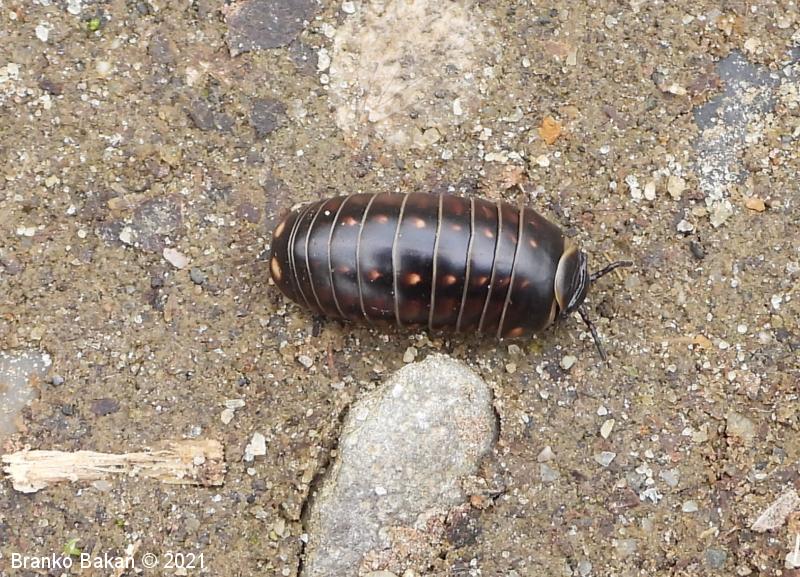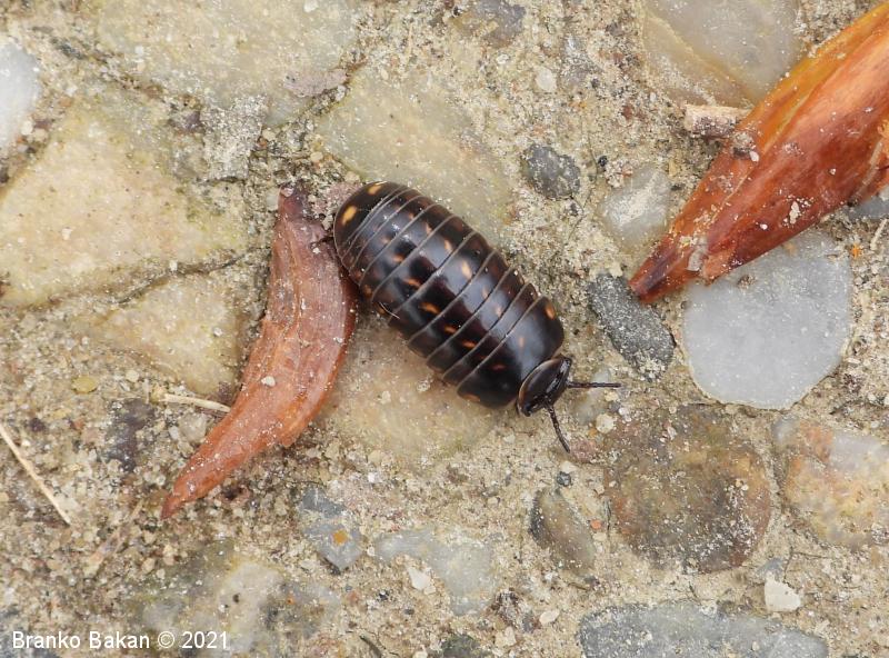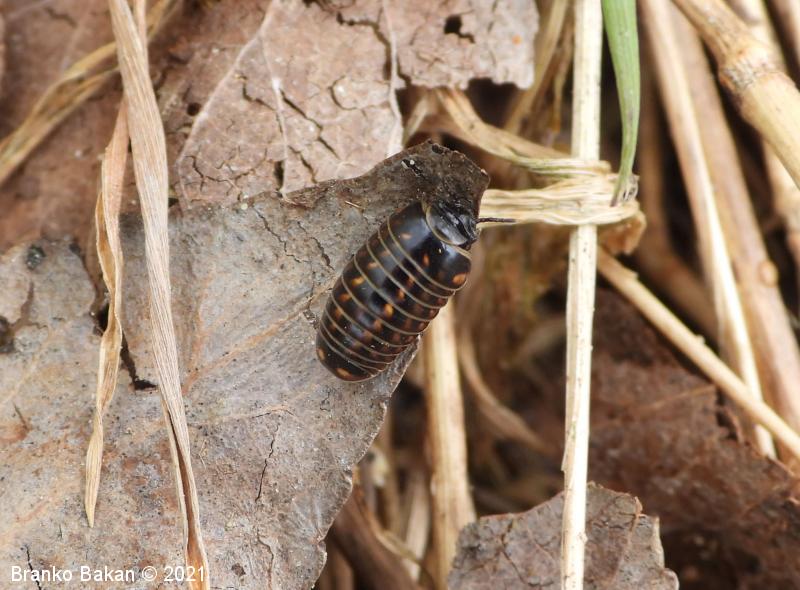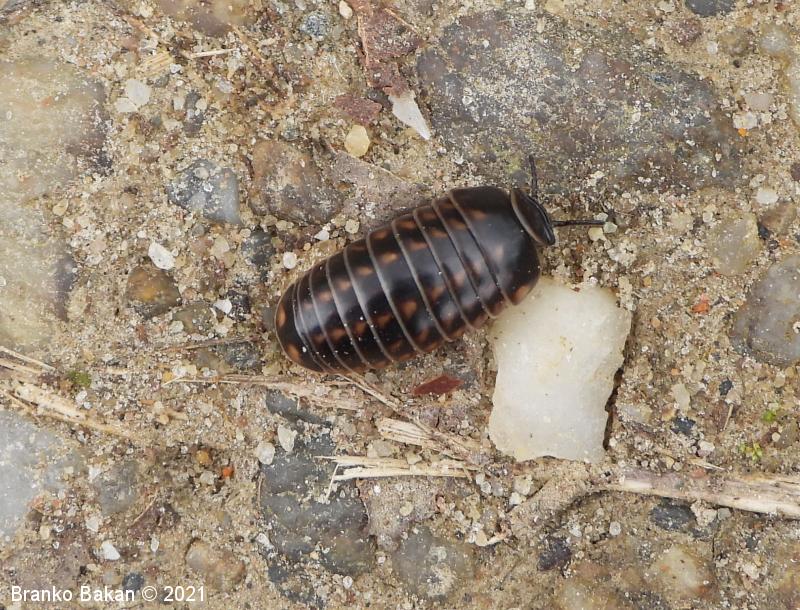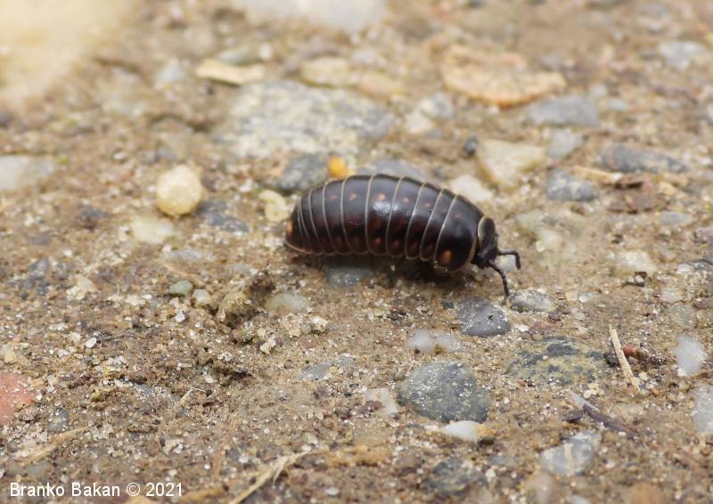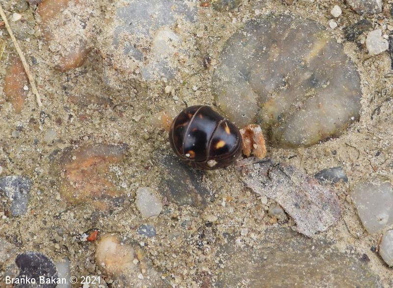 Odrasli osebki: telo je kratko, čokato, velinoma temnorjavo z oranžnimi ali rumenimi lisami, sestavljeno iz 12 cilindričnih segmentov, ki so večinoma paroma med seboj zrasli in imajo po dva para kratkih, hodilnih nog. Glava je orientirana navzdol, na njej so drobne, pikčaste oči in tipalnice. Tik za glavo se nahaja majhen, ščitast segment imenovan vrat (kolum), ki ima en par nog in je svetlo obrobljen. Drugi segment (tergit) je močno povečan, ostali segmenti so manjši od njega, vsi so svetlo obrobljeni, vzdolž njih pa poteka šest prekinjenih pasov lis. Najbolj zunanje (marginalne) lise so večinoma dobro izražene, v obrisu trikotne ali okrogle, osrednje lise so prav tako velike, lahko so dobro izražene ali so zabrisane, obhrbtne (subdorzalne) lise so večinoma trikotne, dobro izražene in so precej velike. Po sredini hrbtišča pogosto poteka še ena linija temnejših dorzalnih lis, ki pa so pogosto zabrisane. Končni segment (preanalni tergit) je polkrožen, z dvema svetlima lisama, med katerima je pogosto temnejša črta. Vrsta je precej variabilna!