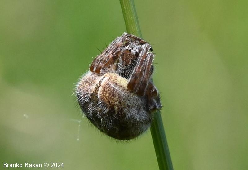 Samica: zelo variabilno obarvana (tudi do 5 različno obarvanih različic znotraj ene generacije!). Večinoma prevladujejo rumeno-, sivo- ali rdečerjavo obarvani osebki z izrazitejšim osrednjim vzorcem na precej velikem, jajčastem zadku. Vzorec je lahko preprost, le kot pasasta ali široko zaobljena črna, svetlo obrobljena lisa, ali je kompleksnejši in je v obliki "cik-cakaste" osrednje temnejše linije, ob kateri so na zadnjem delu obstranske, ravne lise, vse so svetlo obrobljene, pogosto pa sta na bazalnem delu zadka dve veliki, beli lisi za katerima se nahaja vzorec trikotno razporejenih prečnih črt. Noge so rjavkasto pasaste, precej dolge in krepke.