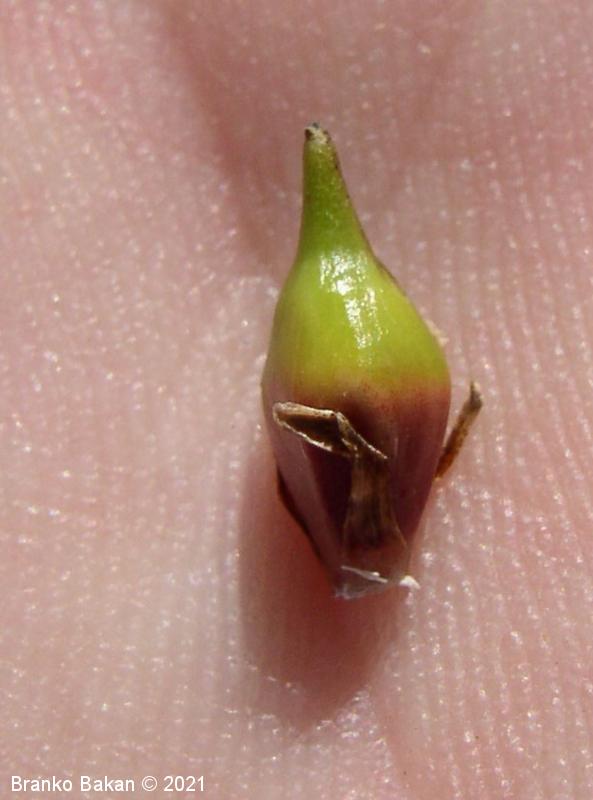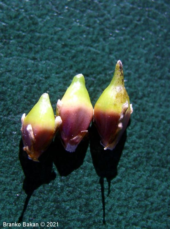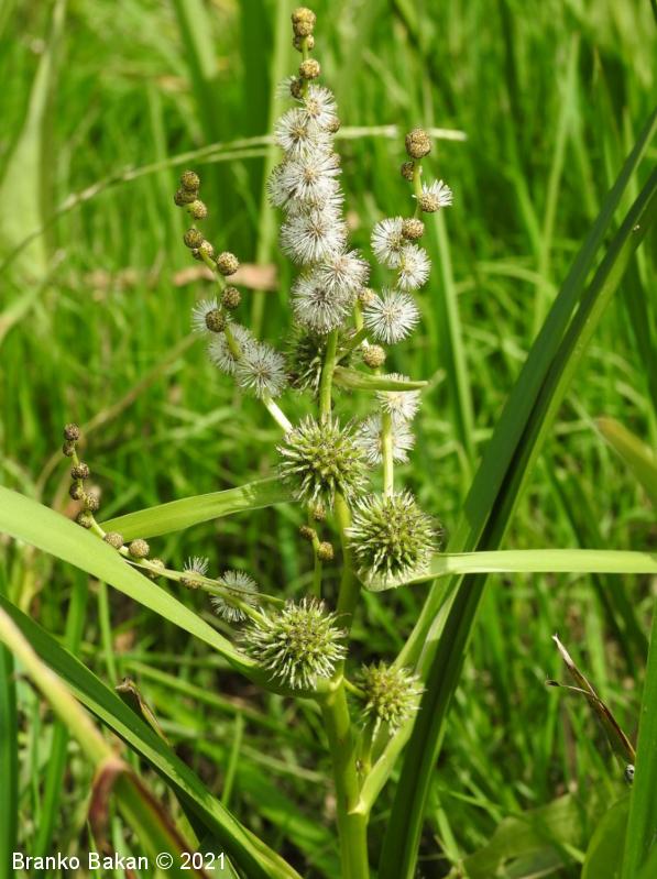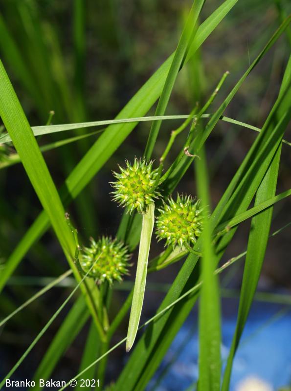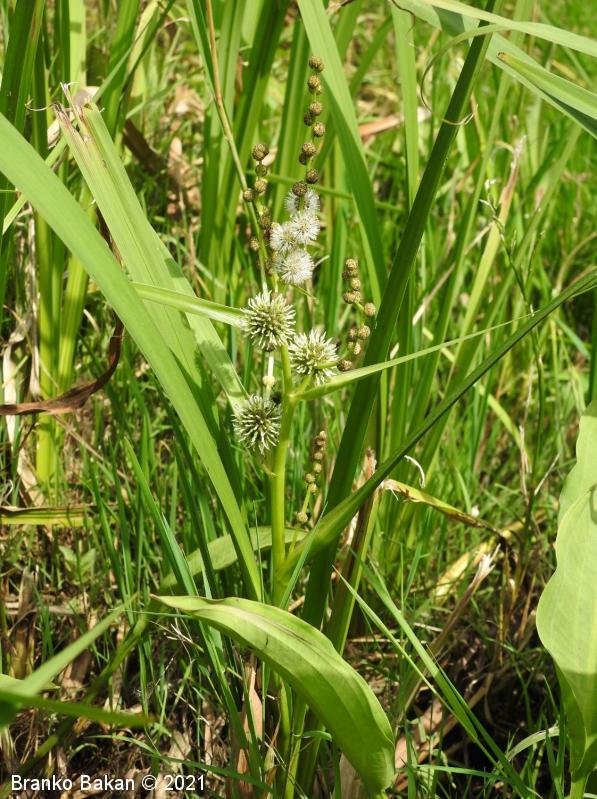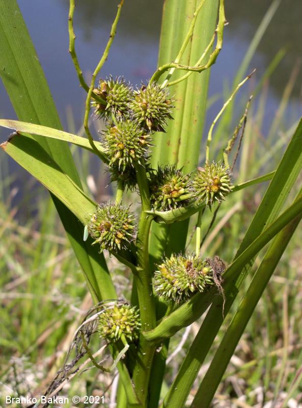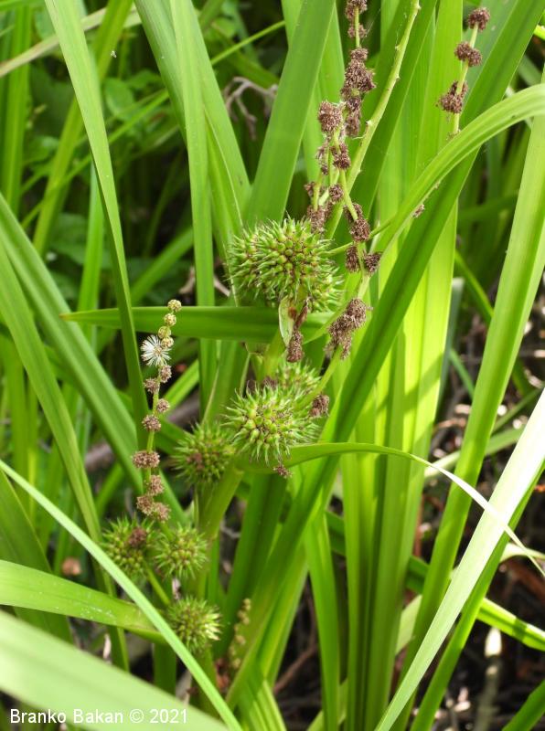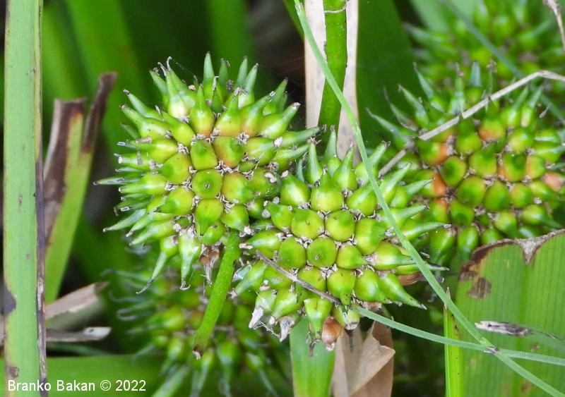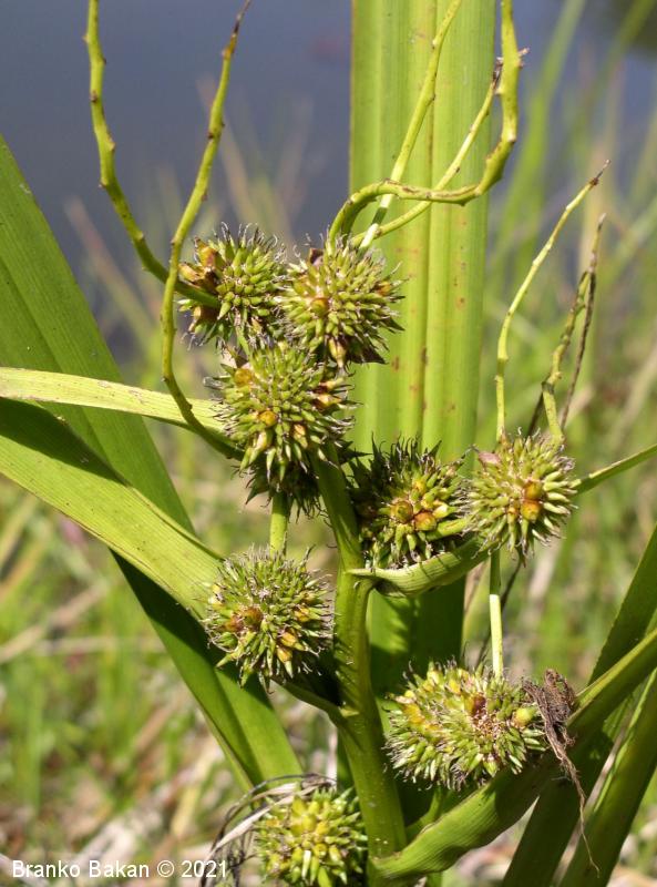 Opis: pokončna, gola trajnica s pritlikami in z razraslim steblom v cvetni regiji. Listi so enostavni, črtalasti, premenjalno razvrščeni, pokončno štrleči, v spodnjem delu v prerezu trikotni, plitvo žlebasti, proti vrhu ploski in kratko koničasti. Cvetovi so enospolni, zgoščeni v klobčasta socvetja na stranskih poganjkih, na vrhu so moška socvetja, s številnimi rumenimi prašniki, pod njimi so ženska socvetja s številnimi pestiči. Socvetja so med seboj razločno odmaknjena. Zrel plod je (koščičast) orešek, zgoščen v ježkasto soplodje, v obrisu je podolgasto suličast, zgornji del je temnozelen ali rjavkast in postopno preide v koničast kljunast vrh, spodnji del je bledikast in zožen, večinoma gladek.