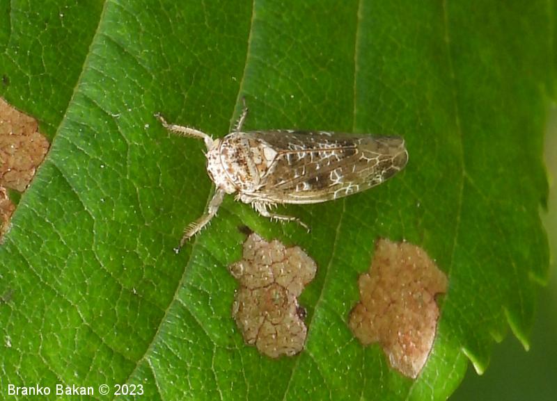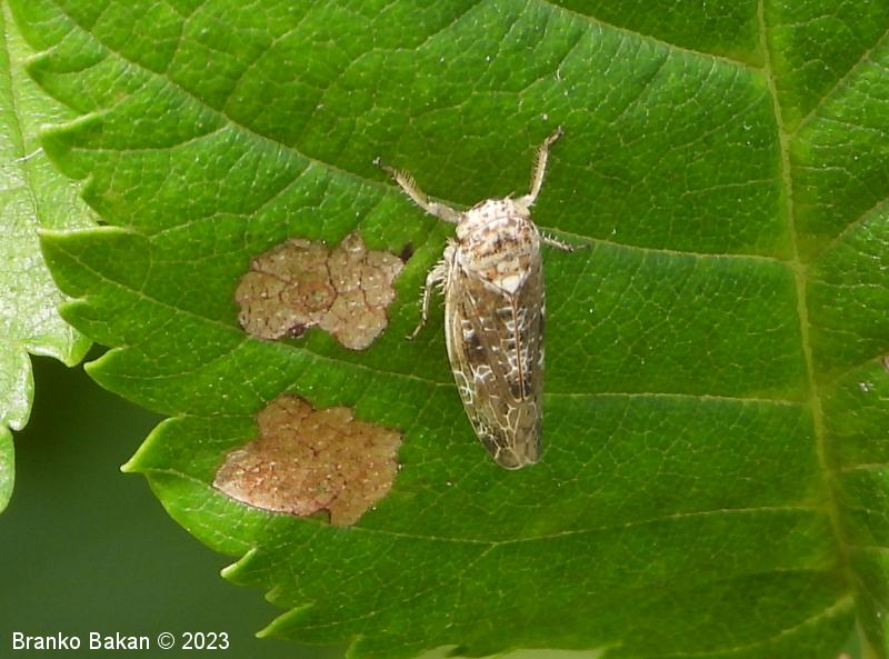 Odrasli osebki: telo je sivo- ali rdečerjavo marmorinano, belo ožiljeno. Glava in oprsje sta ploski, precej široki. Oči so velike, večinoma rjavkaste. Oprsje je temno lisasto, sicer svetlo z rjavkastim vzorcem, široko. Ščitek (scutellum) je svetel, široko trikoten, s trnato podaljšanimi konicami. Krila so v mirovanju vzdolžno strehasto položena ob telo in na koncu rahlo usločena, temno-svetlo pisana, z belo obrobljenimi žilnimi celicami (predvsem v apikalnem delu). Noge so trnato nazobčane (predvsem po zunanjem delu zadnjih goleni), svetle.