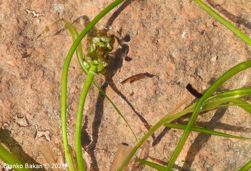 Opis: pri dnu pritrjena vodna trajnica. Steblo je plosko stisnjeno, tako široko ali ožje kot listi, ki izraščajo pri dnu listne nožnice. Listi so ozkočrtalasti, podolgasti (3-10 cm dolgi), na vrhu dolgo priostreni in ostnato podaljšani, 1.5-5 mm široki, s 3-5 večjimi žilami (osrednja žila je svetla in pogosto najbolj izstopa), med katerimi so tanjše, vzdolžne žile. Socvetje je strnjeno klasasto, sestavljeno iz 4-6 cvetov, na dolgem peclju, ki je pod socvetjem rahlo odebeljen. Cvetovi so zelenkastorjavi, brez pravega cvetnega odevala, večinoma s priveski. Plod je trebušasto zaobljen orešek.
