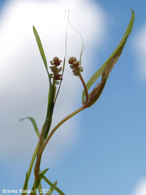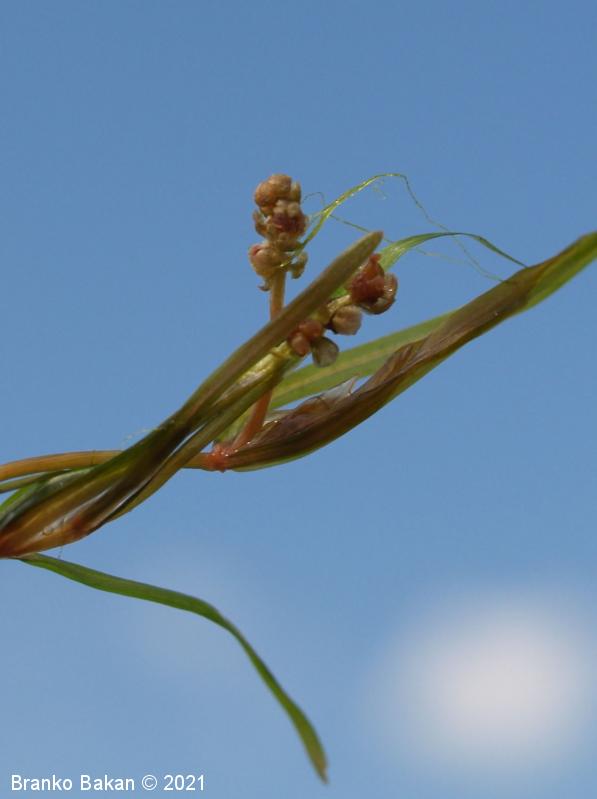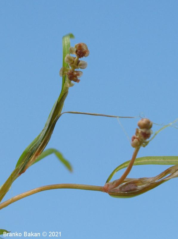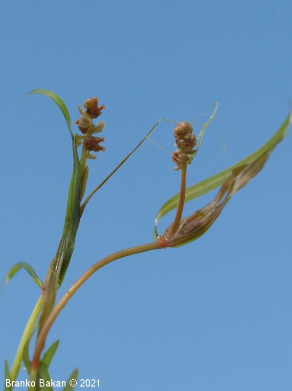 Opis: pri dnu pritrjena vodna trajnica. Steblo je tanko, v prerezu rahlo stisnjeno (z oblimi robovi). Listi so ozkočrtalasti, podolgasti (2-8cm dolgi), na vrhu ostro koničasti, 0.3-1 mm široki, z dobro vidno osrednjo žilo in manj izrazitima stranskima žilama, izraščajo iz dna listne nožnice, ki je podolgasta, cevasto obdaja steblo (le v spodnjem delu zrasla). Socvetje je rahlo klasasto, sestavljeno iz 4-8 cvetov, dolgopecljato. Cvetovi so zelenkastorjavi, 4-števni, brez pravega cvetnega odevala, večinoma s priveski. Plod je orešek, ki je na eni strani raven, po drugi strani je trebušasto zaobljen in z izbrazdanim gredljem.