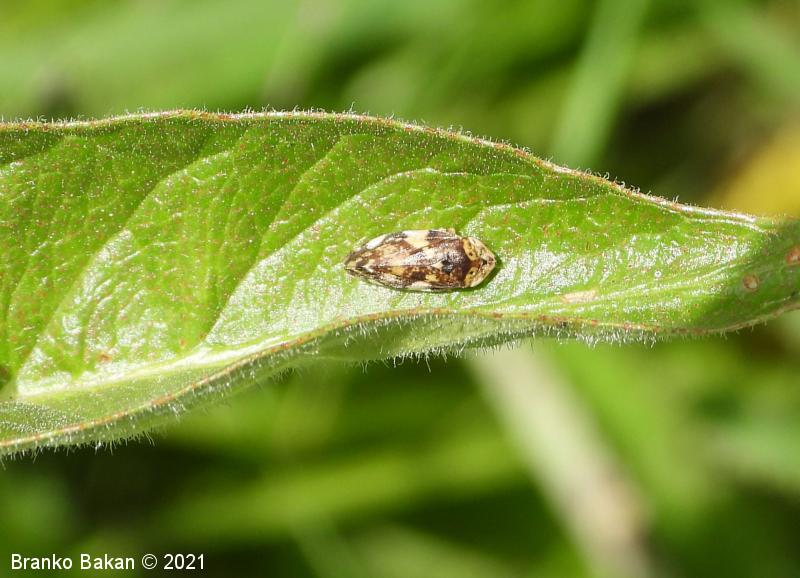Odrasli osebki: zelo variabilna vrsta z raznoliko obarvanostjo. Pojavljajo se svetlorjavo in sivorjavo obarvani osebki, a tudi zelo temno rjavi in lisasto obarvani osebki do skoraj črni. Glava je z zgornje strani plosko trikotna, ob spodnjem robu zaobljena, rahlo koničasta (nosata), z velikimi, obstransko nameščenimi očmi. Oprsje in ščitek (scutellum) sta ploska, po vrhu brez osrednjega gredlja. Pokrovke so podolgasto trikotne, ploske, pogosto rahlo puhastodlakave. Krila so prav tako rahlo puhasta, po zunanji strani zaokrožena.