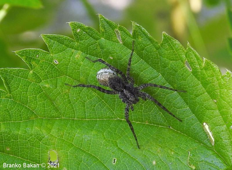 Samec: je manjši od samice, prepoznamo ga po velikih in črnih pedipalpih. Glavoprsje je temnejše, skoraj črno, z ozko svetlo osrednjo liso. Na zadku so svetle lise pogostejše ob robnem delu. Bazalni členki nog so črni, ostali členki so rumenorjavo pasasti.