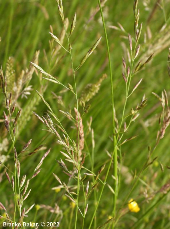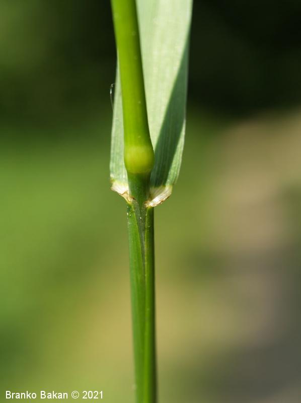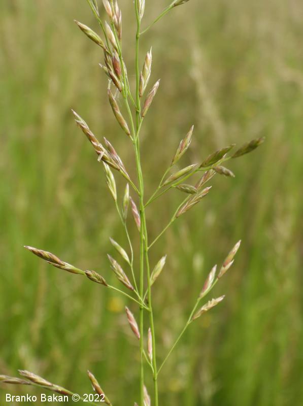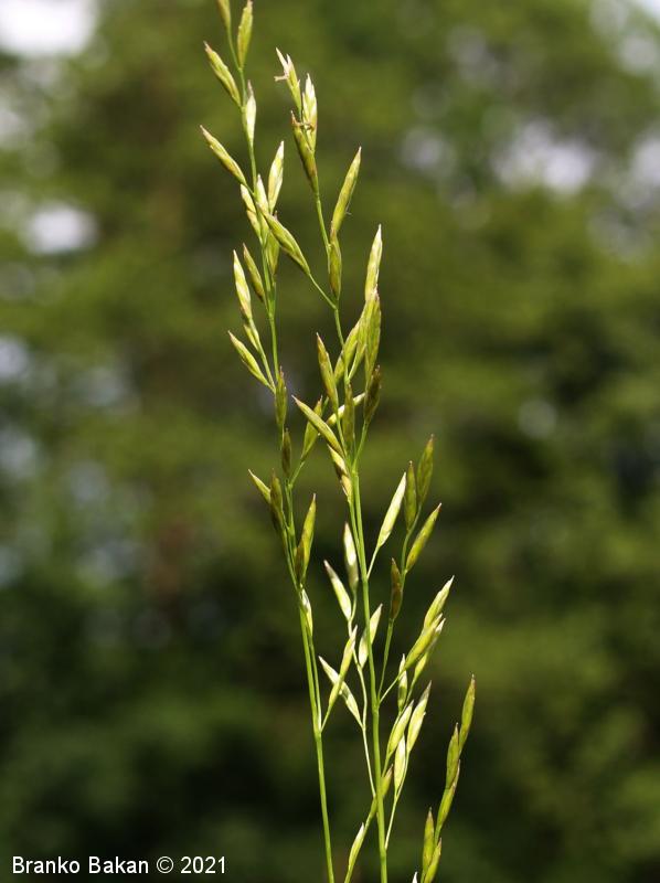 Opis: pokončna, rahlo rušnata zelnata trajnica brez pritlik. Listi so ploski, široki 5-15 mm, nekoliko mlahavi, pri vrhu kratko koničasti, gladki, pri dnu podaljšani v listno nožnico in na bazi s kratkimi, golimi, ušesastimi izrastki. Listna nožnica je gladka in ima zelo kratko, do 2 mm veliko, pri vrhu prisekano ligulo (listna kožica). Socvetje je v obrisu piramidasto razrasel lat, večinoma je pokončno do rahlo previsno. Klaski v socvetju so ozko valjasti, koničasti, večinoma zelenkasti ali rdečkasti, dolgopecljati, spodnje vejice socvetja so večinoma s posamičnimi klaski ali največ do dvema. Pleve so koničaste, večinoma brez res, gladke, ob robovih pogosto rdečkaste.
