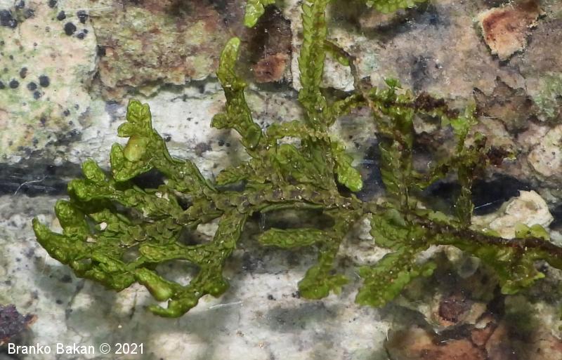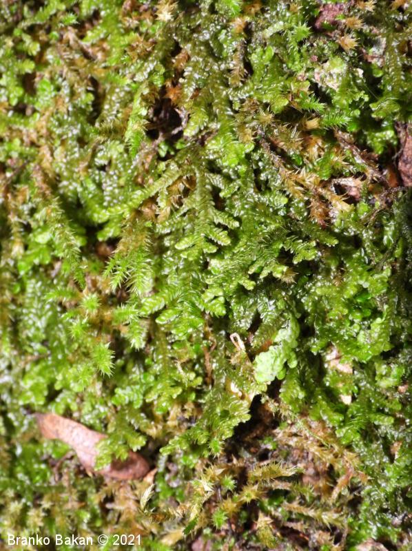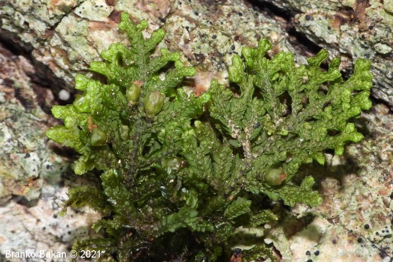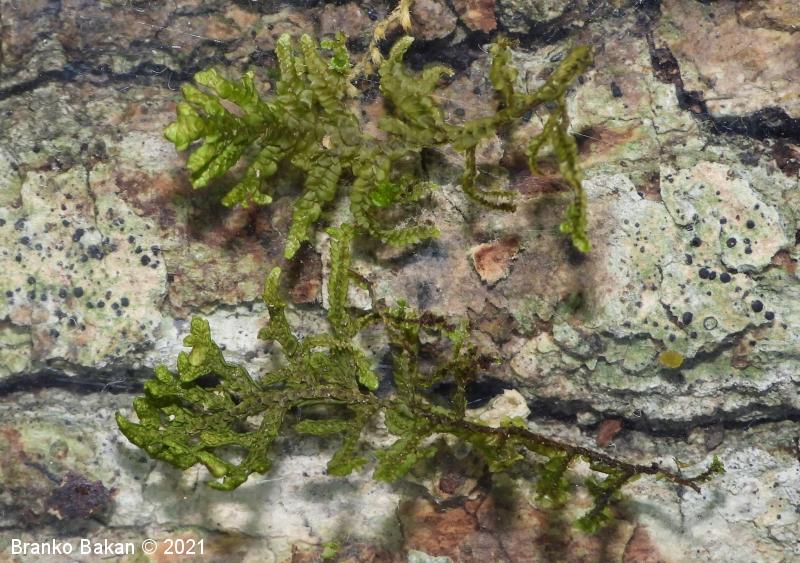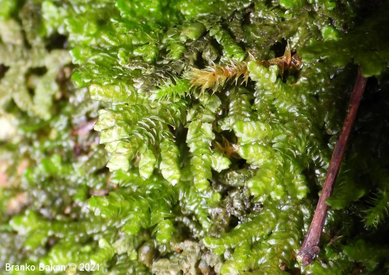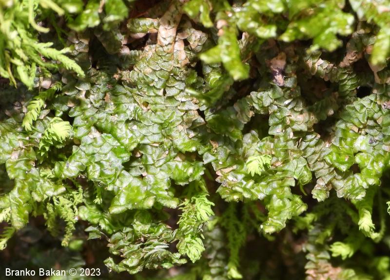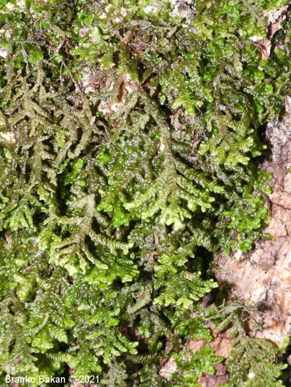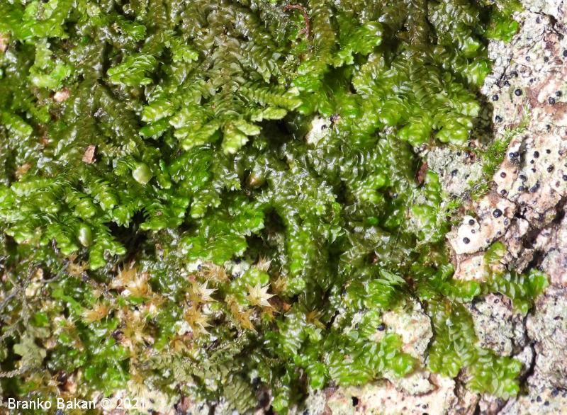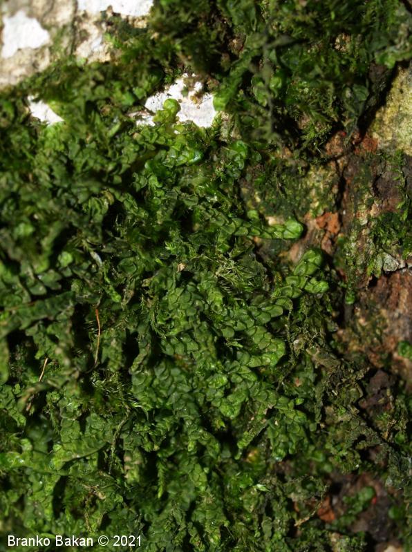 Opis: rastlina se plosko in gosto razrašča predvsem po deblih živih dreves, redkeje tudi po skalah. Steljka je večinoma 2- do 3-krat vilasto razvejana, pri vrhu večinoma rahlo štrleča, sicer prilegla ob podlago, bleščeče temno- do modrozelena, gosto porasla s strehasto razvrščenimi, prileglimi lističi. Krovni (zgornji) lističi so dvokrpi, večja krpa je široko ovalna, celoroba, pogosto z uvihanim robom, manjša stranska krpa je eliptična, koničasta in navzgor štrleča, nekoliko zaobljena. Spodnji listi (amfigastriji) so jezičasti, gladki, tesno prilegli vzdolž stebelca. Ženski gametangiji (arhegoniji) so nameščeni v vrečastih, ovršnih strukturah, moški gametangiji (anteridiji) so večinoma nameščeni v zalistju lističev. Sporogon se le redko razvije, ima kartek pecelj (seta) in se večinoma zvezdasto razpoči na 4 dele.