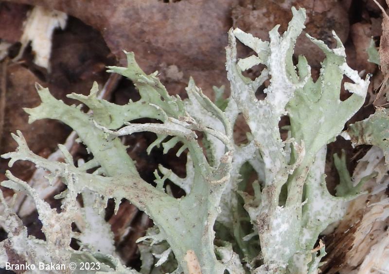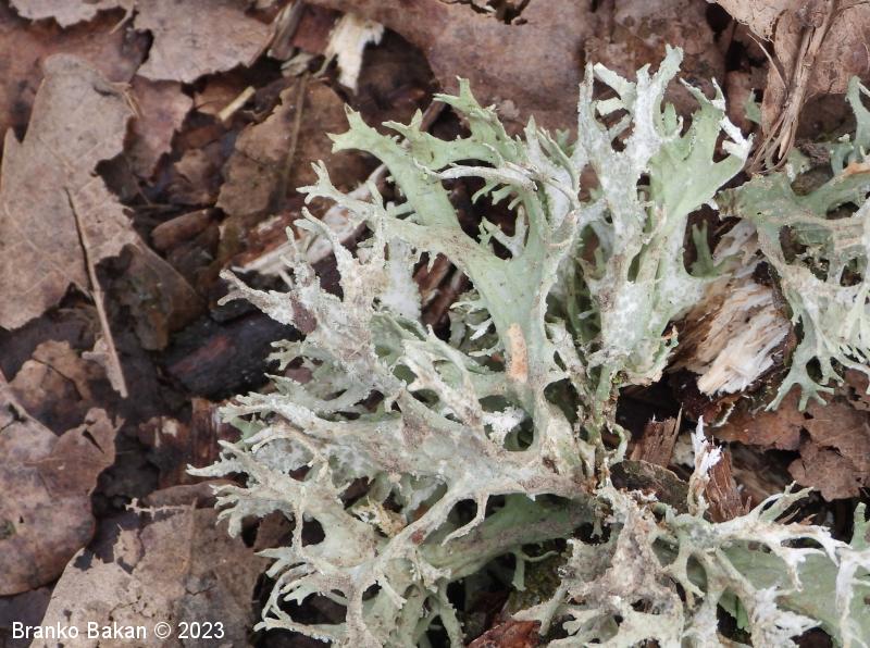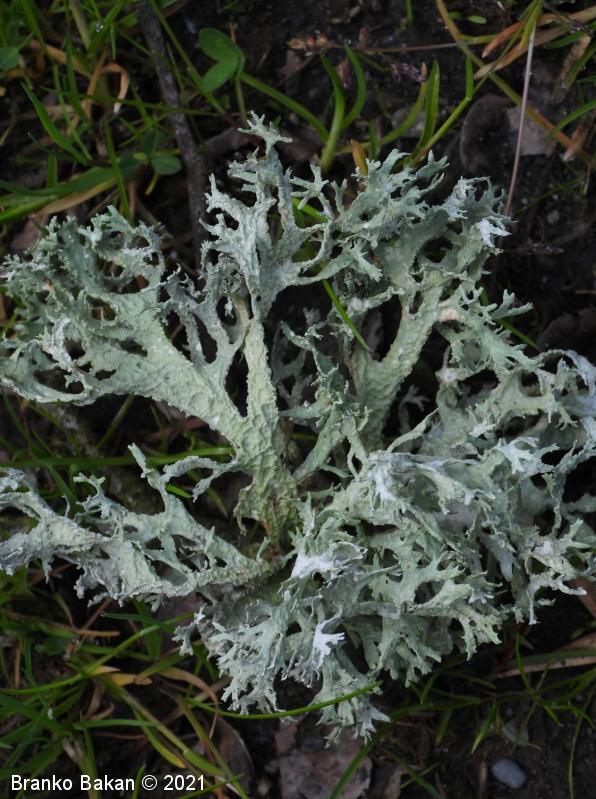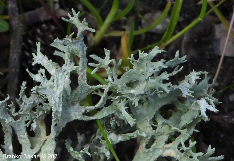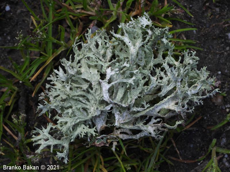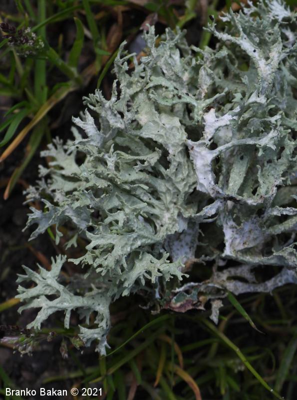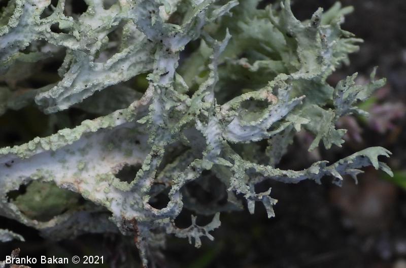 Opis: steljka je grmičasto razrasla, prirasla na podlago na enem mestu. Stranske "trakaste" krpe so do 4 mm široke, večkrat vilasto razvejane (pogosto spominjajo na jelenovo rogovje), po zgornji strani večinoma bledo modrikastozelene (tudi v suhem stanju!), pogosto z jamičasto mrežasto strukturirano površino, po spodnji strani belkaste, ob robovih občasno z zelenimi pikami. Razmnoževalne tvorbe so večinoma soraliji (posebne strukture, kjer se tvorijo drobne, prahu podobne krogličaste tvorbe - sorediji), ki so sprva omejeni ob robovih krp oz. na njihovih rebrih, sčasoma se razširijo po večjem delu steljke, zato je ta grobo prašnato bradavičasta. Apoteciji (skledičasto oblikovanih sporogenih struktur) se le redko razvijejo in so okrog 3 mm veliki.
