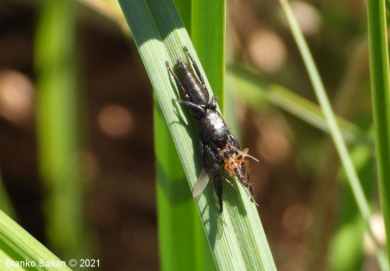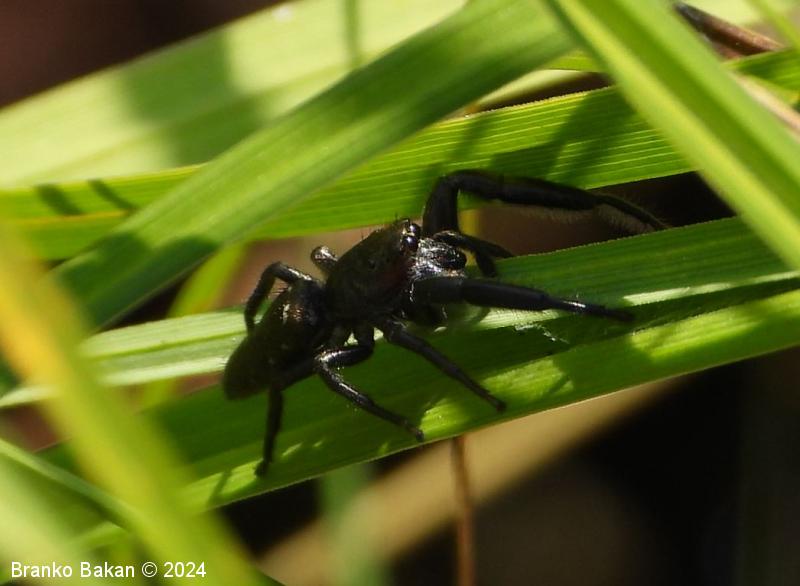 Obnašanje in razvoj: sodi med največje pajke skakače pri nas in velja za dokaj redko vrsto. V mirovanju z iztegnjenimi nogami ždi prilegel ob list, večinoma se zadržuje na obrežnih travah (Poaceae). Pojavlja se namreč ob vodah ali močvirnih predelih. Čeprav je precej velik za skakača, je še vedno zelo gibčen in lahko tudi skoči krajše razdalje.