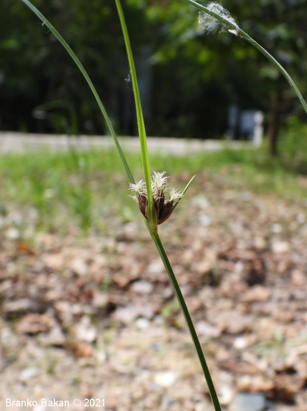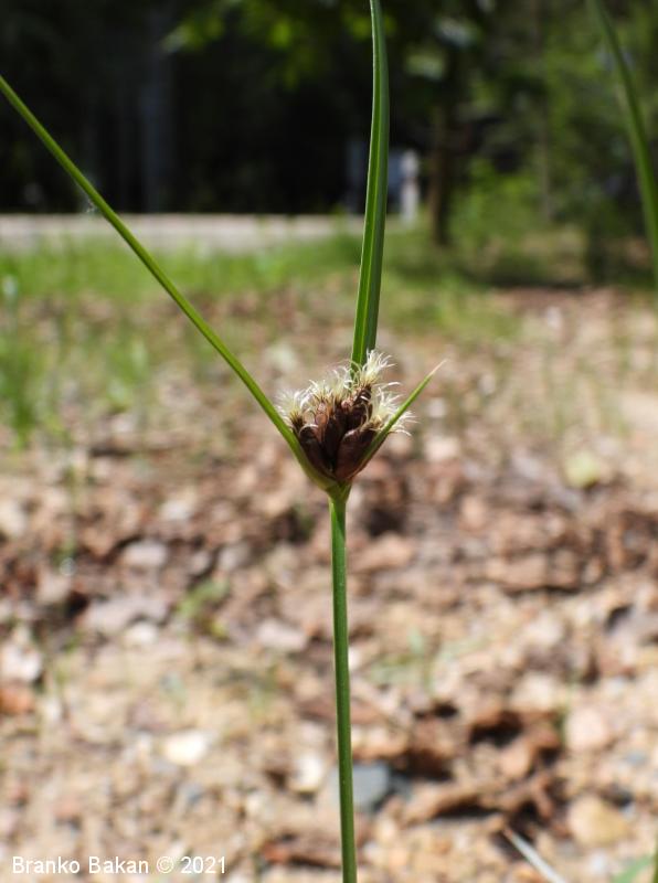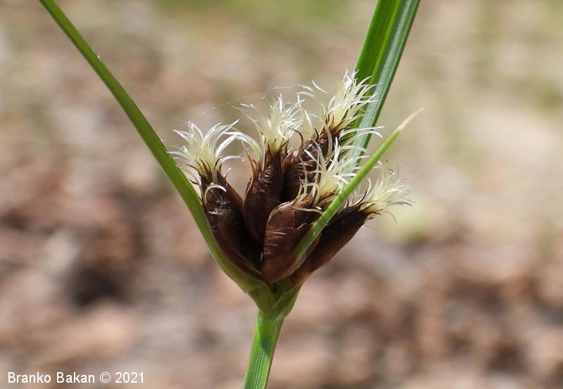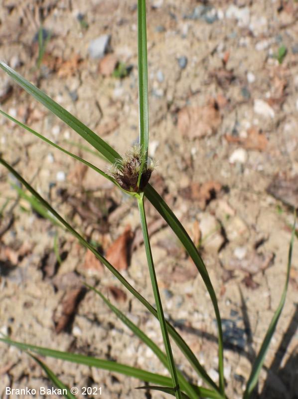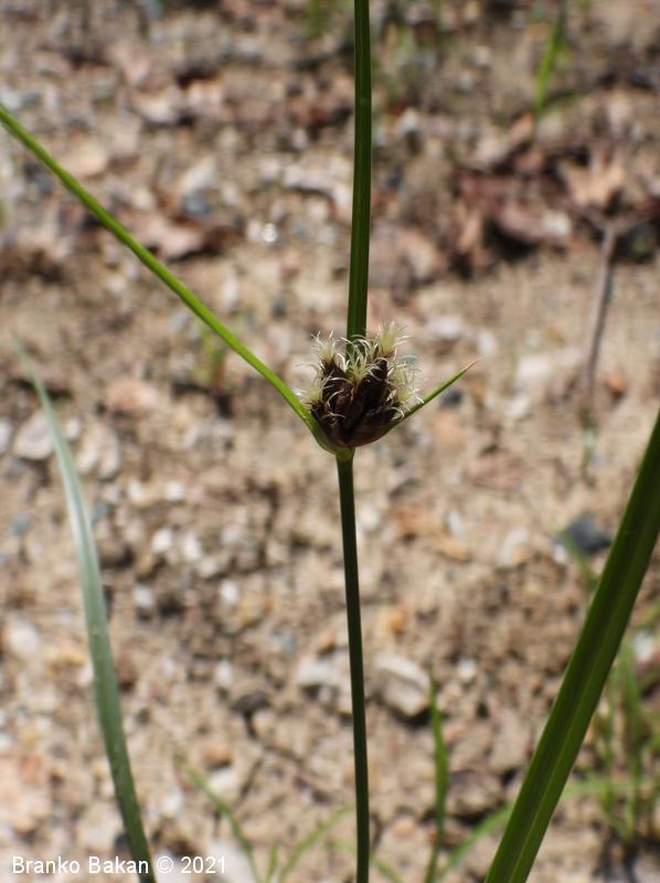Opis: pokončna, rušnata, nerazrasla trajnica s podzemnimi pritlikami. Deli korenin so čebulasto odebeljeni. Steblo je pokončno, ostro trirobo, olistano skoraj do vrha. Listi so ozkočrtalasti, žlebasti, po robovih ostri, 2-5 mm široki. Ovršno socvetje je zgoščeno, z 2-3 podpornimi, šilastimi listi, ki so daljši od socvetja. Klaski so enovito rdeče- ali temnorjavi, skoraj vsi so sedeči, valjasti, koničasti. Krovne pleve so jajčaste, na vrhu izrobljene in podaljšane v dolgo, ostnato konico. Vrat pestiča ima 2 brazdi. Plod je oreškast, z vbočenima stranskima stranicama.