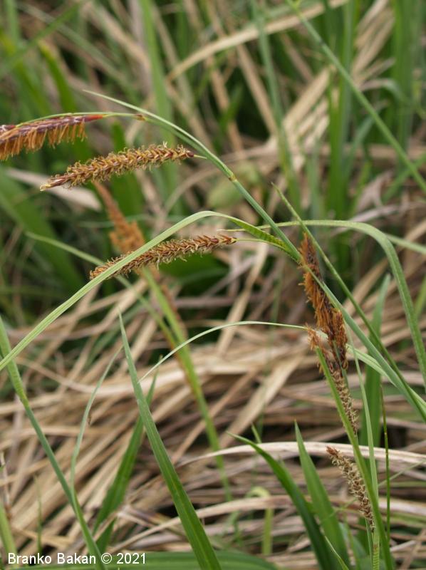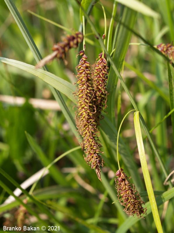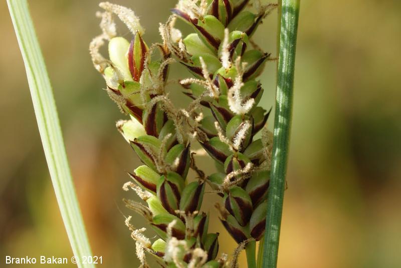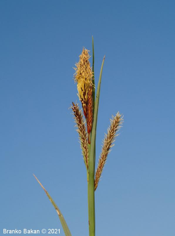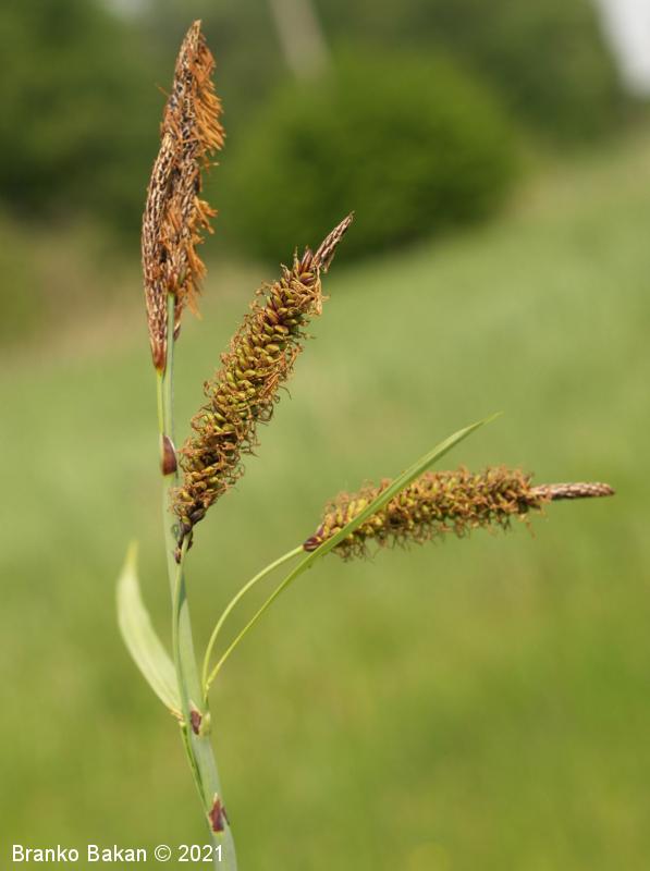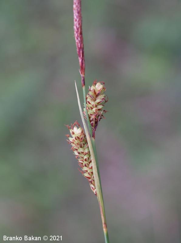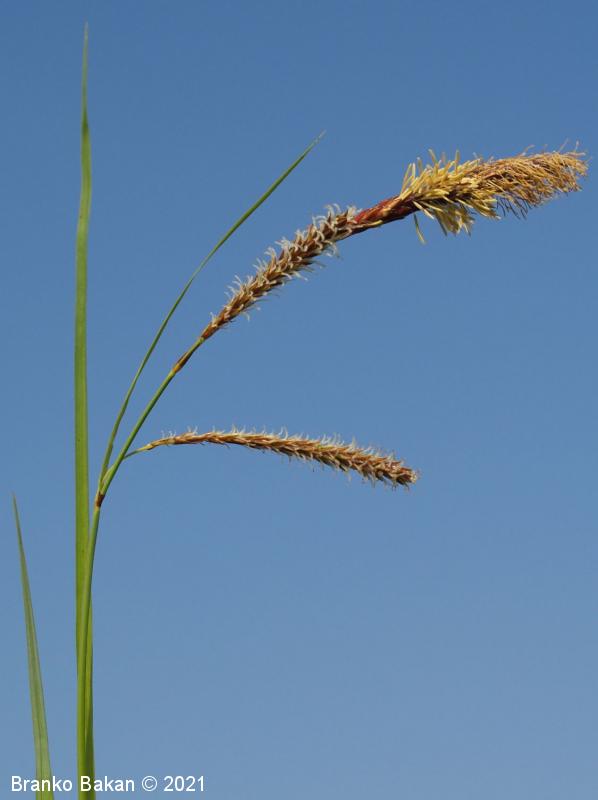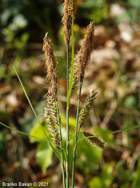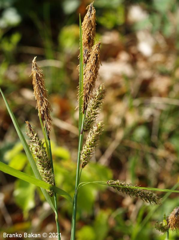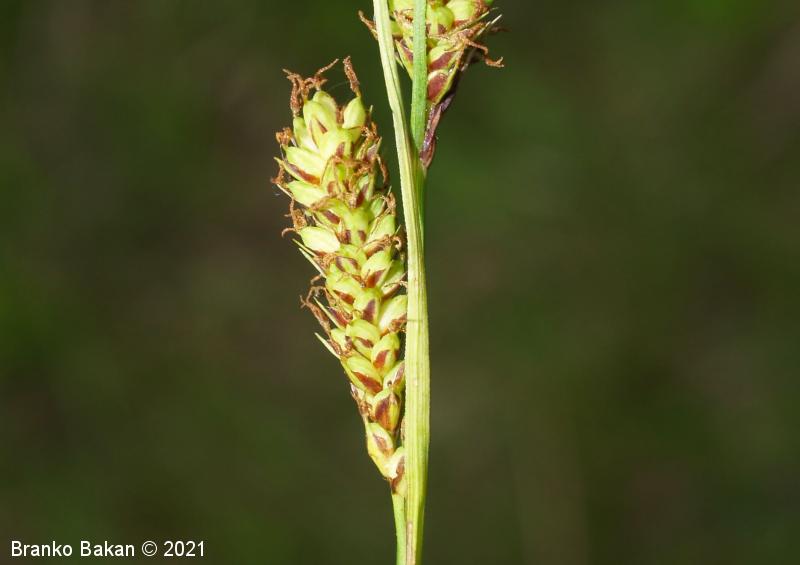 Opis: rušnata trajnica z dolgimi, podzemnimi pritlikami. Steblo je topo trirobo, olistano nekje do sredine, rahlo raskavo. Listi so ozko črtalasti, sinjezeleni, 2-5 mm široki, togi, štrleči, plitvo žlebasti. Spodnji podporni list socvetja je zelen, krajši ali skoraj tako dolg kot socvetje, pokončen, z razločno listno nožnico. Ženski (spodnji) klaski so dolgopecljati, vsaj najnižji po cvetenju previsni, podolgasto valjasti, večinoma jih je od 2 do 4, moški (ovršni) klaski so pokončni, navadno jih je od 2 do 4, pogosto se razvijejo tudi na vrhu najvišjih ženskih klaskov. Krovne pleve v klaskih so jajčaste, pri vrhu podaljšane v ostro konico, temno rdečerjave, z zeleno osrednjo žilo. Zrel mošnjiček je temnorjav ali črnikast, jajčast, na vrhu z neizrazitim, zelo kratkim kljuncem ali brez njega.
