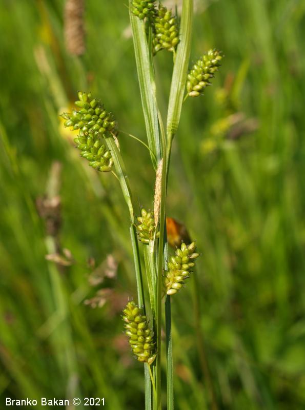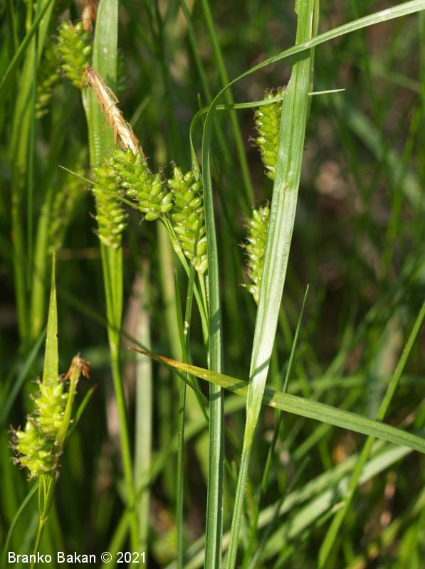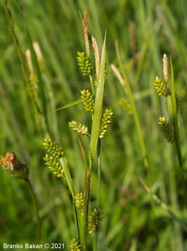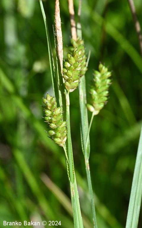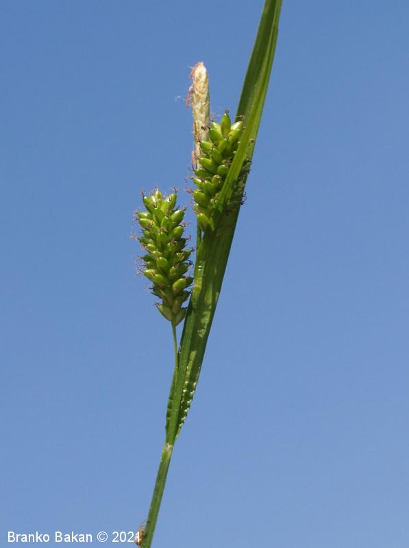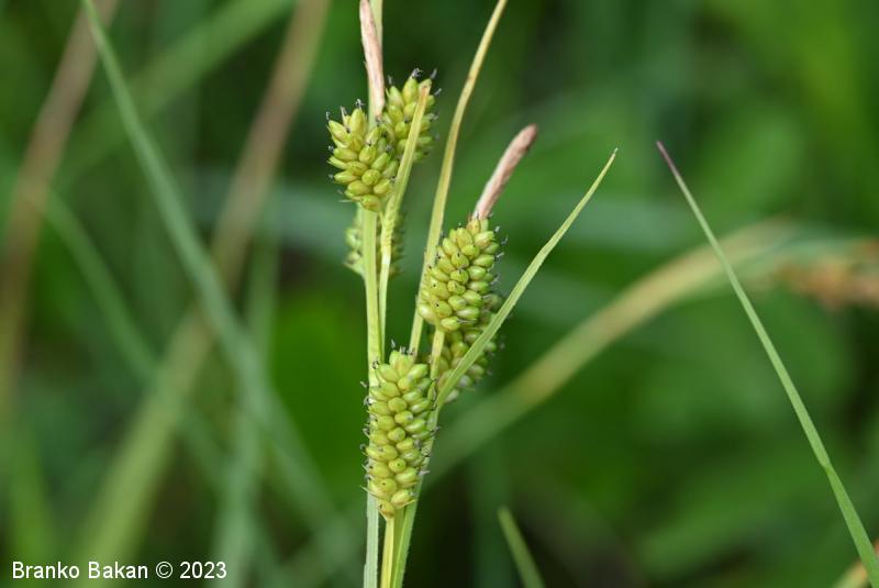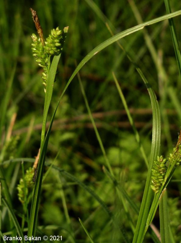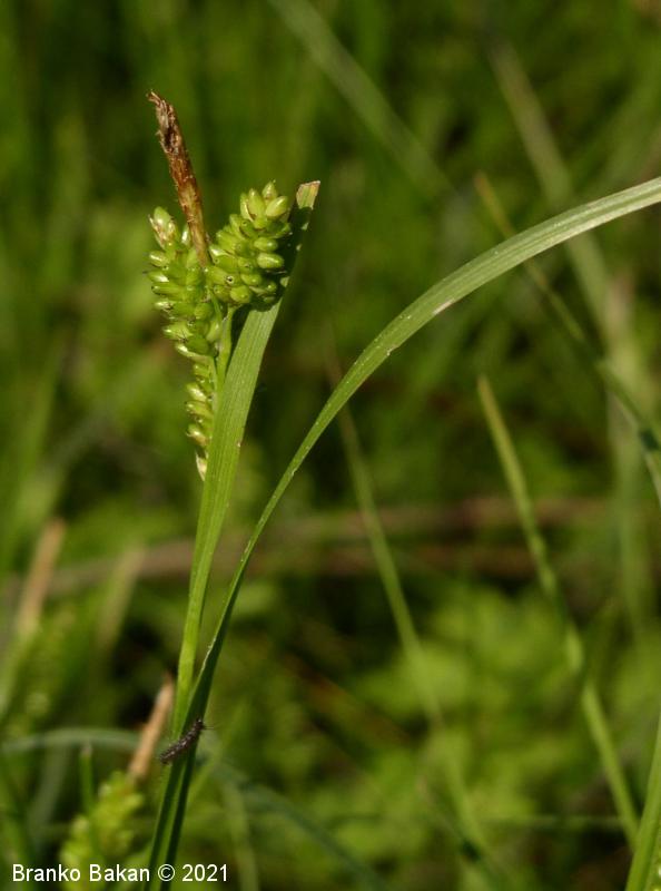 Opis: rušnata do šopasto razrasla trajnica. Steblo je vsaj v spodnjem delu ostro trirobo, olistano nekje do sredine, pokončno. Listi so črtalasti, rumenozeleni, 2-3 mm široki, pokončni, ploski, redko do raztreseno dlakavi. Spodnji podporni list socvetja je zelen, pokončen, večinoma krajši ali skoraj tako dolg kot socvetje. Ženski (spodnji) klaski so dolgopecljati, sprva pokončni, ob zorenju plodov tudi previsni, valjasti, 5 do 15 mm veliki, rumenozeleni, večinoma jih je od 2 do 3, moški (ovršni) klasek je samo en, pokončen, včasih se moški cvetovi razvijejo tudi na vrhu ženskih klaskov. Krovne pleve v klaskih so jajčaste, koničaste, rumenkaste. Zrel mošnjiček je zelen ali rumenkast, bleščeč, jajčast in nekoliko napihnjen, na vrhu brez kljunca, do 3 mm velik.