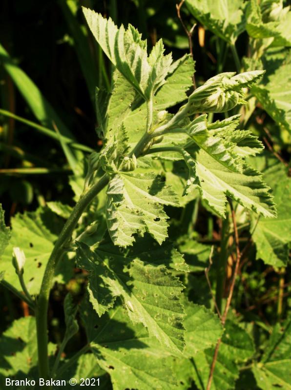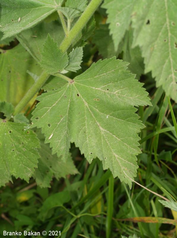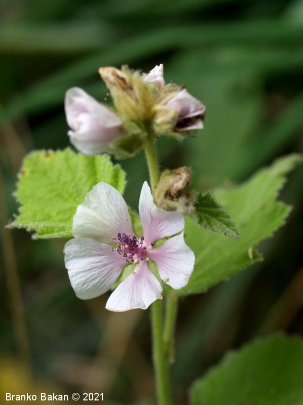 Opis: pokončna trajnica s plazečo, razraslo koreniko. Steblo je v prerezu okroglo, mehkodlakavo, zeleno. Listi so pecljati (pri dnu s parom drobnih prilistov), premenjalno razvrščeni, dlanasto narezani ali krpati (nikoli deljeni), po robu nazobčani, mehkodlakavi (dlake so zvezdaste), sivkastozeleni. Cvetovi nežno rožnati do svetlordeči, pecljati, po dva ali več skupaj v zalistnih, šopastih socvetjih, okrog 20 mm veliki. Venčni listi na vrhu zaokroženi, nežni, ožiljeni. Prašniki številni, med seboj zrasli v prašnično cev. Čaša je dvojna, sestavljena iz 9 zunanjih, manjših, ozkočrtalastih lističev in petih večjih, skoraj trikotnih lističev, vsi mehkodlakavi. Plodiči razporejeni v krogu, kratko ščetinasti, gladki.