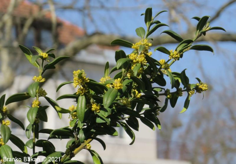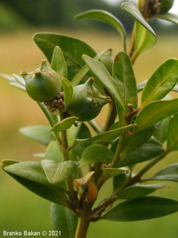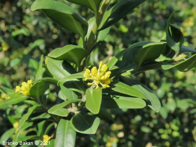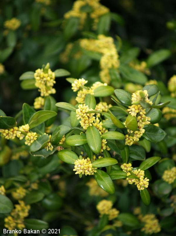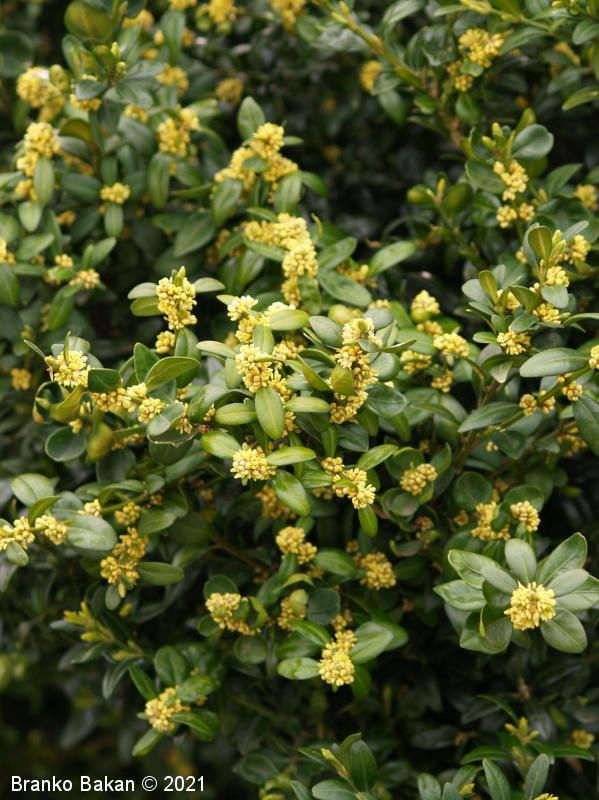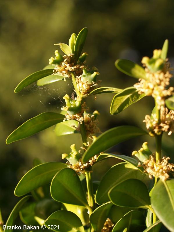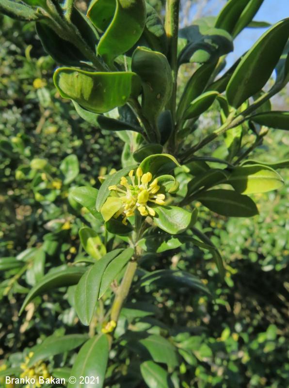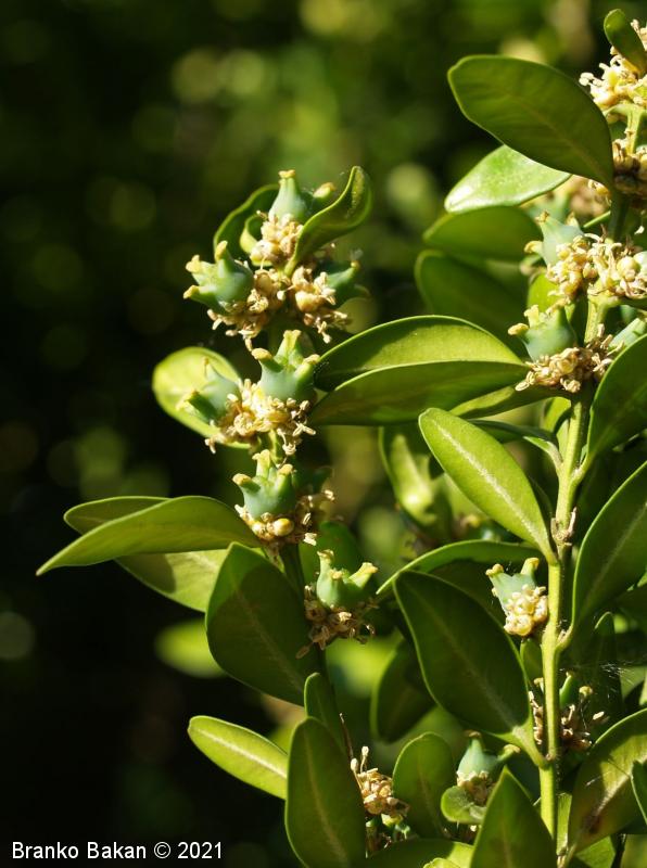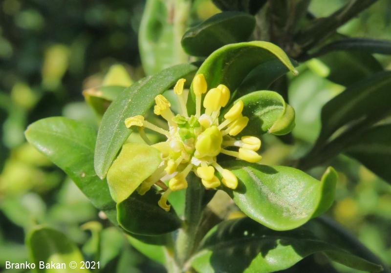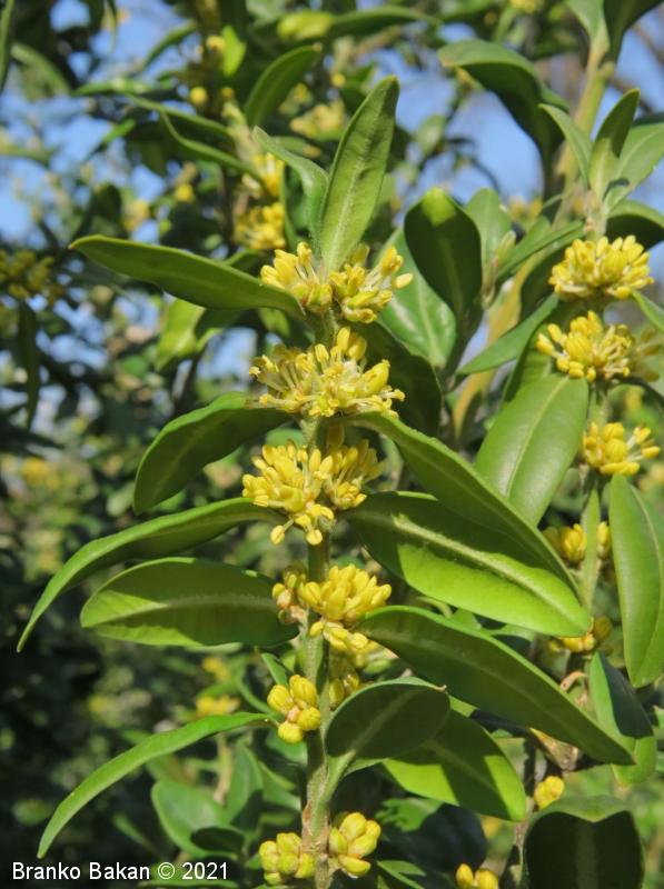 Opis: košato razrasel grm, redkeje nizko drevo. Listi so jajčasti ali eliptični, nasprotno nameščeni, kratkopecljati, trdikasti, vednozeleni, močno aromatični, celorobi. Cvetovi so enospolni, drobni, rumenkasti, močno dehteči, vretenčasto nameščeni v zalistjih. Vretence navadno tvori po en ženski cvet, ki ga obdaja po več moških cvetov. Cvetno odevalo tvorijo drobni čašni listi, venčnih listov ni, plodnice so nadrasle, po tri skupaj in vsaka z nacepljenim vratom, prašniki so 4. Zrel plod je mesnata, tripredalasta glavica.