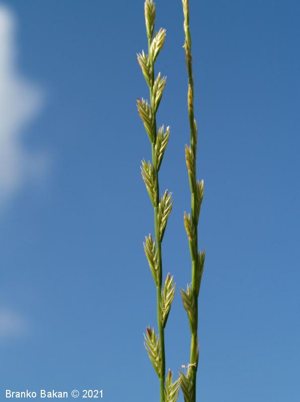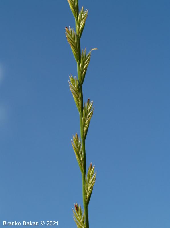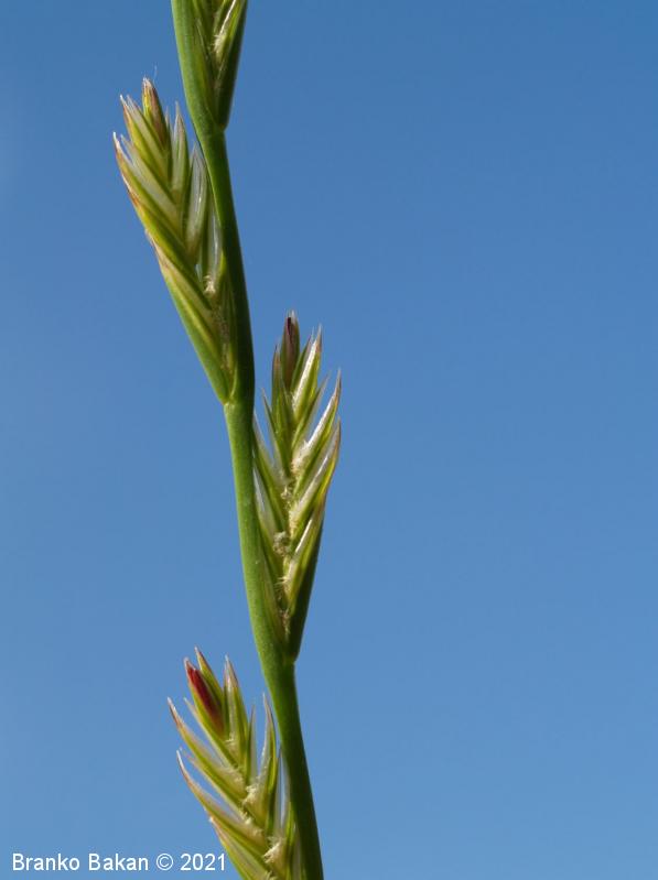 Opis: rušnata trajnica, ki se lahko občasno šopasto razraste. Listi so ploski, do 4 mm široki, temnozeleni, z do 1 mm veliko listno kožico (ligula). Socvetje je podolgasto, do 20 cm veliko, vitko, klaski so z ožjo stranjo nameščeni na os socvetja, ki je vijugasta, med seboj so razmaknjeni, sedeči, večinoma zaprti (le ob cvetenju se nekoliko razprejo) in prilegli ob os socvetja. Ogrinjalne pleve (najbolj spodnje pleve) so mnogo krajše od klaskov, krovne pleve so koničaste, brez rese, s kožnatim robom, 6-8 mm dolge.