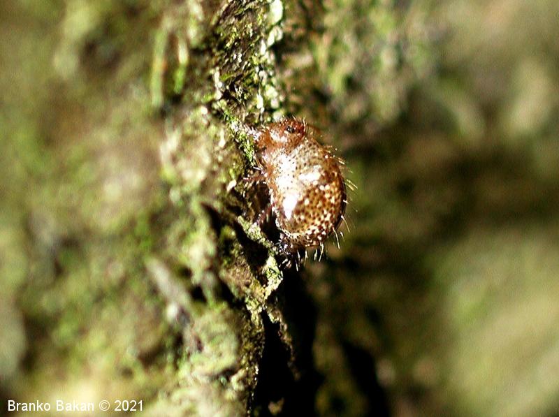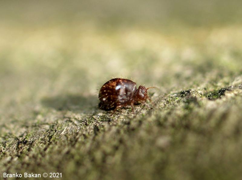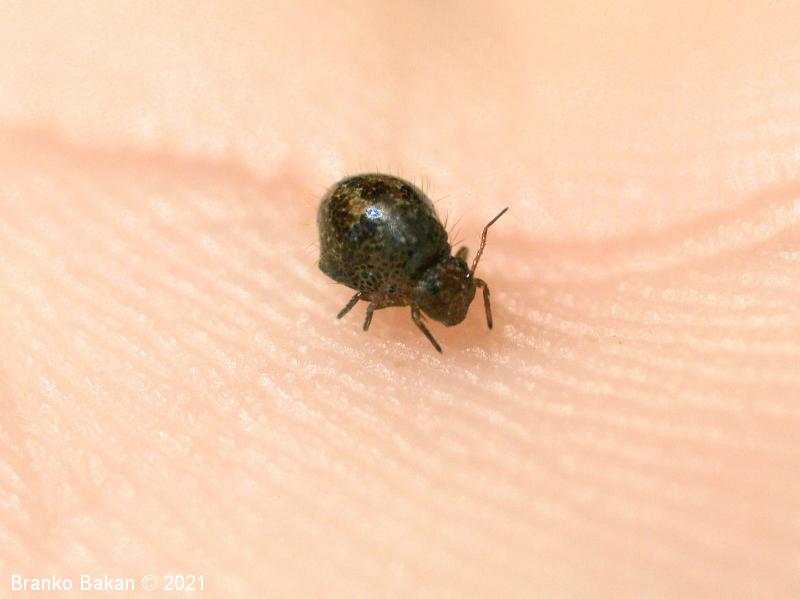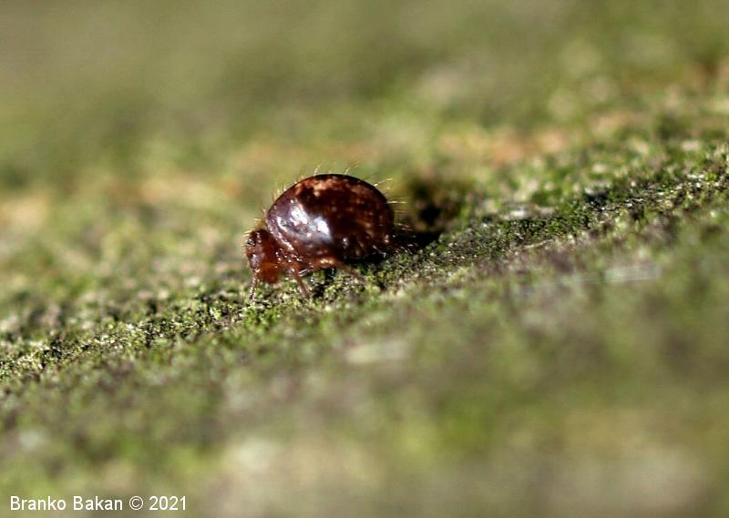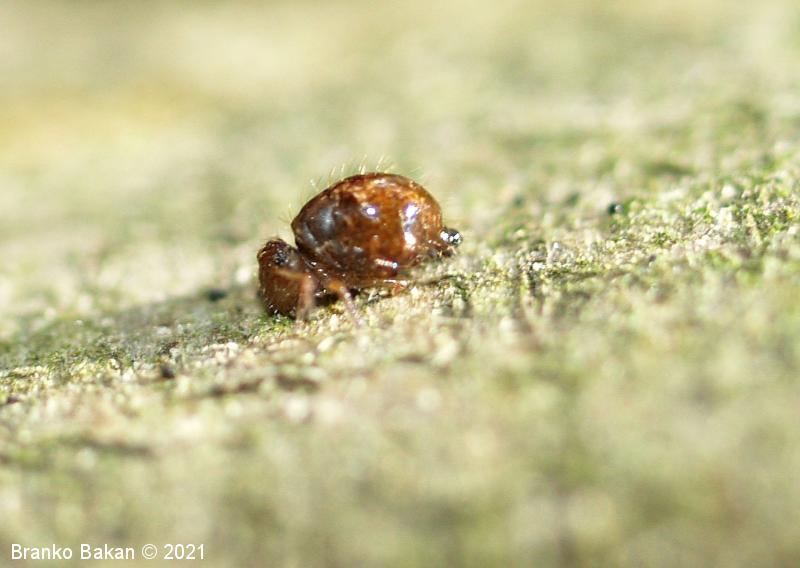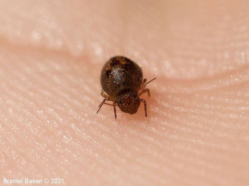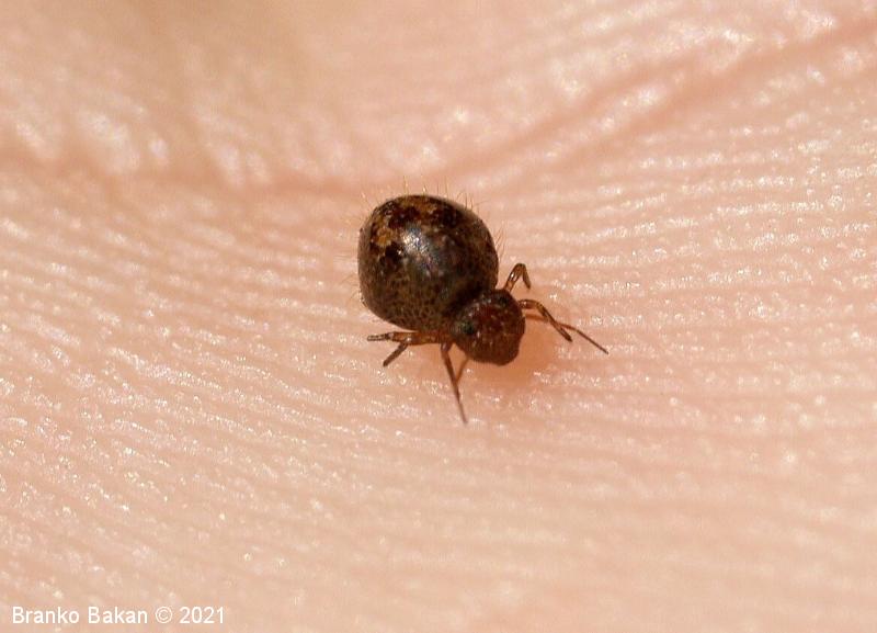 Obnašanje in razvoj: ta srednje-zahodno evropska vrsta je mestoma lahko dokaj pogosta. Zlahka jo opazimo, saj sodi med največje krogličaste skakače, zaradi oblike telesa in namestitve nog pa spominja na pršico (Acarina) ali drobnega pajka (Araneae). Živi na različnih, predvsem vlažnih mestih, pogosto na tleh in na lubju dreves, kjer se hrani z drobnimi algicami in razpadajočim rastlinskim materialom.