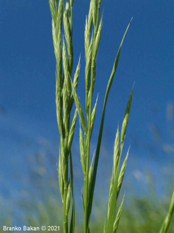 Opis: rušnato razrasla trajnica z dolgimi, plazečimi pritlikami. Mladi listi so rumenozeleni, kasneje postanejo temno zeleni, so črtalasti, ploski, 4 do 6 mm široki, po spodnji strani raskavi in prekriti z drobnimi bodičkami, po zgornji strani redko do raztreseno dlakavi. Listna kožica (ligula) je 2 do 3 mm velika, nekoliko koničasta. Socvetje je podolgasto, pokončno (redko nekoliko kimasto), klaski so sedeči, dvoredno razvrščeni, med seboj odmaknjeni, vitki, poševno štrleči. Krovne pleve so resaste (resa je do 6 mm dolga), večinoma kratkodlakave, redkeje gole.