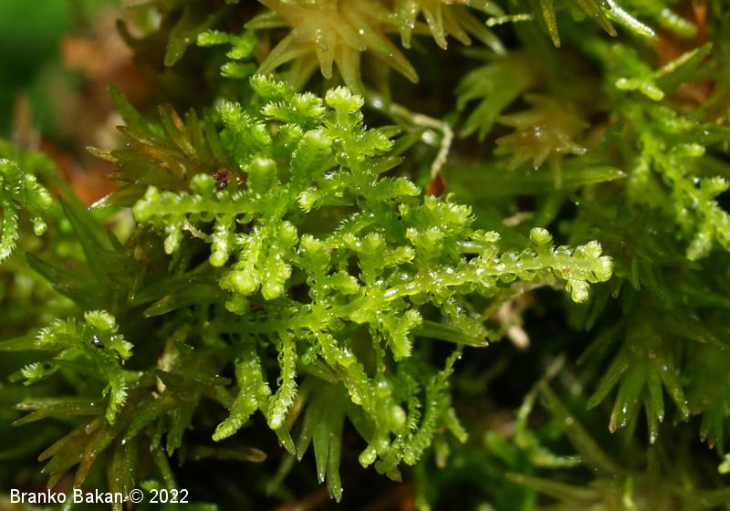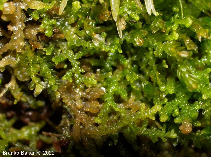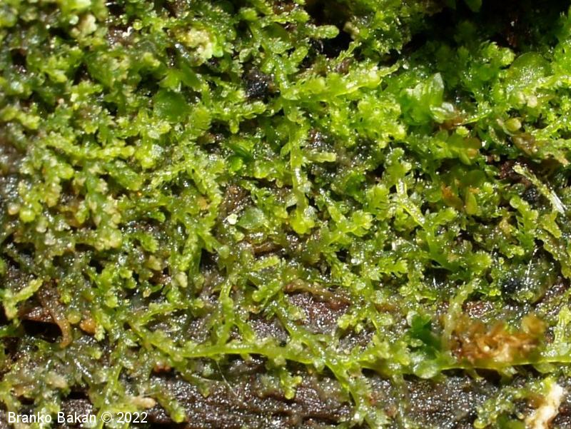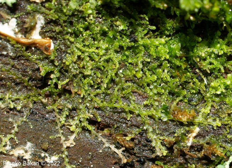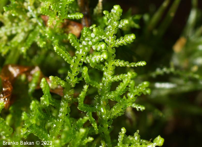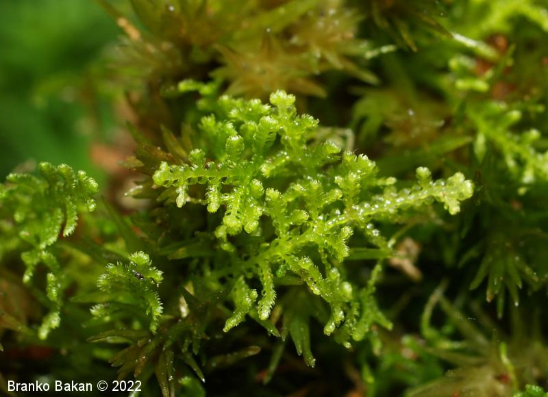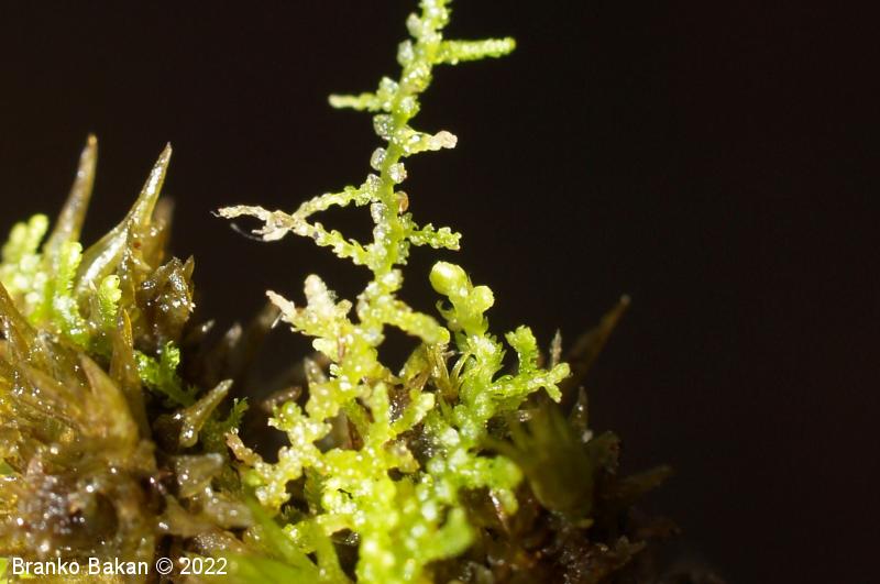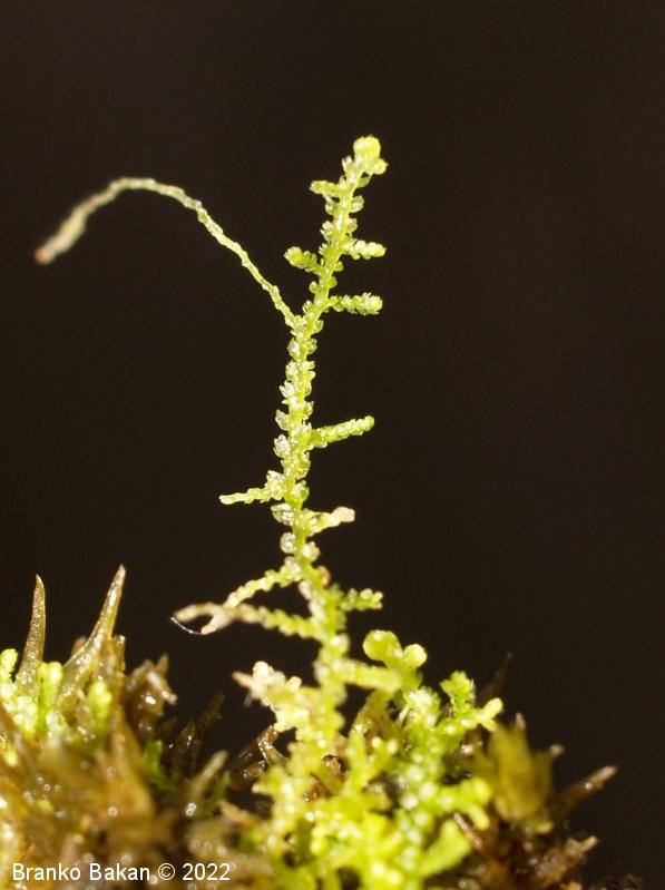 Opis: gametofit (spolna generacija) je dokaj droben, plazeč, rumeno- ali svetlozelen. Osrednje stebelce je do 1 mm široko, iz njega pravokotno izraščajo kratke, stranske vejice, ki se večinoma še naprej razvejajo in so pogosto porasle z manjšimi lističi (razrast je tipična in prepoznavna). Po zgornji strani so stebelca gosto olistana, lističi so jajčasti, sedeči, na vrhu nacepljeni v 3 do 4 ozke roglje, pogosto so uvihani. Trebušno nameščeni lističi (amfigastriji) so manjši od zgornjih in so deljeni v 4 ozke roglje. Ženski gametangiji so nameščeni na vrhu vejic in so obdani z listnato strukturo (periant). Sporogon je pecljat, z okroglasto, črno pušico (kapsula), ki se ob zrelosti spor štiridelno razpoči.