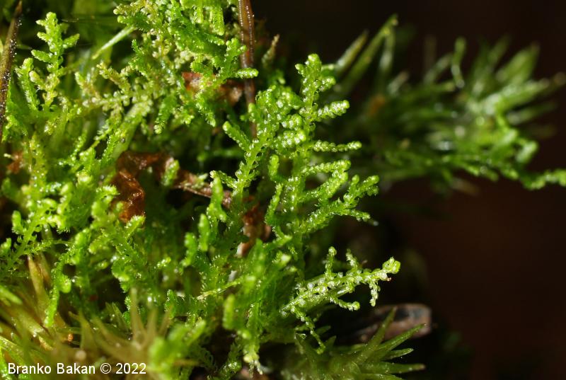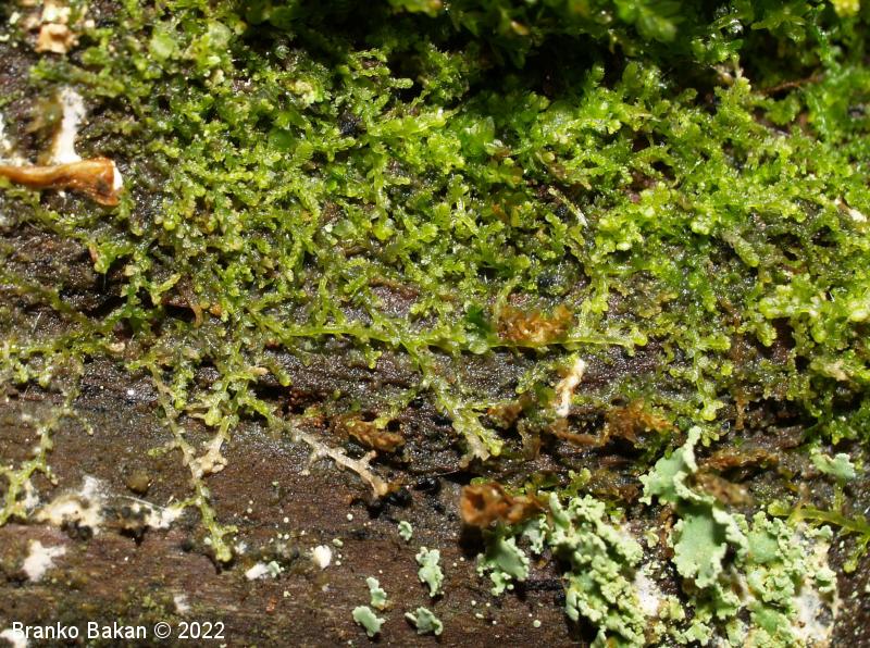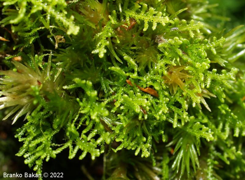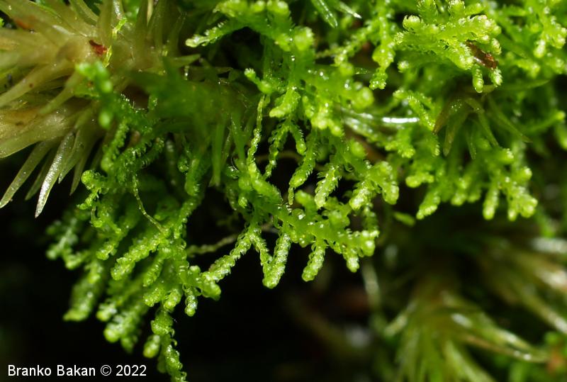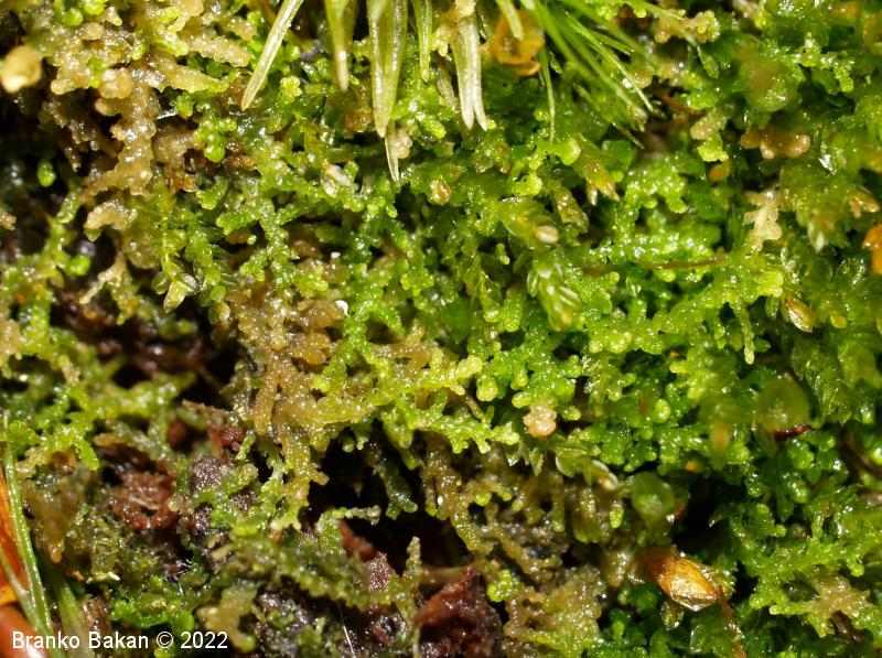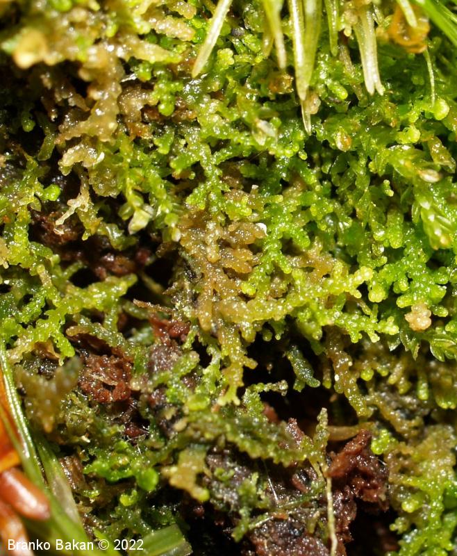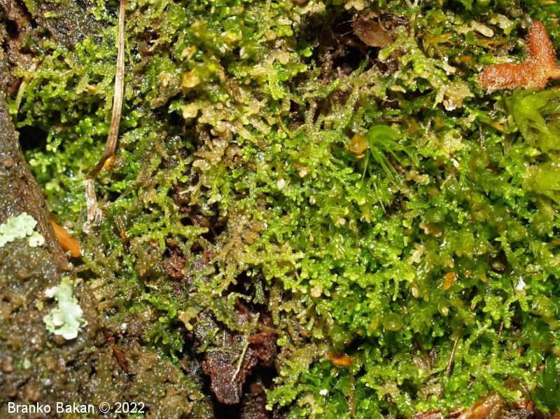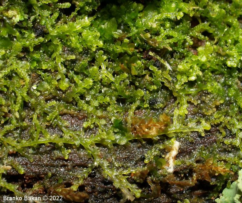 Opis: gametofit (spolna generacija) je dokaj droben, plazeč, rumeno- ali svetlozelen. Osrednje stebelce je do 1 mm široko, iz njega pravokotno izraščajo kratke, stranske vejice, ki se večinoma še naprej razvejajo in so pogosto porasle z manjšimi lističi (razrast je tipična in prepoznavna). Po zgornji strani so stebelca gosto olistana, lističi so jajčasti, sedeči, na vrhu nacepljeni v 3 do 4 ozke roglje, pogosto so uvihani. Trebušno nameščeni lističi (amfigastriji) so manjši od zgornjih in so deljeni v 4 ozke roglje. Ženski gametangiji so nameščeni na vrhu vejic in so obdani z listnato strukturo (periant). Sporogon je pecljat, z okroglasto, črno pušico (kapsula), ki se ob zrelosti spor štiridelno razpoči.