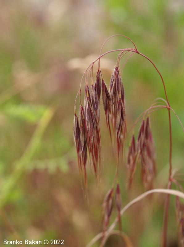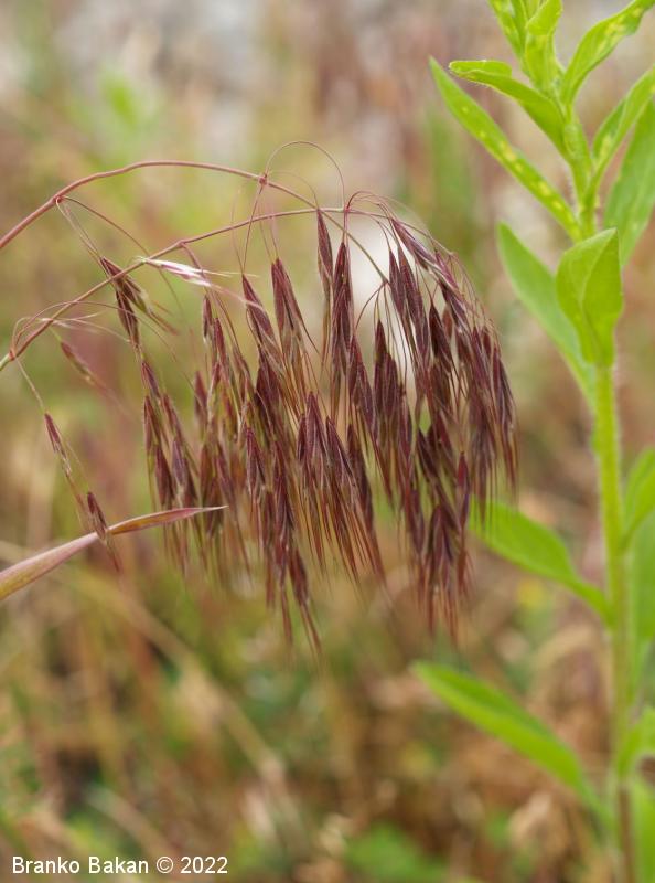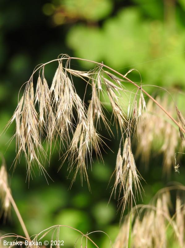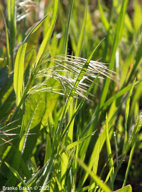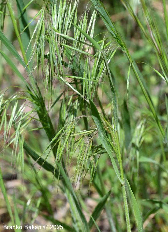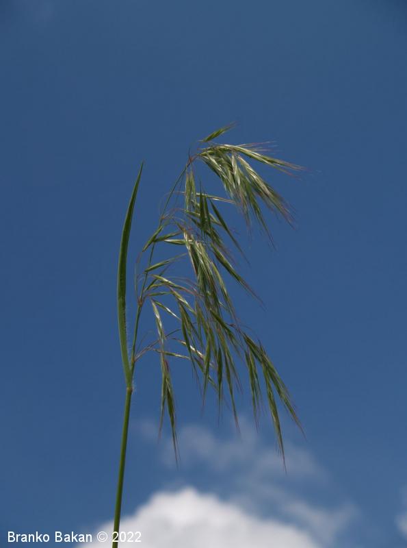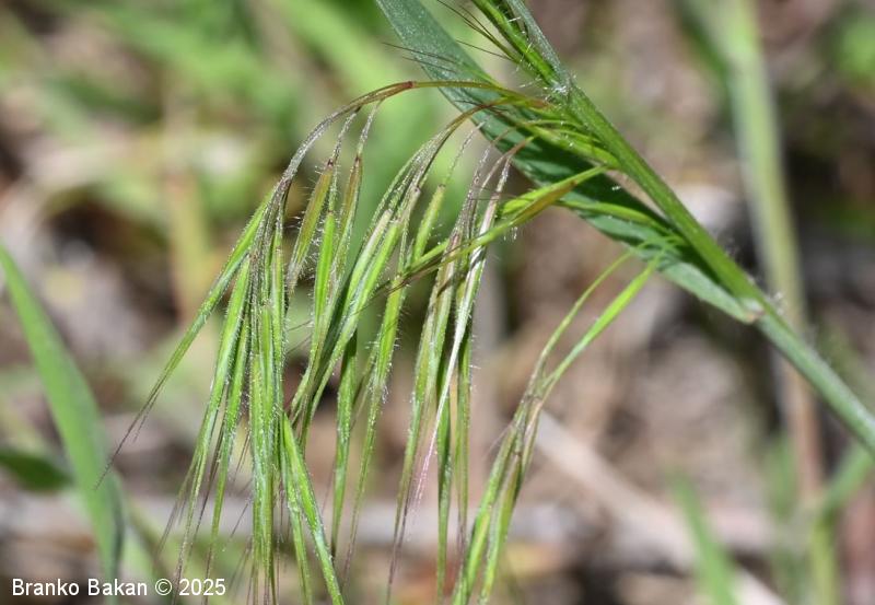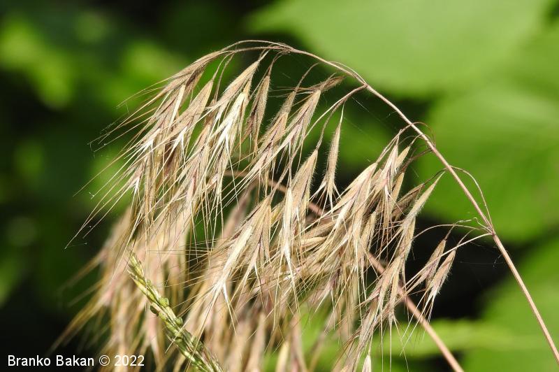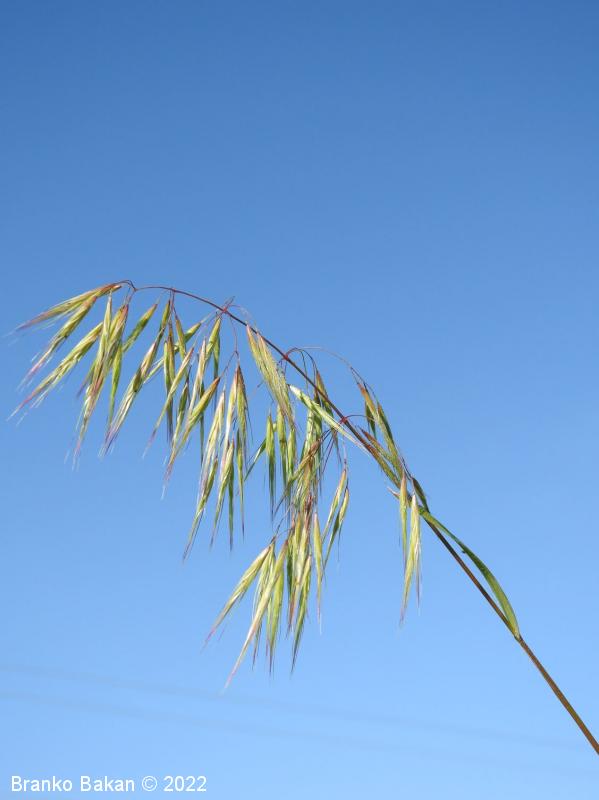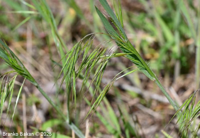 Opis: pokončna, rušnata do rahlo šopasta enoletnica s previsnim, mlahavim socvetjem. Listi so črtalasti, 3 do 5 mm široki, dolgodlakavi, njihove listne nožnice gosto kratkodlakave. Listna kožica (ligula) je kratka, nacefrana. Socvetje je zgoščeno, enostransko previsno. Klaski so dolgopecljati, ozkosuličasti, ploski, 2 do 3 cm dolgi, pogosto rdečkasto nadahnjeni. Krovne pleve so okrog 12 mm dolge, z 1.5 do 2 cm dolgo, ravno reso, kratkodlakave. Ob zrelosti se klaski štrleče raprejo, tako da rese štrlijo na vse strani.