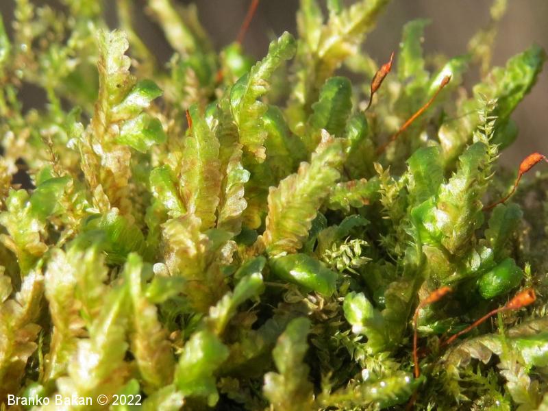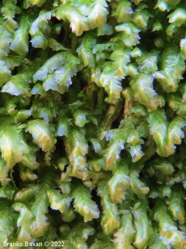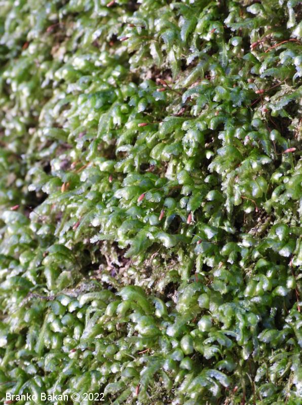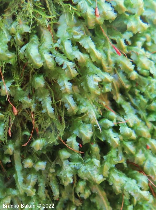 Opis: gametofit (spolna generacija) se v večih plasteh gosto razrašča po podlagi (večinoma po spodnjem delu drevesnega debla). Stebelca so vilasto razrasla, gosto strehasto porasla z lističi. Lističi so podolgasto lopatičasti do jezičasti, okrog 2 mm veliki, temnozeleni, rahlo asimetrični, bleščeči, na vrhu zaokroženi in z zelo kratko, drobno nazobčano konico, nekje do polovice z osrednjo "žilo", med seboj se prekrivajo in so v suhem stanju navzdol upognjeni (zato rastlina močno spominja na listaste jetrenjake (Jungermanniopsida), npr. na bičnik (Bazzania spp.)). Sporofit (nespolna generacija) se razvije na obstranskih poganjkih, je na dolgem, rjavem peclju (seta), na vrhu nosi ozko podolgasto, rahlo ukrivljeno pušico (kapsula), ki jo prekriva dolgorogljati pokrovček (kaliptra).