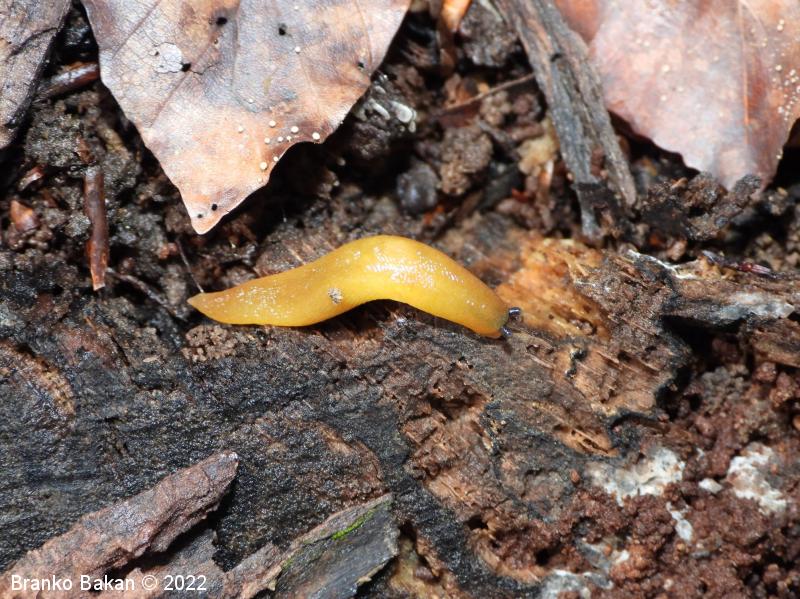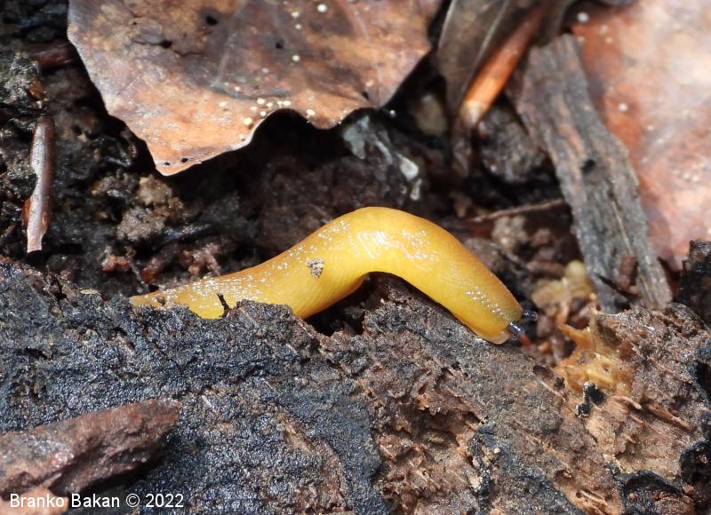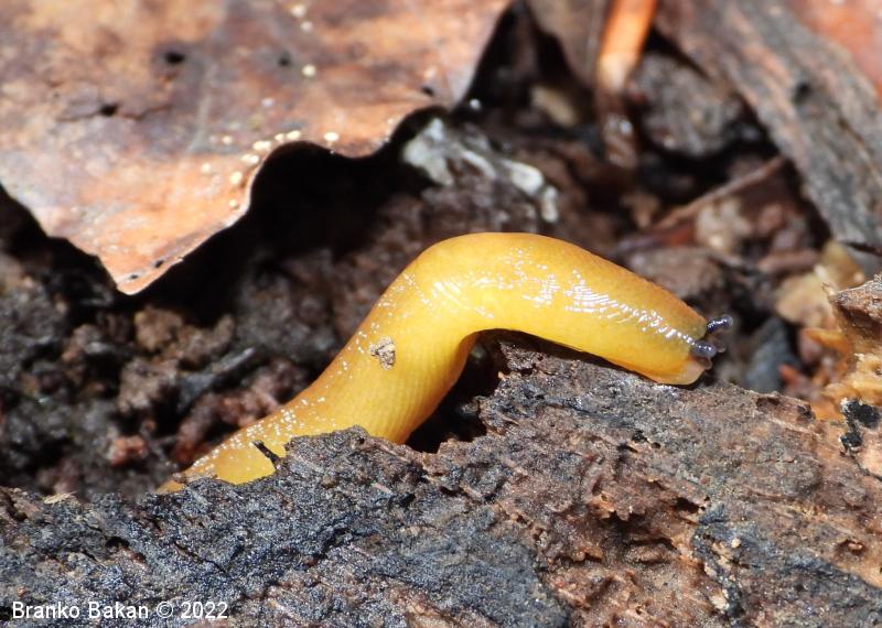 Odrasli osebki: v celoti so citronasto rumeni, bledo oranžni ali zelenkasto rumeni (redkeje belkasti), le tipalnice so temne. Površina telesa je rahlo vzdolžno izbrazdana, le redko rahlo pasasta, nekoliko prosojna, s kratkim, topim hrbtnim grebenom, ki se razteza le po zadnjem delu repa, ta se proti koncu enakomerno zoži. Plašč dosega manj kot 1/3 telesa, ima koncentrične brazde, podobne prstnemu odtisu, dihalna odprtina (pneumostoma) se nahaja ob robu zadnje polovice plašča. Noga je po spodnji strani rumenkastobela, sluz je oranžna ali rumena, močno lepljiva.