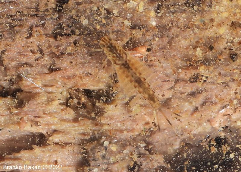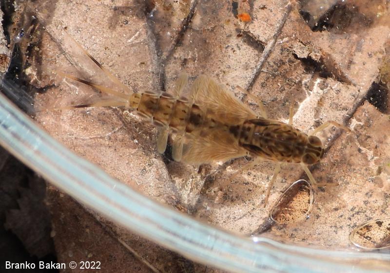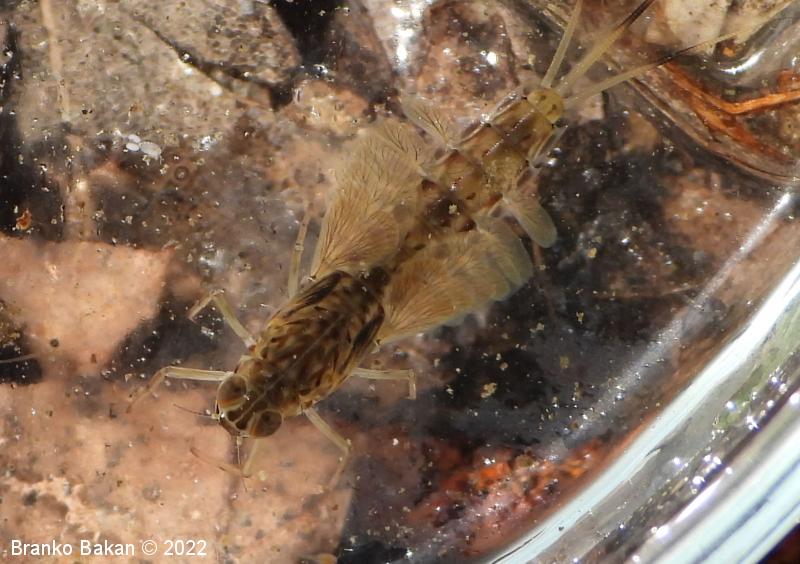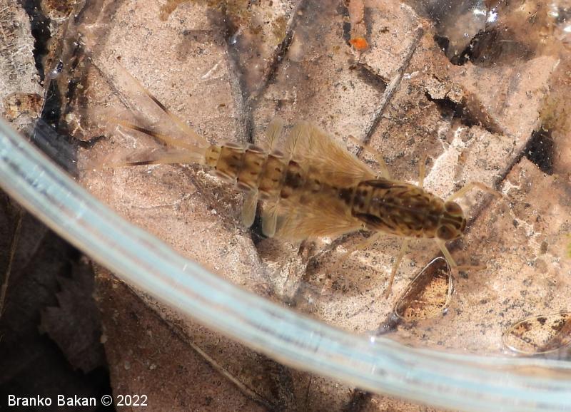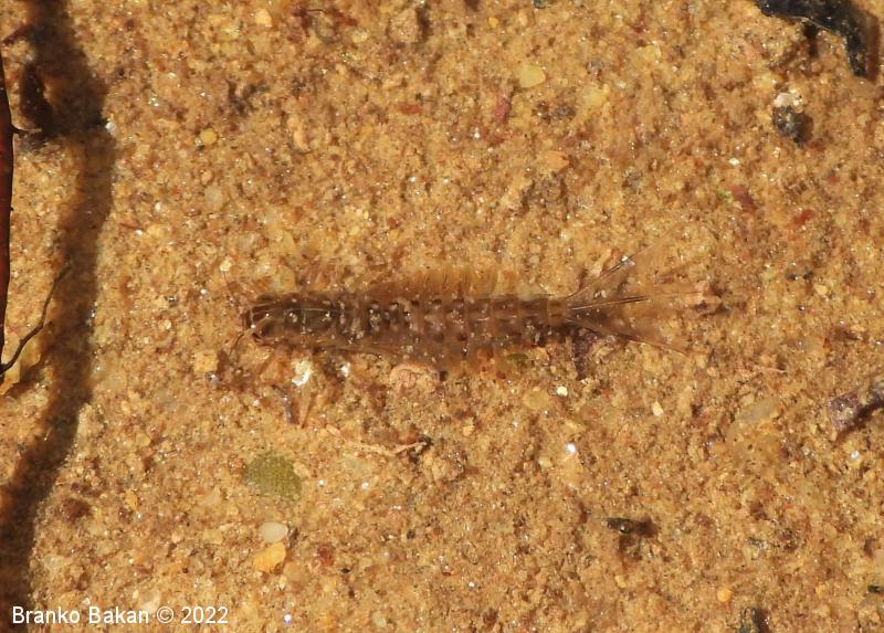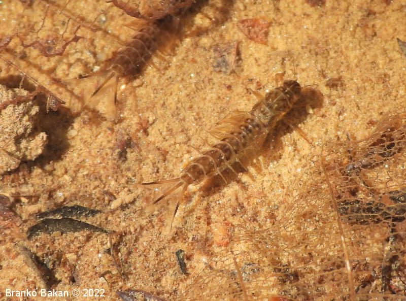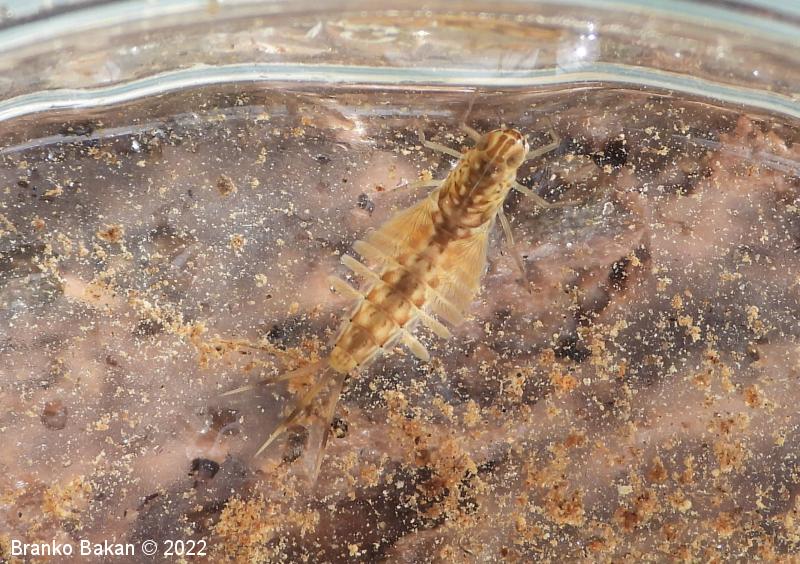 Ličinke: telo je podolgovato, valjasto, rumeno- ali temnorjavo, posejano s temnejšimi vzorci, okrog 10 mm dolgo. Glava je usmerjena naprej, po temenskem delu z dvema rjavima črtama, oči so obstransko nameščene, tipalnice so nitaste, krajše od širine glave. Zadek je zelo dolg, trahealno-škržni izrastki so listasti, dobro ožiljeni, prva dva para sta podvojena, ostalih pet je posamičnih. Končni segmenti zadka so ob robovih trnati, zadnji par je ozko trikoten, na bazi ožji kot je dolžina trna (!). Na koncu zadka se nahajajo trije nitasti izrastki (cerki), osrednji je v celoti peresast, stranska dva le z notranje strani, na sredini imajo vsi trije temno črto. Noge so svetle.