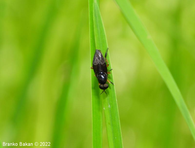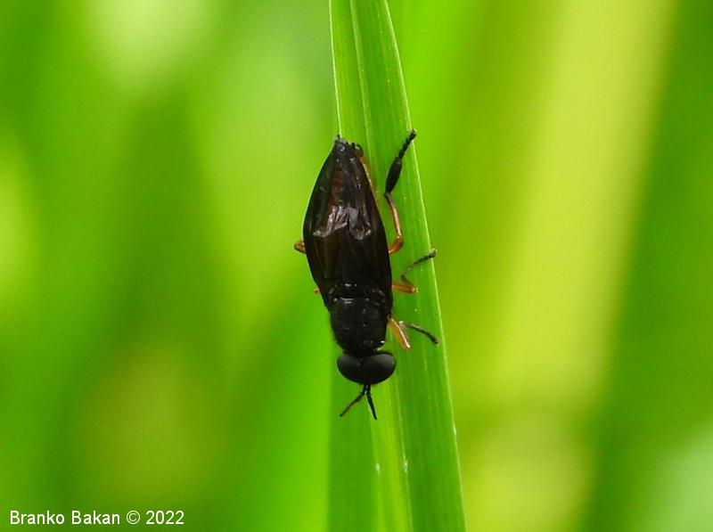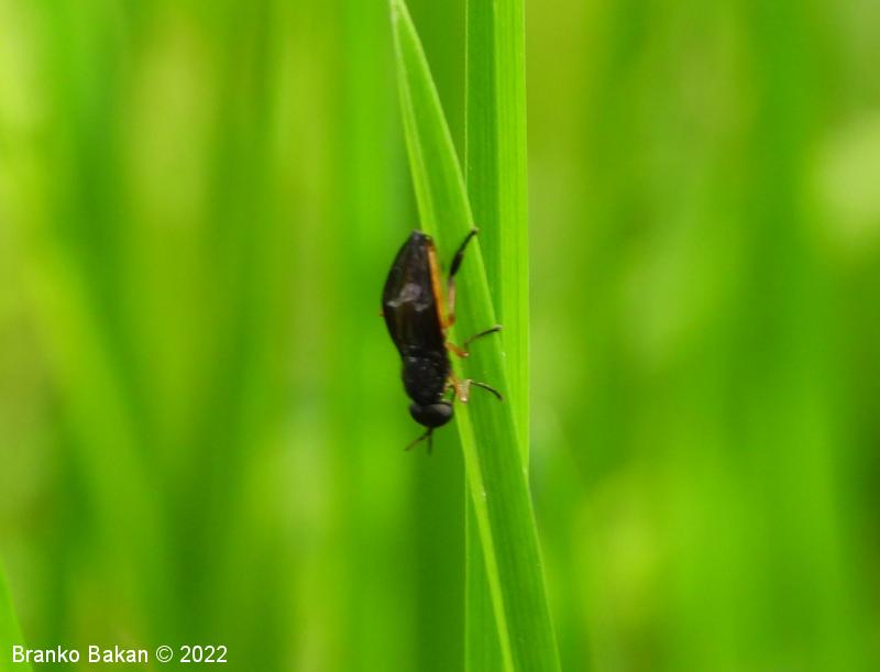 Odrasli osebki: precej temni, z oranžnim zadkom in oranžnimi nogami. Glava je temna, široka, s temnimi očmi, ki so pri samicah razmaknjene, pri samcih se stikajo. Tipalnice so črne, kratke. Oprsje je bleščeče kovinsko črno, ščitek (scutellom) je prav tako bleščeče črn s 6 trni. Krila so temna (pri samicah bolj kot pri samcih), s črno, ozko pterostigmo (obarvano žilno okence). Zadek je pri samicah v celoti oranžen do oranžnorumen, pri samcih je bazalni členek temen. Noge so rumenkaste ali oranžne, le goleni so lahko delno črne (zadnje goleni skoraj nikoli!), tudi stopalca so črna, pri samčkih je prvi členek stopalc močno odebeljen.