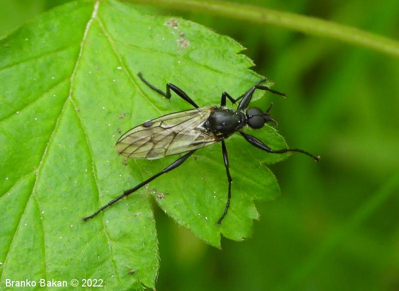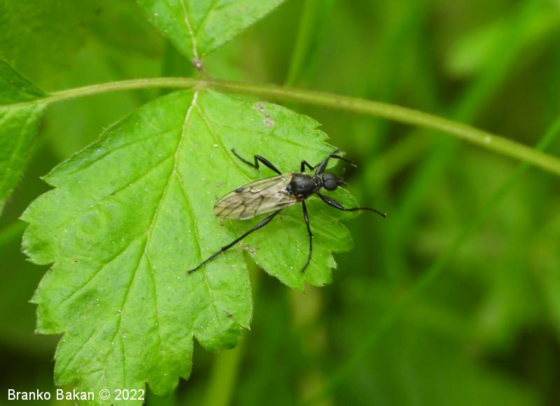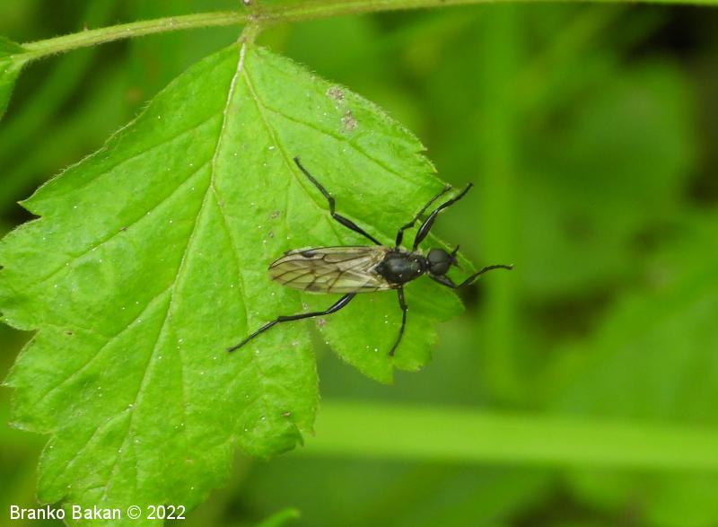 Samica: v celoti črna, s prosojno mlečnimi krili. Glava je drobna, črna, tipalnice so kratke, črne. Oprsje je bleščeče črno, večinoma le ob straneh poraslo s svetlimi dlakami, v zadnjem delu grbinasto. Krila so krepko ožiljena, z izrazito, črno pterostigmo. Zadek je črn. Noge so v celoti črne, sprednja stegenca so nekoliko odebeljena (a manj, kot pri podobnih vrstah!), goleni zadnjih nog so nekoliko odebljene le v drugi polovici.