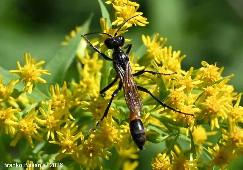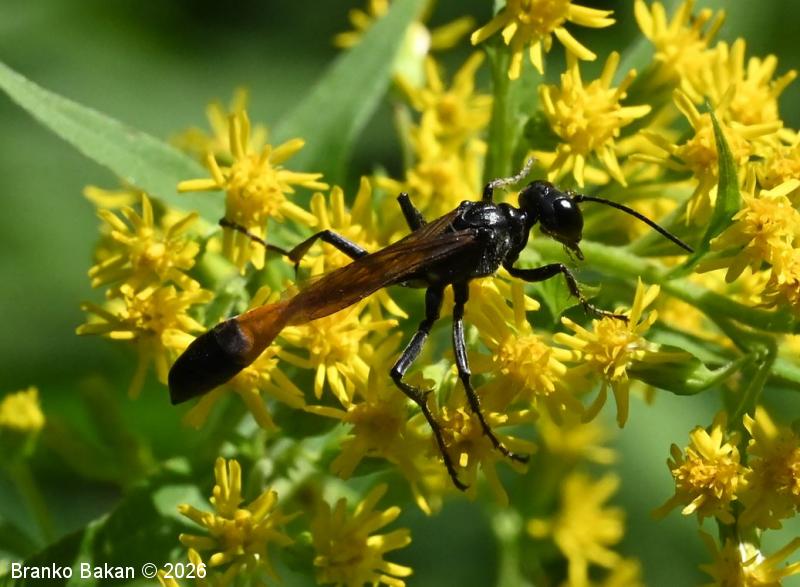 Odrasli osebki: vitki in veliki, prepoznavni so po bleščeče črnem telesu in delno oranžnordečem zadku. Glava je ozka, s krepkimi čeljustmi, oči so velike, temne, tipalnice so nitaste, črne, tako dolge kot oprsje, ki je prav tako črno, poraslo z rumenkastimi ščetinami. Zgornji del oprsja je gol, neporasel z dlakami, zadnji del oprsja (propodeum) in bočni del so gosto porasli z daljđimi svetlimi dlakami. Krila so ozka, motno rumenkasta, dobro ožiljena, mnogo krajša od zadka. Zadek je vitek, dolg, prva segmenta sta tanka, dolga in se postopoma razširita v betičast, na koncu koničast zadek, ki je v sprednjem delu oranžno rdeč, zadnji del zadka (vsaj trije segmenti) je črn in rahlo modrikasto nadahnjen, neizrazito bleščeč. Noge so dolge in vitke, v celoti temne, z rahlo srebrnkastim leskom, sprednje noge so delno grabilne, goleni in stopalca so porasla z mehkimi ščetinami.