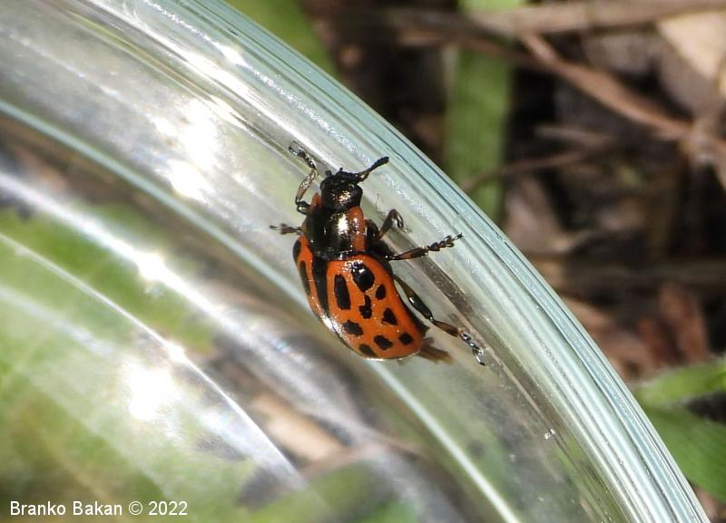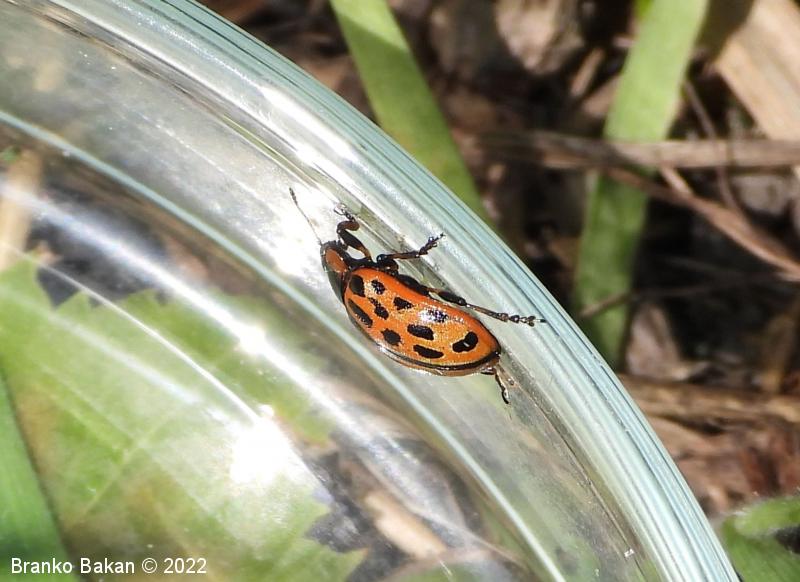 Odrasli osebki: po obarvanosti spominjajo na polonice (Coccinellidae). Glava je črna, tipalnice so drobnočlenaste, proti vrhu rahlo betičaste, črne, le 3. in 4. členek sta pogosto rumenkasta ali oranžna. Oprsje je široko, nekoliko ščitasto, v osrednjem delu bleščeče črno, ob straneh oranžno ali bledo rumenkasto. Pokrovke so podolgaste, nekoliko zaobljene, oranžne ali bledo rumenkaste, na vsaki strani s po 10. črnimi lisami oz. pikami, stični šiv pokrovk je prav tako črn. Noge so črne, le goleni so pogosto oranžno ali rumenkasto lisaste.