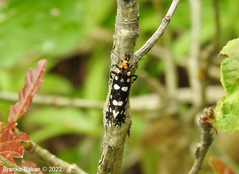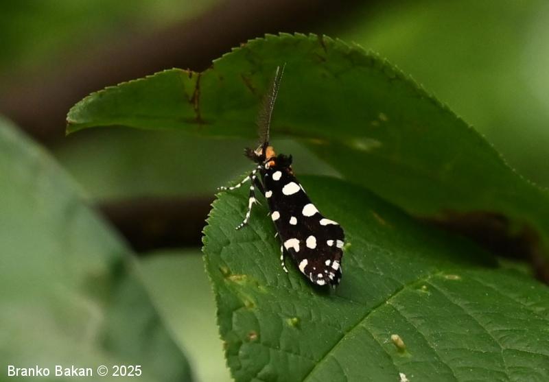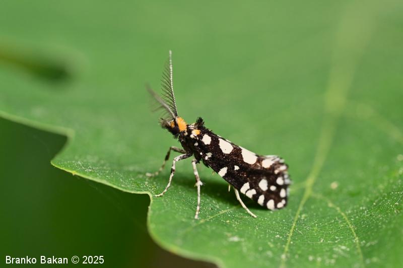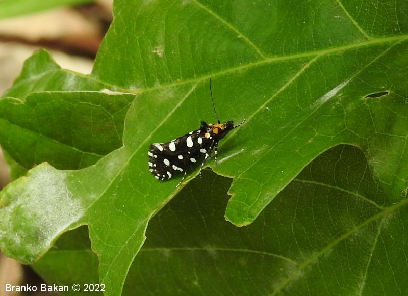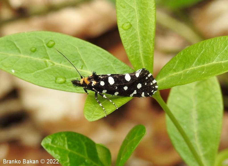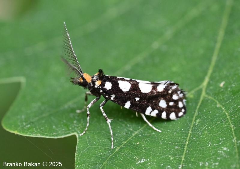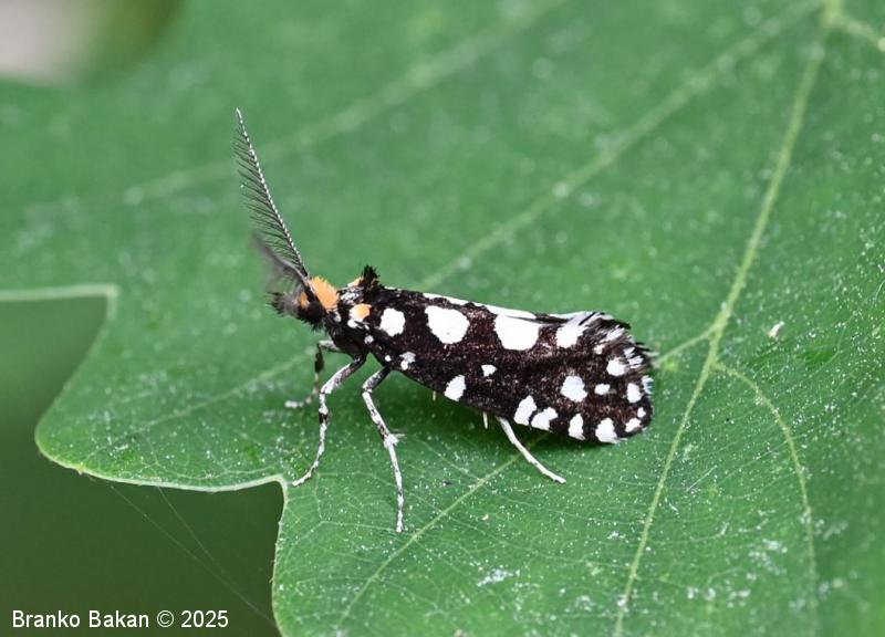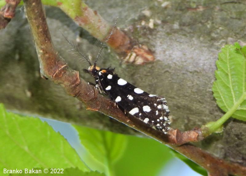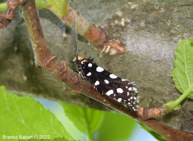 Odrasli osebki: precej veliki in prepoznavni zaradi črnih, belopikčastih kril. V mirovanju so krila strehasto zložena vzdolž telesa, zadnji del sprednjih kril je nekoliko razširjen in privzdignjen, po robu resasto dlakav. Sprednja krila so žametno črna, z belimi pikami in lisami ob zgornjem in spodnjem robu ter z belimi kvadratastimi lisami na zunanjem robu. Bazalna lisa je večinoma rumenkasta, tudi glava je porasla z rumenkastimi dlakami. Tipalnice so pri samcih po obeh straneh glavničaste, pri samicah so nitaste, drobno črno-belo lisaste, na sprednjem delu glave je šop črnih, resastih dlak. Zadnja krila so temno rjavosiva, pri samcih obrobljena s temnimi resicami, pri samicah s svetlimi. Noge so črne z belimi lisami, predvsem zadnje noge imajo trnate izrastke.