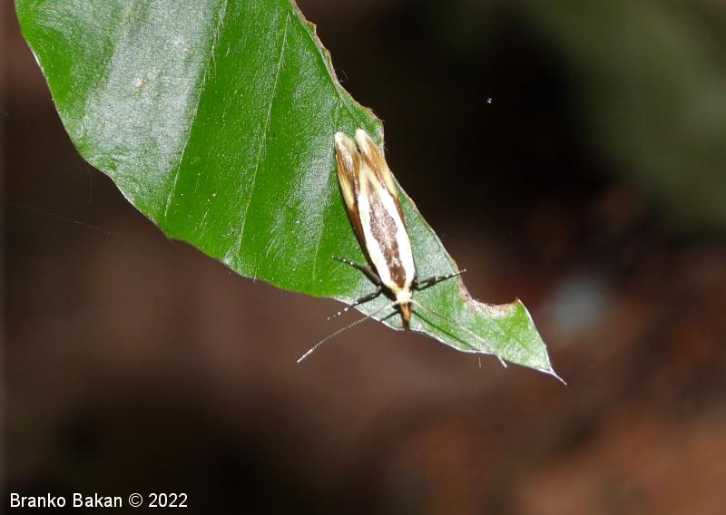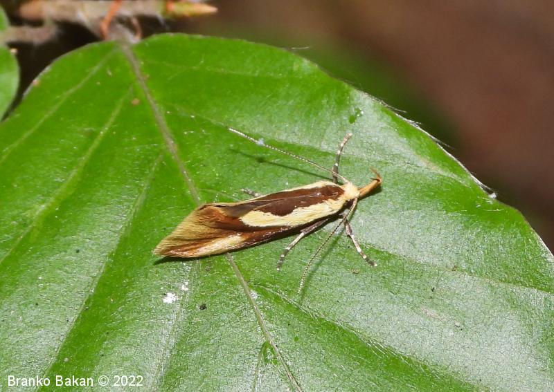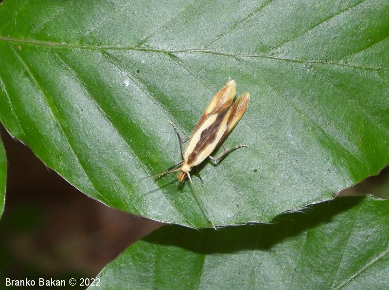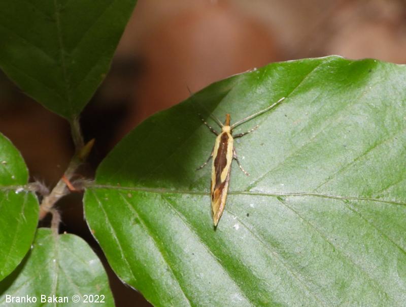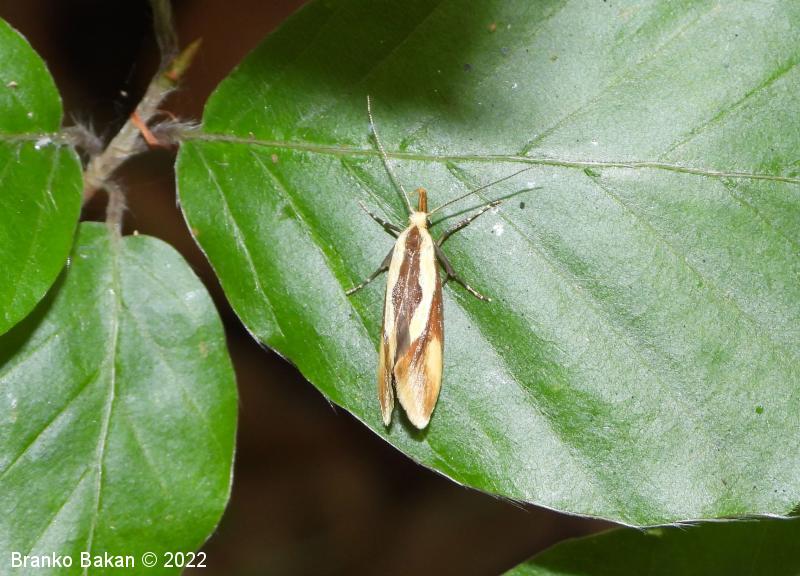 Odrasli osebki: so dokaj prepoznavni. Krila so v mirovanju strehasto zložena vzdolž telesa, na koncu nekoliko razširjena in po robu resasto dlakava. Sprednja krila so po zgornjem delu lisičjerjava, s širokim, rumenkastim pasom, ki je rahlo upognjen proti robu kril, na spodnjem delu so temnorjava, ob konicah pogosto z rumenkasto liso. Zadnja krila so sivkasto rjavkasta, po robu resasto dlakava. Glava in del oprsja sta porasla z rumenkastimi dlakami, tipalčice (palpa) so precej dolge, rumenkaste in navzgor ukrivljene. Tipalnice (antene) so dolge, nitaste, črno-belo pasasto obarvane. Noge so prav tako belo-sivo pasaste.