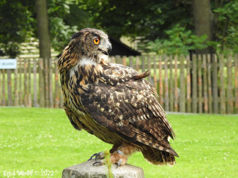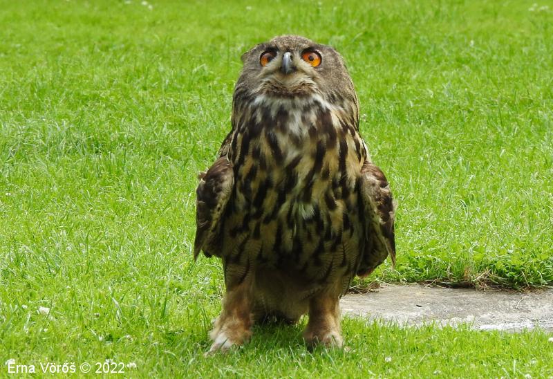 Odrasli osebki: telo je čokato, z debelo, sivorjavo glavo, ki ima velike, temne "ušesne čope" in svetleče, oranžno rumene oči z močno okrepljenimi "obrvmi". Kljun je ukrivljen, krepak in temen, peresa ob kljunu so svetla, zato ustvarjajo bradat videz. Po hrbtu in krilih je temnejše rjavo obarvana s črnimi programi, prsi, trebušna stran in boki so rumenorjavi s temnimi progami. Noge so krepke, a kratke, rumenkaste, z velikimi, temnimi kremplji. Drža telesa je skoraj vedno pokončna, v nevarnosti se široko našopiri in razpre krila v grozeči pozi.