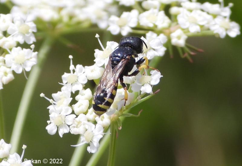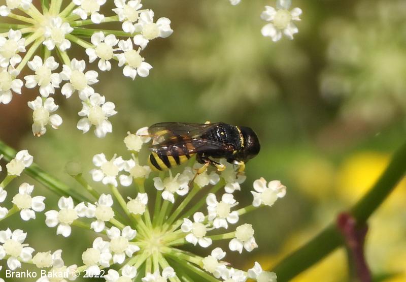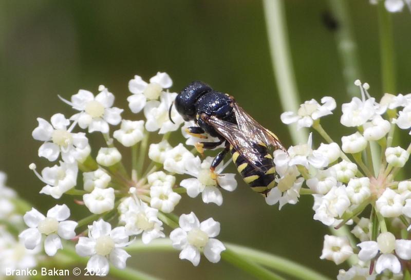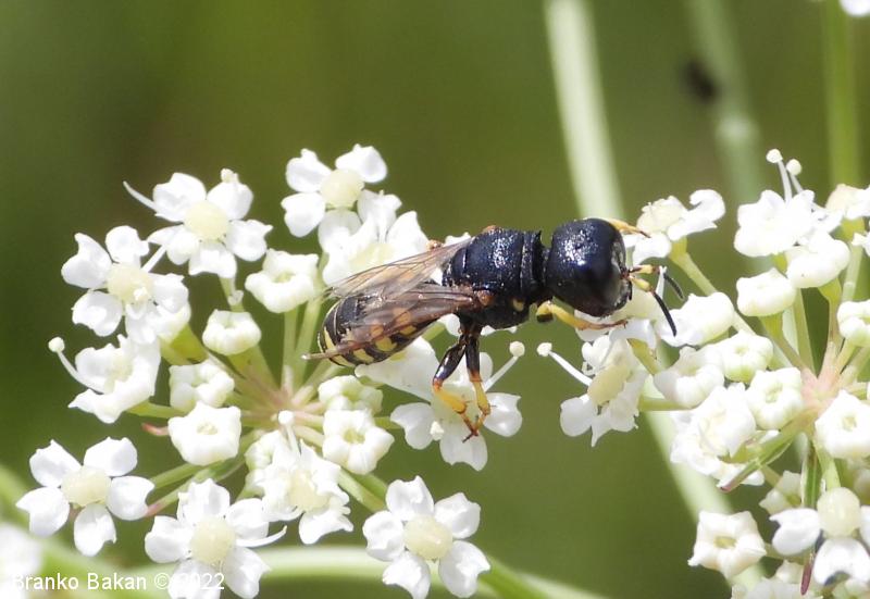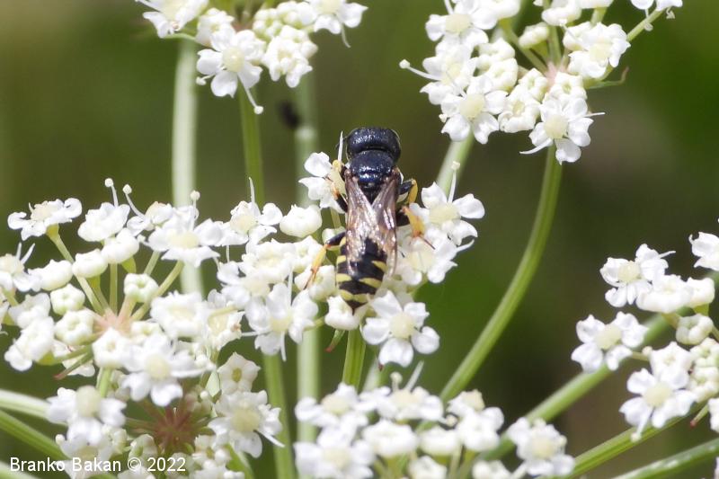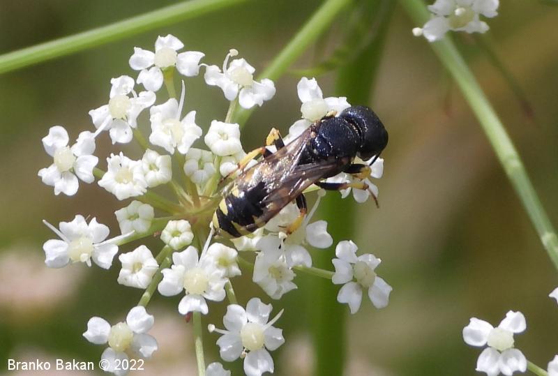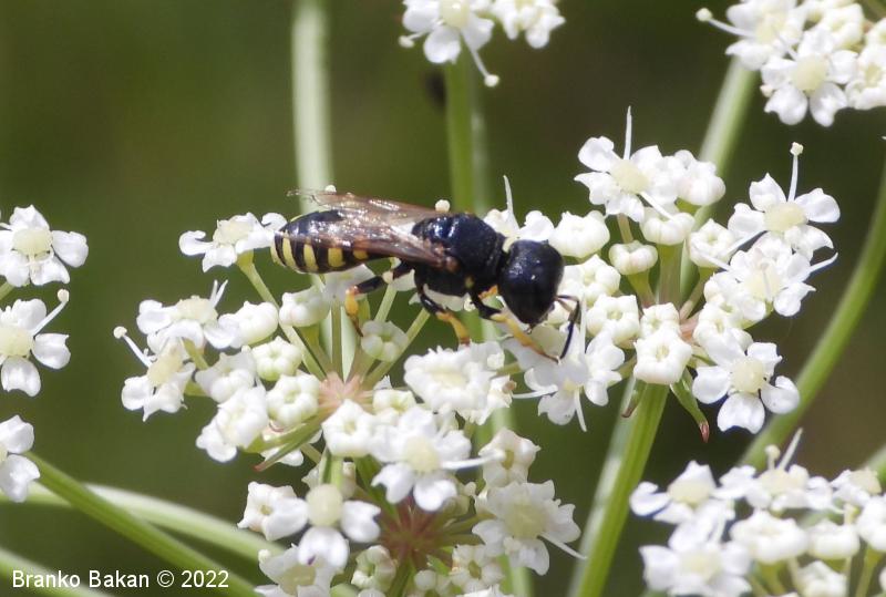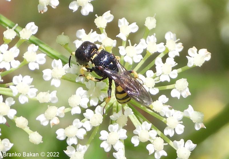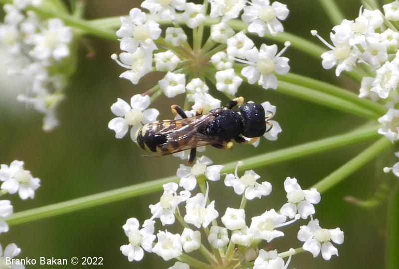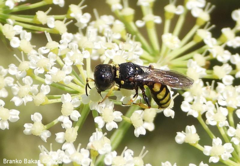 Samica: pretežno črna z rumenimi, prekinjenimi pasovi na zadku. Glava je zelo široka, nekoliko kvadratasta, hrapava, črna, ob velikih očeh z ozko in fino brazdo ter svetlimi dlačicami na frontalnem delu, čeljusti so tanke in ostre. Tipalnice so dokaj kratke, bazalni členek je močno podaljšan, rumen, ostali so drobni in črni. Oprsje je zaokroženo, močno hrapavo, v sprendjem delu rumeno obrobljeno ali brez obrobe, pogosto z rumeno piko ob krilih. Ščitek (scutellum) je polkrožen, črn ali rumen. Krila so rahlo zatemnjena, dobro ožiljena, pritrjališče je rjavo. Zadek je ozko valjast, v sprednjem delu močno zožen, na koncu koničasto upognjen, ob straneh na vsakem segmentu z ozko elipsasto rumeno liso, ki se včasih povezujejo in le redko manjkajo. Noge so rumene, le stegenca in bazalni členki so večinoma bleščeče črni, stopalca so tudi nekoliko temnejša.