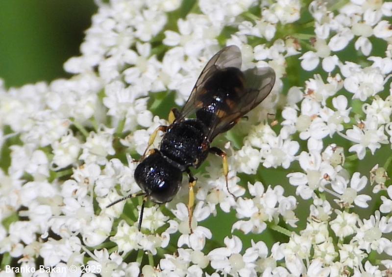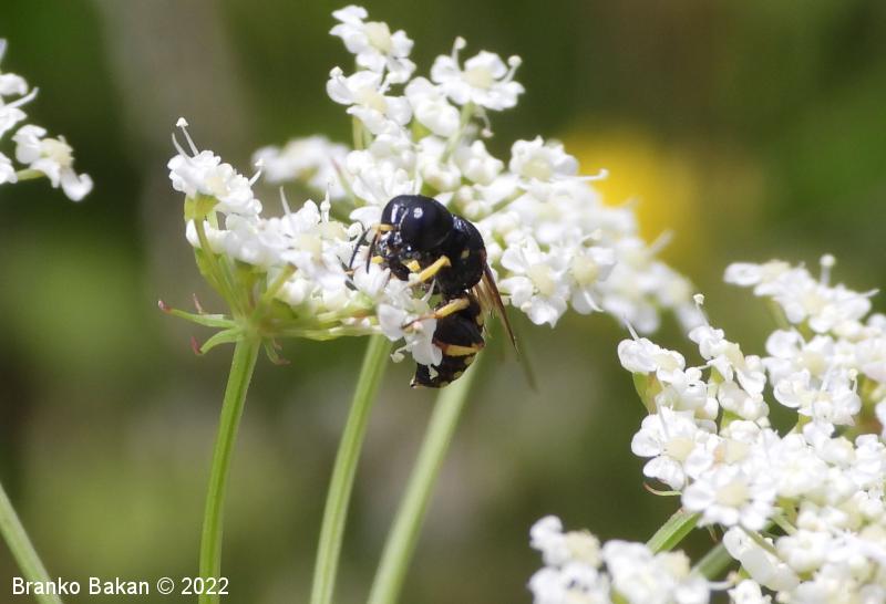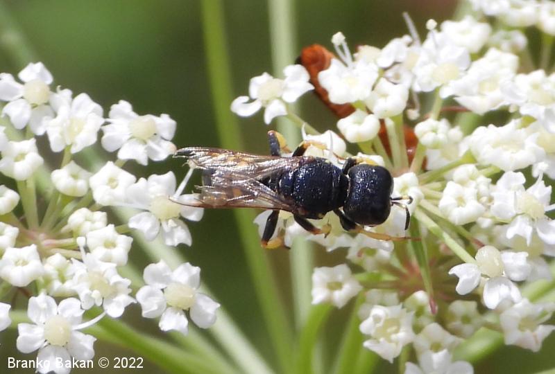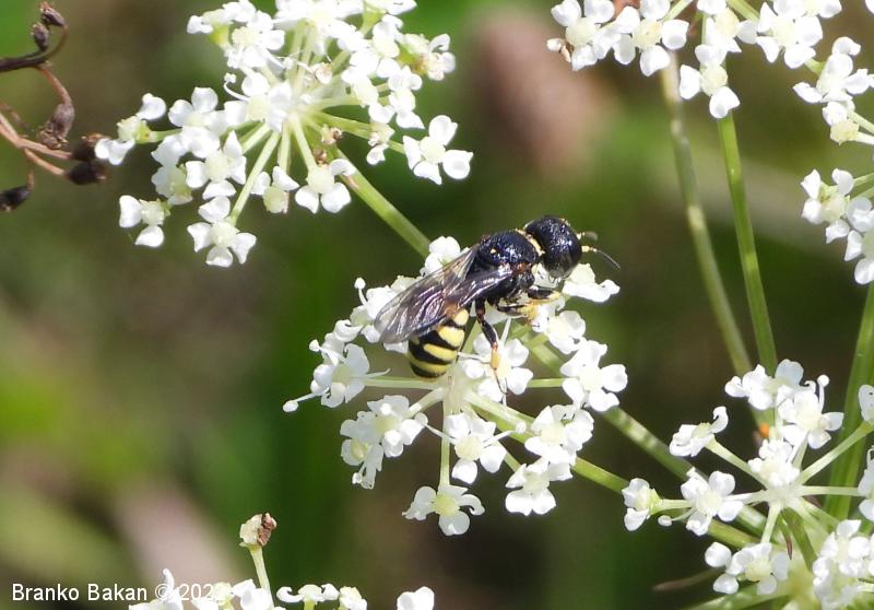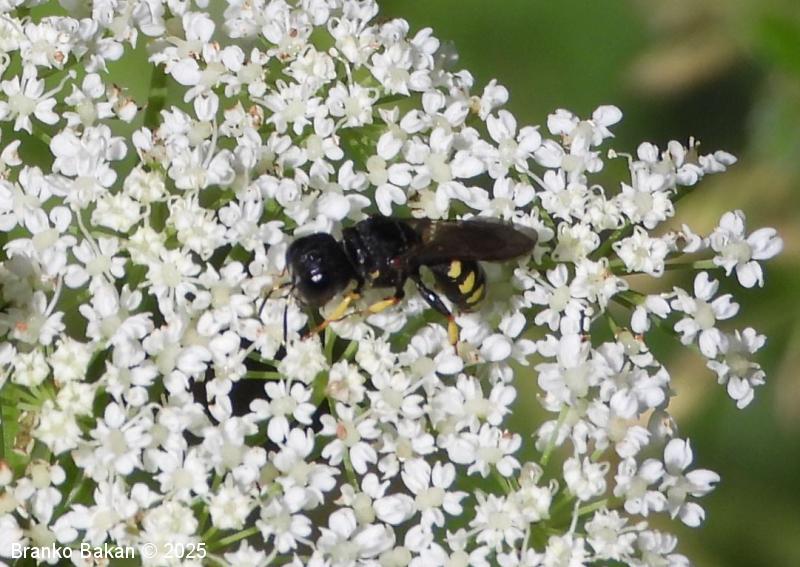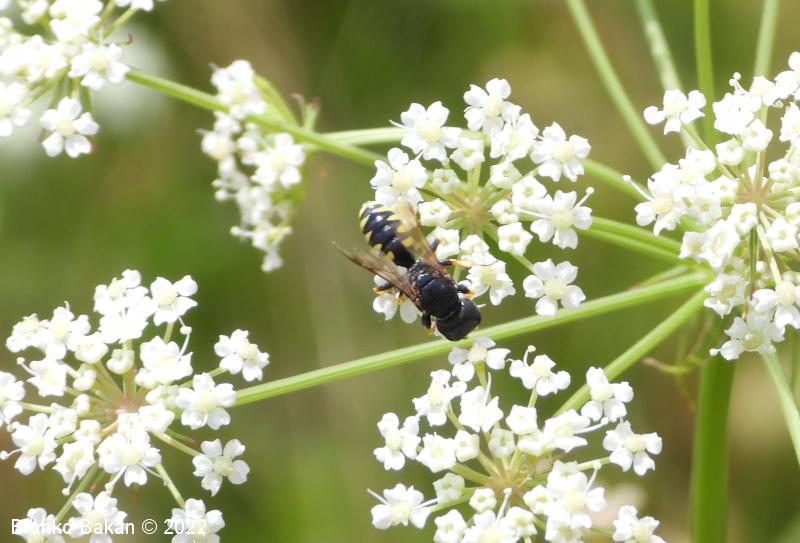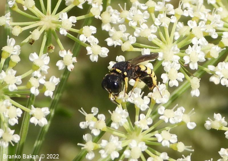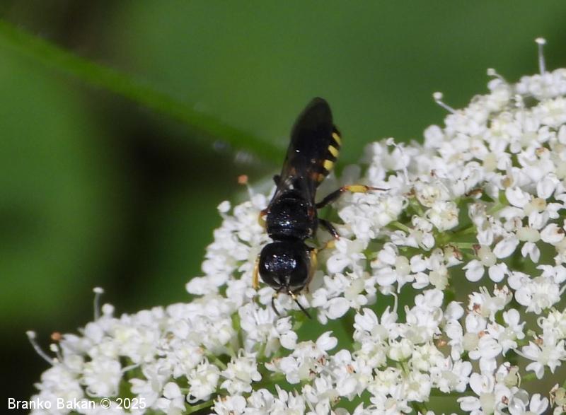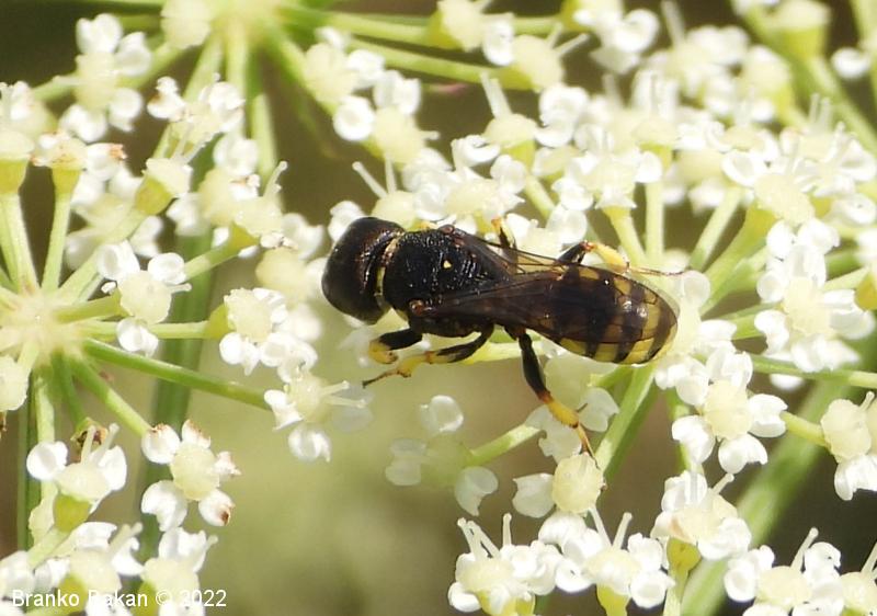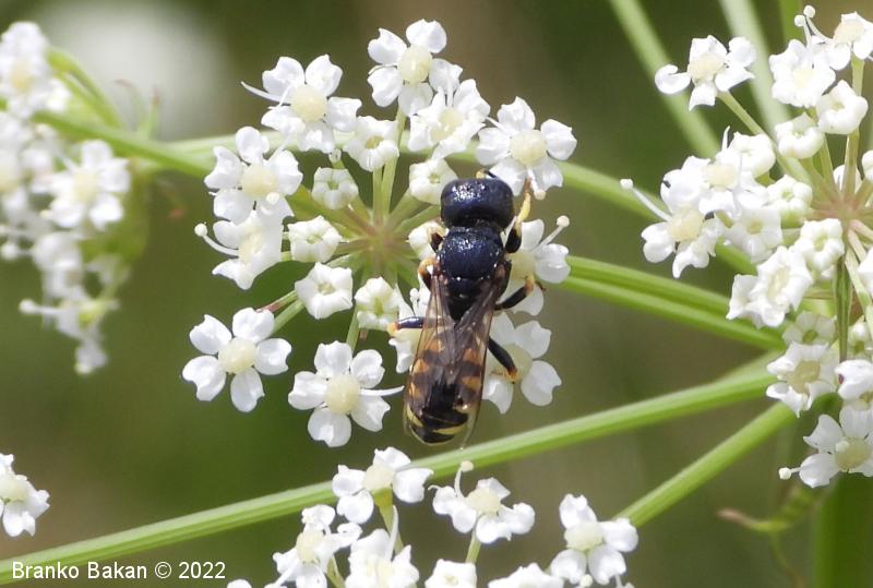 Samica: pretežno črna z rumenimi, prekinjenimi pasovi na zadku. Glava je zelo široka, nekoliko kvadratasta, hrapava, črna, ob velikih očeh z ozko in fino brazdo ter svetlimi dlačicami na frontalnem delu, čeljusti so tanke in ostre. Tipalnice so dokaj kratke, bazalni členek je močno podaljšan, rumen, ostali so drobni in črni. Oprsje je zaokroženo, močno hrapavo, v sprendjem delu rumeno obrobljeno ali brez obrobe, pogosto z rumeno piko ob krilih. Ščitek (scutellum) je polkrožen, črn ali rumen. Krila so rahlo zatemnjena, dobro ožiljena, pritrjališče je rjavo. Zadek je ozko valjast, v sprednjem delu močno zožen, na koncu koničasto upognjen, ob straneh na vsakem segmentu z ozko elipsasto rumeno liso, ki se včasih povezujejo in le redko manjkajo. Noge so rumene, le stegenca in bazalni členki so večinoma bleščeče črni, stopalca so tudi nekoliko temnejša.