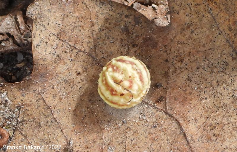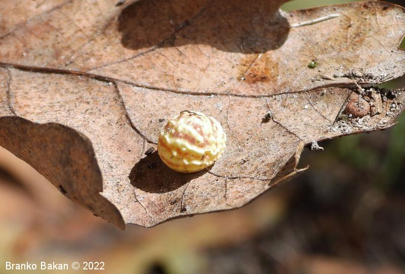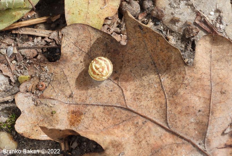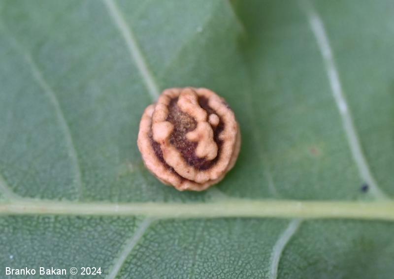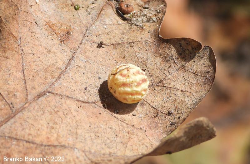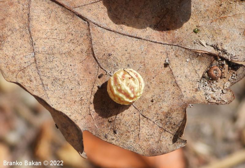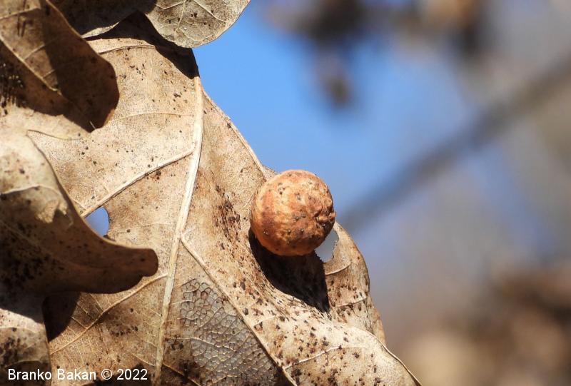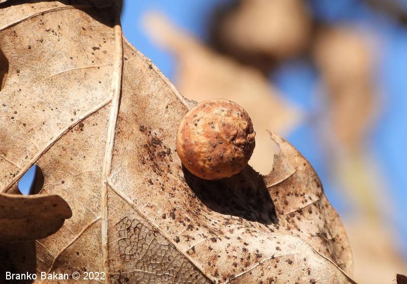 Obnašanje in razvoj: razvojni krog vključuje spolno in nespolno (partenogenetsko) generacijo. Samice spolne generacije se ne parijo in izležejo nekje v začetku poletja že oplojena jajčeca na spodnjo ali redkeje na zgornjo stran listov hrasta doba (Quercus robur), pri čemer se ustvarijo 3-6 mm velike šiške v katerih živi in se razvija ličinka. Šiške so okroglaste, v spodnjem delu ploske, rdečkaste, s prečnimi, nagubanimi in hrapavimi pasovi, precej atraktivne in zelo prepoznavne (spominjajo na plesniva jabolka). Iz ličink se spomladi izleže nespolna (partenogenetska) generacija samic in samcev, ki se parijo. Samice te generacije nato oplojena jajčeca izležejo v popke enakega gostitelja - hrasta doba, ki so okrog 2 mm velike, hruškaste oblike, porasle z dolgimi dlakami. V njih se razvijajo ličinke iz katerih se razvijejo samo samice, ki nadaljujejo partenogenetsko-spolni cikel.