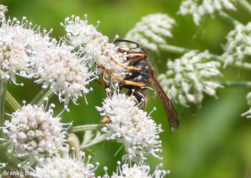 Delavke, samci: telo je precej podolgovato, posebej še zadek. Sprednji del glave je v večji meri rumen, čeljusti so krepke rumene, le notranji rob je ozko črn, čez nadustno ploščo (klipeus) pogosto poteka ozka vzdolžna črna proga, ki je prav tako med tipalnicami. Oči so velike, rjavordeče, rumeno obrobljene. Tipalnice so precej dolge nitaste, bazalni členek je rumen, ostali členki so črni, po spodnji strani črnorjavi. Oprsje je precej veliko, črno, v zgornjem delu z ozkima, rumenima, razvejanima prečnima črtama in s štirimi rumenimi kvadratastimi lisami v spodnjem delu (spodnji lisi sta pogosto rdečerjavi in povezani). Krila so prosojna, nekoliko rjavkasta, ozka. Zadek je precej dolg, črn, z ozkimi rumenimi pasovi, ki se nekoliko razširijo proti konici zadka, pogoste so tudi črne pike in lise, ki se iztezajo iz črnega dela segmentov. Noge so večinoma rumene ali rjavkaste, stegenca in goleni so pogosto tudi delno črna.
