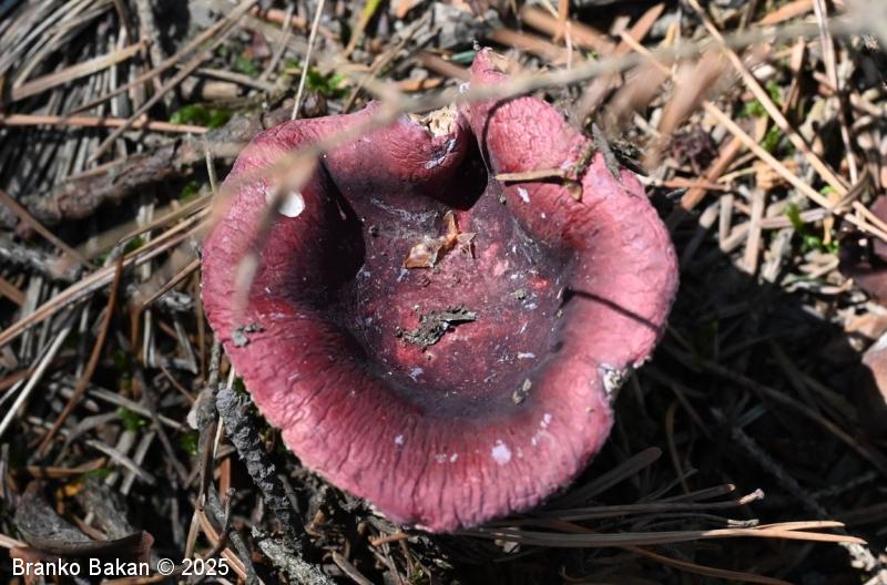 Opis: klobuk je pri mladih trosnjakih polkrožen, kasneje se dežnikasto razpre, pri starejših trosnjakih se precej naguba in je lahko izrazito lijast do pladnjast, v sredini pogosto udrt, brez grbice. Povrhnjica klobuka je zelo temna, škrlatno- do vinskordeča, v sredini skoraj črnikasta, gladka, bleščeča, proti robu je navadno svetlejša. Spodnja stran klobuka (trosovnica) je sestavljena iz gostih, belih, trdih lističev, ki s staranjem nekoliko porumenijo. Bet je krepak, bel (brez rdečkastih ali drugih barv), s staranjem postane gobast. Meso je belo, čvrsto, z rahlim vonjem po sadju in je rahlo pekoče.