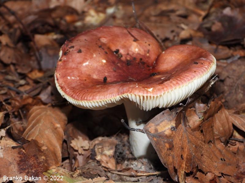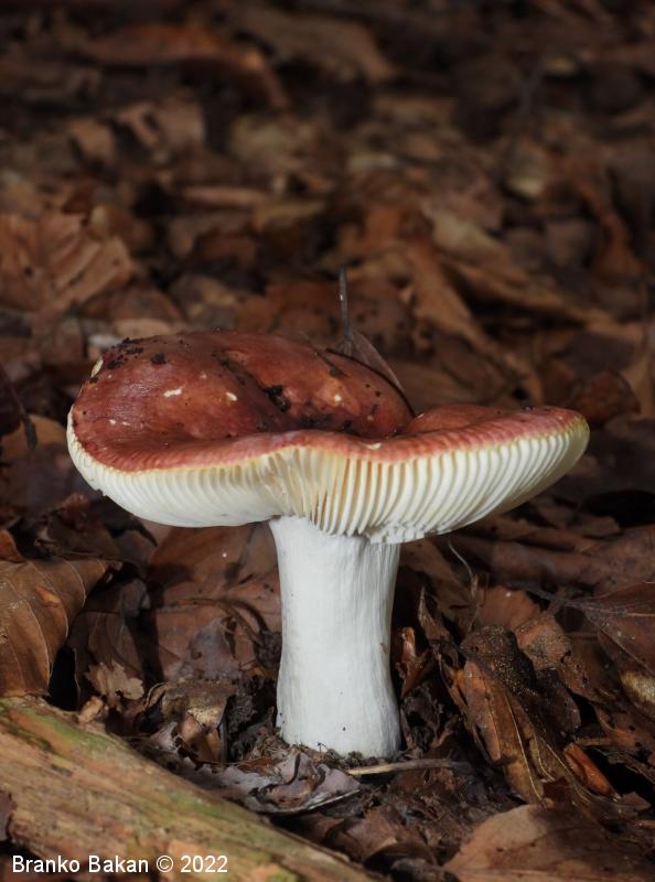 Opis: pri mladih trosnjakih je klobuk polobel do diskast, pogosto z udrtim osredjem in spodvihanim robom, kasneje se razpre in pogosto tudi navzgor uviha, valovit, ob robovih žlebast. Povrhnjica je večinoma vinsko rdeča ali rjavkasto rdeča (opečnata), odlupi se lahko nekje do 2/3 širine klobuka. Spodnja stran klobuka (trosovnica) je gosto porasla z belimi, togimi lističi, ki sčasoma postanejo rahlo kremasti do rumenkasti. Bet je valjast, bel, pri dnišču pogosto rdečkasto ali rožnato nadahnjen, večinoma raven do rahlo upognjen, s staranjem postane spužvast. Meso je belo, lomljivo, brez izrazitega vonja.