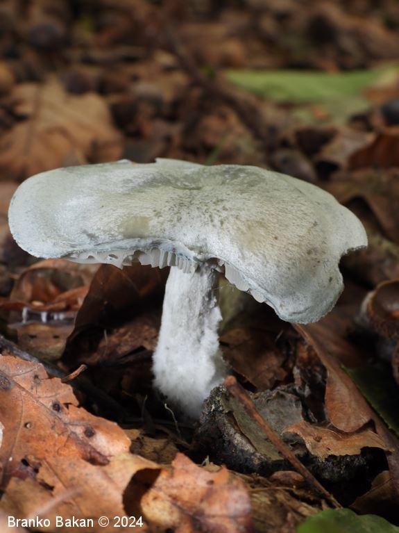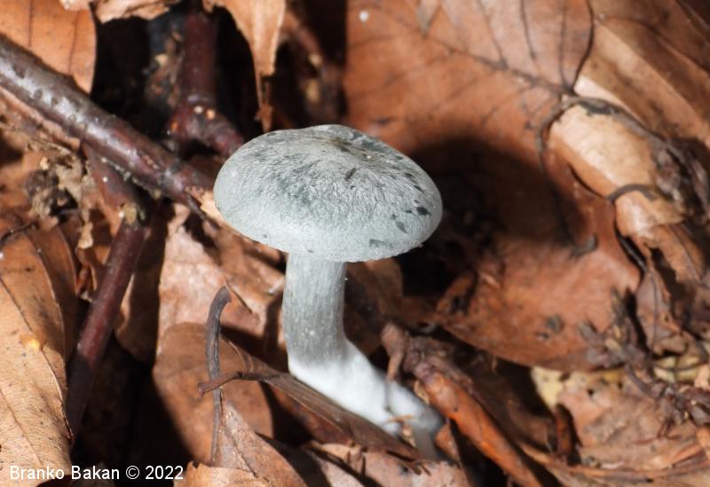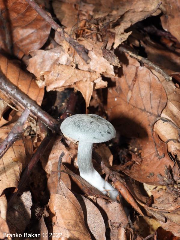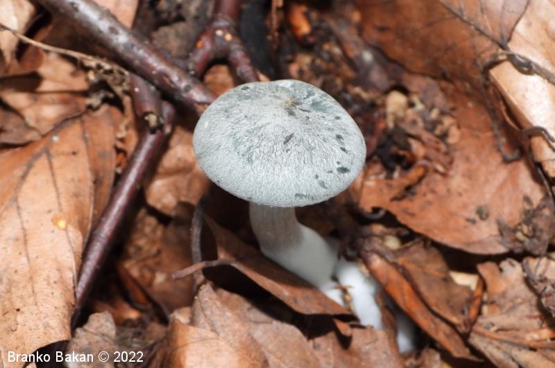 Opis: prepoznamo jo po zelenkastomodri obarvanosti. Pri mladih trosnjakih je klobuk polobel do dežnikast, kasneje se široko razpre in rahlo usloči oz. udre (nima značilne lijakaste oblike). Povrhnjica je sivkasto- do zelenkastomodra, včasih vlaknasta, sicer gladka. Spodnja stran klobuka (trosovnica) je gosto porasla z lističi, ki so svetlejši od klobuka, pri mlajših gobah rahlo modrikasti, priraščajo se na vrh beta. Bet je tanek, pecljat, pogosto ukrivljen, zelenkasto moder, v spodnjem delu gosto opreden.