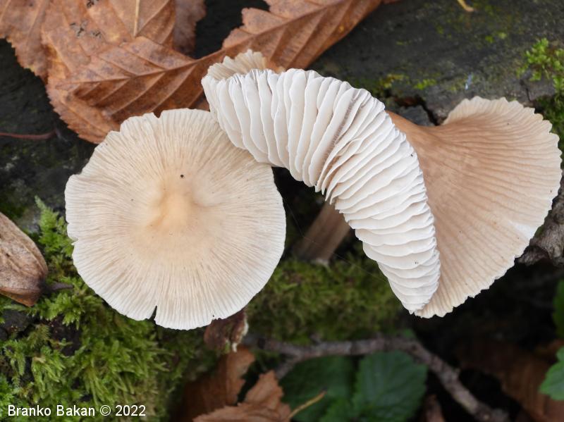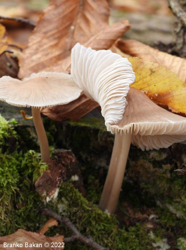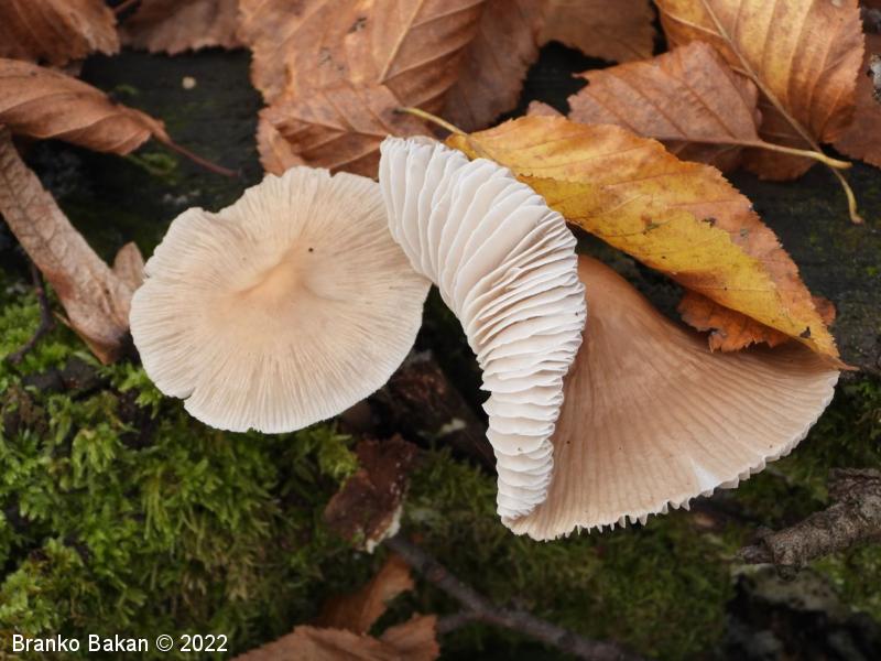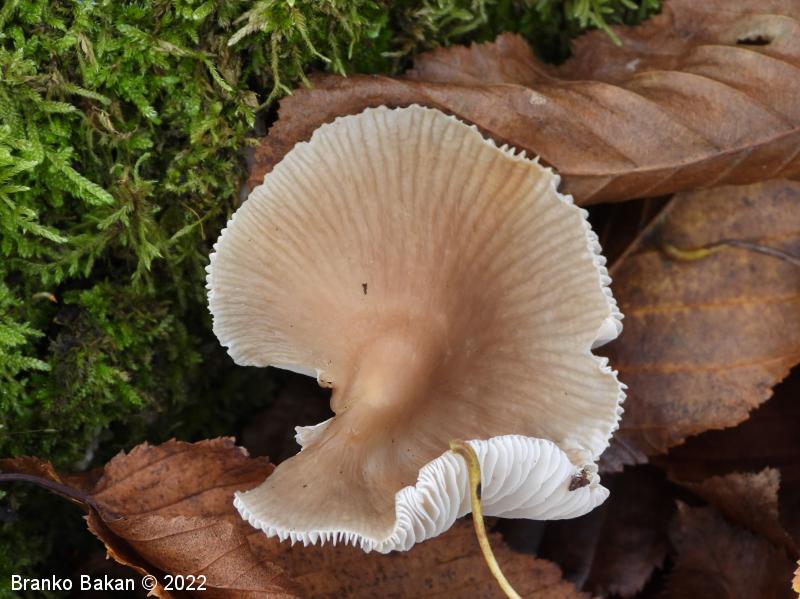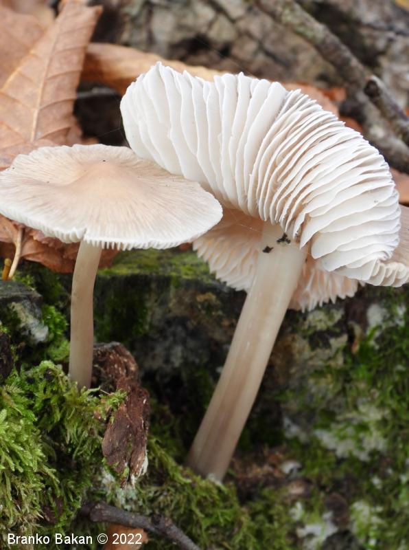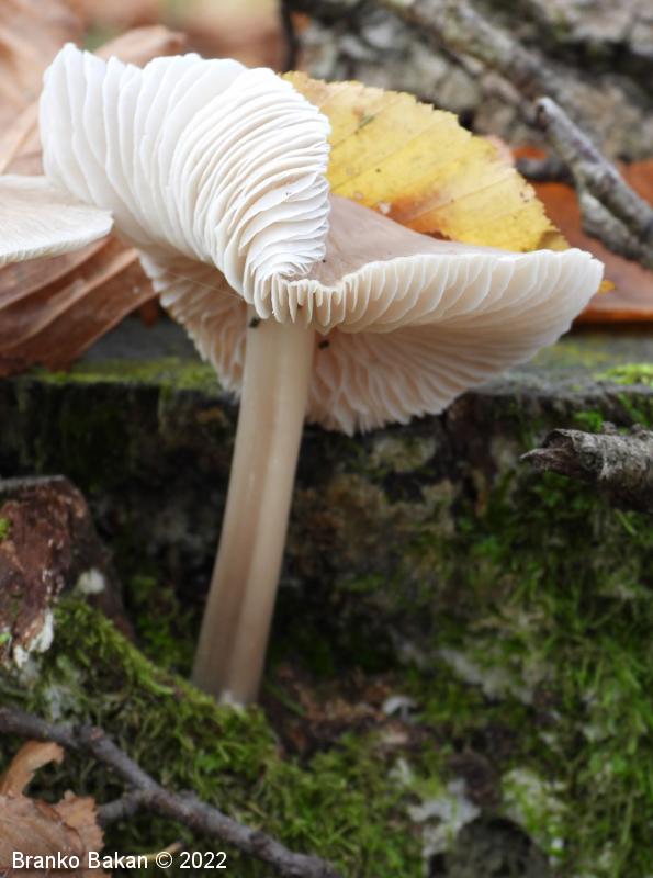Opis: mladi trosnjaki imajo koničasto stožčast, zvonast do dežnikast klobuk, ki se kasneje široko razpre in pogosto uviha navzgor, na sredini je koničast, sivkast do bledo rjavkast ali mesnat, gladek, ob robovih rahlo naguban in žlebast. Spodnja stran klobuka (trosovnica) je na redko porasla s širokimi, pogosto neenako velikimi lističi, ki so sprva belkasti, kasneje rahlo rožnati do bledo rjavkasti, z izrazitimi gubicami pri dnu. Bet je tanek, najprej belkast, kasneje bledo rjavkast, v spodnjem delu rahlo temnejši, večinoma raven do rahlo upognjen. Meso je rjavkasto, z vonjem po moki.