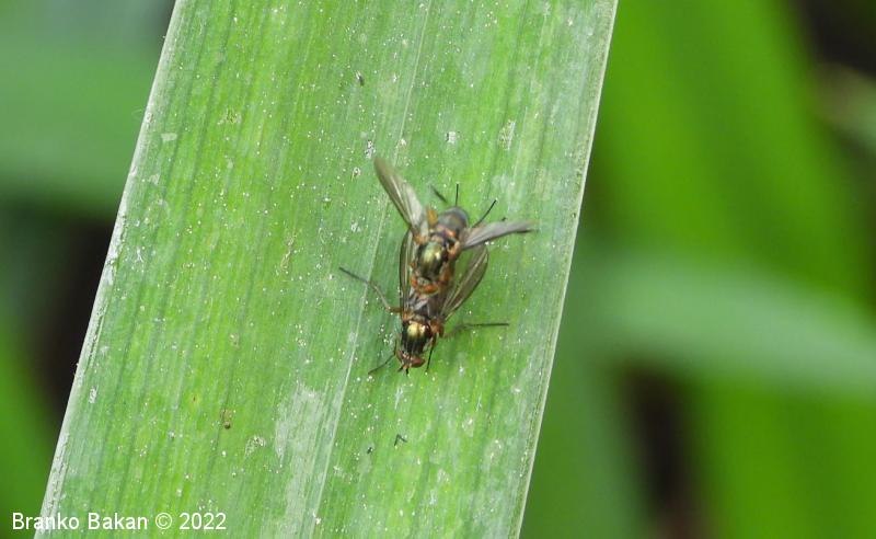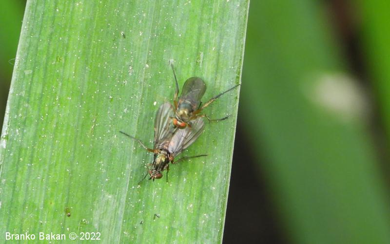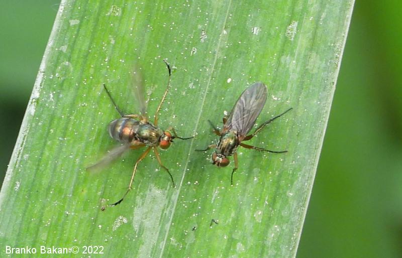 Samec: glava je dokaj široka, svetla, z velikimi, zelenordečimi očmi, ki so rahlo zbližane. Tipalnice so betičaste, črne, z daljšimi nitastimi izrastki (ariste). Oprsje je kovinsko bleščeče zeleno, s sivkastimi, pogosto neizrazitimi in zaprašenimi pasovi, poraslo z dolgimi, togimi ščetinami. Krila so prosojna, podolgasto jajčasta, s temnimi žilami. Zadek je podolgast, koničast (pri večini podobnih vrst je na koncu spodvihan, s kompleksnim spolnim aparatom), kovinsko zelen po zgornji strani, pepelasto sivkast po spodnji, ob robovih segmentov porasel z nekoliko daljšimi ščetinami, sicer kratkodlakav. Noge so vitke in zelo dolge (še posebej goleni in členki stopalc zadnjih nog), porasle s togimi ščetinami, rumenkaste, le stopalca (tarzi) so črna, stopalca srednjih nog so porasla s širokimi, črnimi, enostranskimi pernatimi krpicami.
